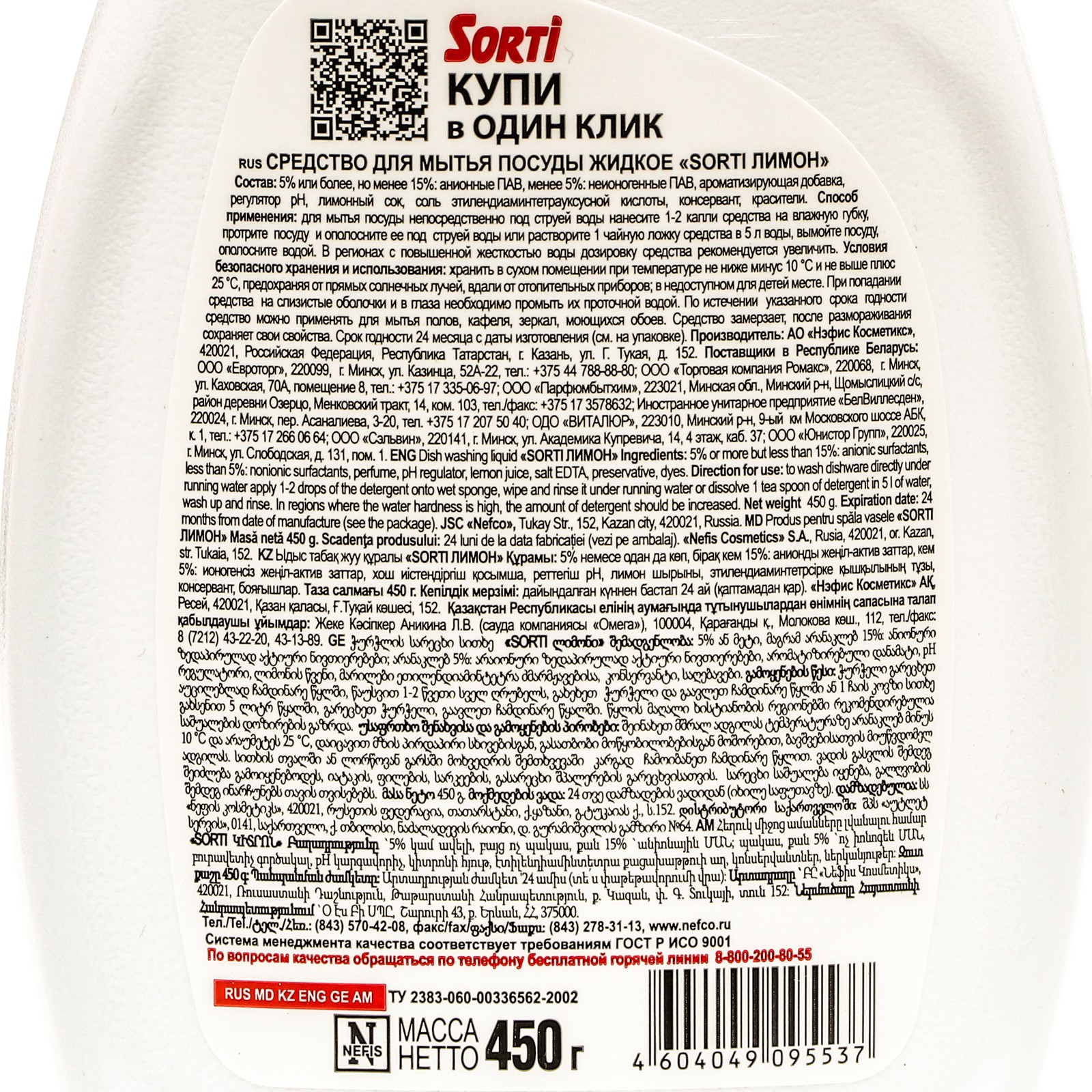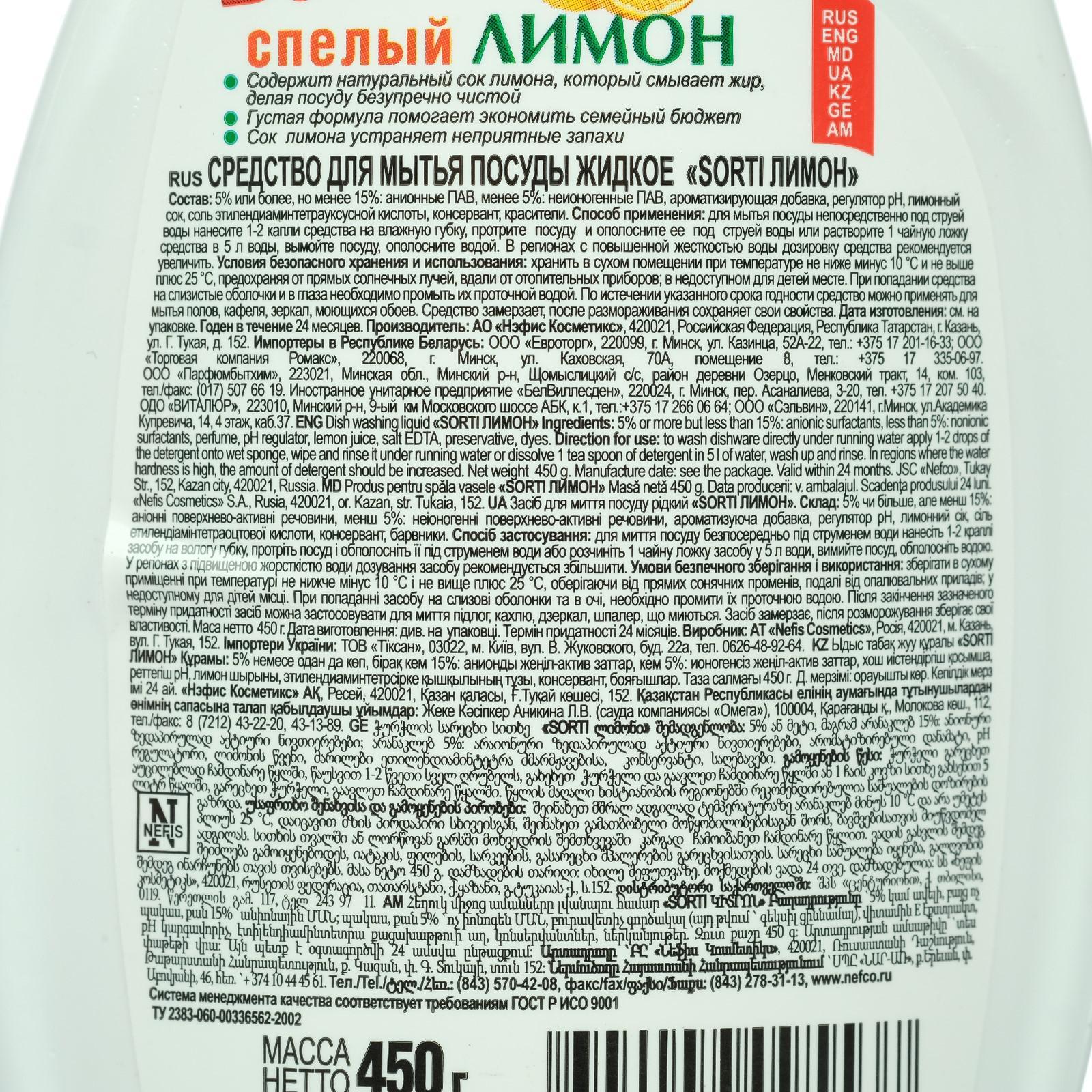Средство для мытья посуды sorti "спелый лимон", 450 мл. Средство для мытья посуды Sorti "Спелый лимон", 450 мл -Содержит натуральный сок лимона, который активно борется с жиром, делая посуду безупречно чистой -Густая формула помогает экономить семейный бюджет -Сок лимона помогает устранить неприятные запахи Способ применения:Для мытья посуды непостредственно под струей воды нанесите 1-2 капли средства на влажную губку, протрите посуду и ополосните ее под струей воды или растворите 1 чайную ложку средства в 5 л воды, вымойте посуду, ополосните водой. Состав:5% или более, но менее 15%: анионные ПАВ; менее 5%: неионогенные ПАВ, ароматизирующая добавка, регулятор рН, лимонный сок, соль этилендиаминтетрауксусной кислоты, консервант, красители Меры предосторожности: Использовать средство только по назначению. Хранить в недоступном для детей месте. Хранить вдали от пищевых продуктов. Хранить с закрытой крышкой. Хранить в сухом, прохладном и темном месте. Условия хранения: Хранить в сухом помещении при температуре не ниже минус 10 0С и не выше плюс 25 0С, предохраняя от прямых солнечных лучей, вдали от отопительных приборов; в недоступном для детей месте. При попадании средства на слизистые оболочки и в глаза необходимо промыть их проточной водой. По истечении указанного срока годности средство можно применять для мытья полов, кафеля, зеркал, моющихся обоев. Средство замерзает, после размораживания сохраняет свои свойства. Вес, г/Объём, мл: 450 Вид: Гель  развернуть описание ▼
