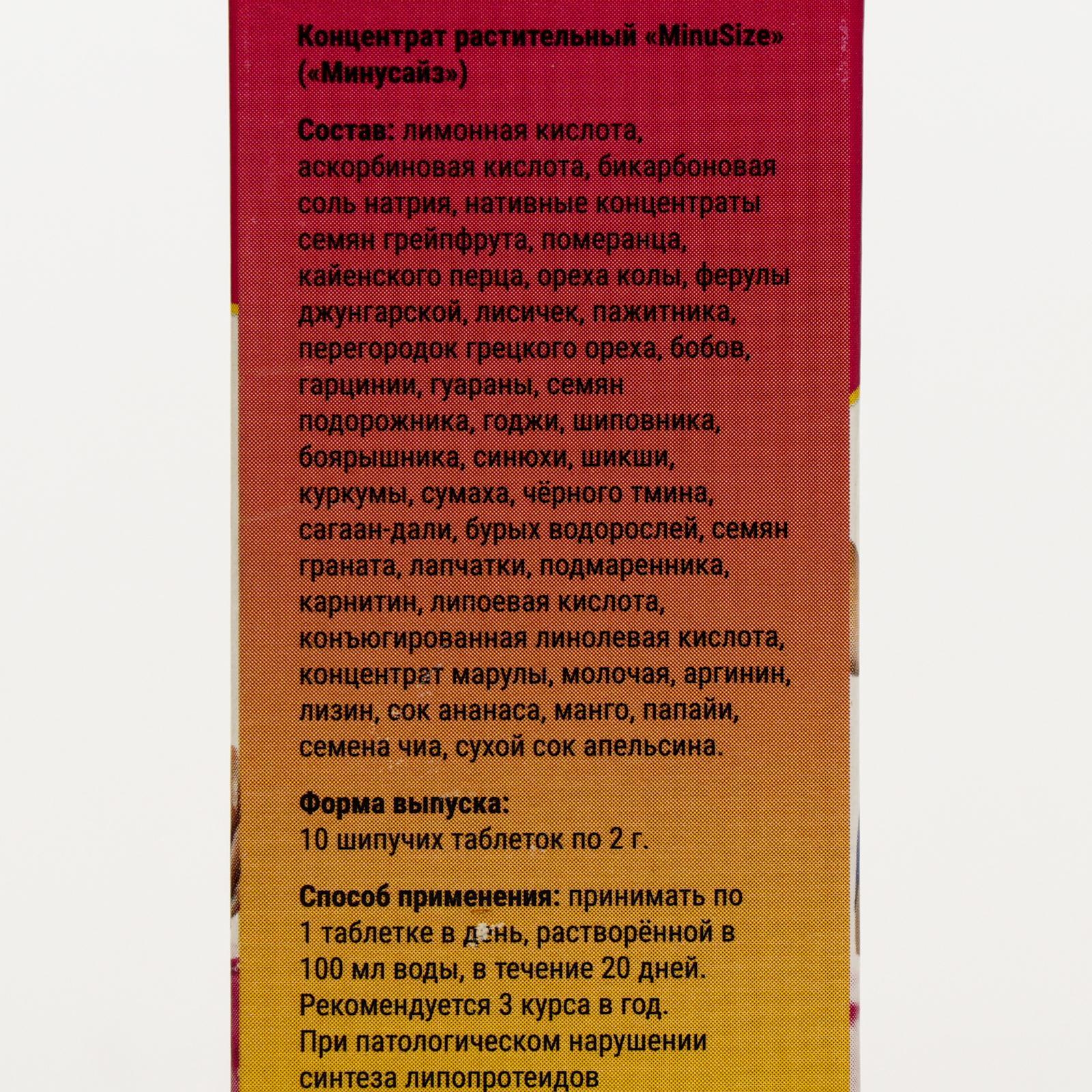 Таблетки шипучие minusize, для похудения, 10 шт.. MinuSize — натуральная органическая формула в биодоступной быстрорастворимой форме на основе концентратов активных частей растений, направленных на нормализацию гипоталамических процессов контроля массы тела и выработки энергии, активизацию процессов растворения адипоцитов (жировых клеток) в течение дня, регуляцию липидного и углеводного обмена при повышенном образовании подкожной жировой ткани и жировых клеток скелетной мускулатуры. Органическая формула обладает быстрым проникновением в кровь и многоплановым действием на сигнальные механизмы контроля массы тела в гипоталамической области, ферментативные и моторные функции органов пищеварительной системы, дренажные функции системы кровообращения и лимфы, способствует: повышению энергетического обмена клетки и растворению жировой ткани в течение дня; регуляции пищеварительных ферментов и предотвращению образования жировых клеток; повышению активности ферментов печени и нормализации липидного, углеводного обмена при поступлении пищи в течение дня; улучшению состава микрофлоры кишечника и оптимизации процессов усвоения питательных веществ, витаминов, кальция; нормализации иммунных реакций; повышению активности центров удовольствия головного мозга и устранению аппетита; улучшению дренажных процессов лимфы, предотвращению симптомов целлюлита. Способ применения: принимать по 1 таблетке в день, растворённой в 100 мл воды, за 30 минут до еды в течение 20 дней (2 упаковки на 1 курс). Рекомендуется 3 курса в год. При патологическом нарушении синтеза липопротеидов рекомендуется курс в течение 90 дней: по 20 дней ежедневного приёма с курсом ограничения приёма в течение 5 дней Состав: лимонная кислота, аскорбиновая кислота, бикарбоновая соль натрия, нативные концентраты семян грейпфрута, померанца, кайенского перца, ореха колы, ферулы джунгарской, лисичек, пажитника, перегородок грецкого ореха, бобов, гарцинии, гуараны, семян подорожника, годжи, шиповника, боярышника, синюхи, шикши, куркумы, сумаха, чёрного тмина, сагаан-дали, бурых водорослей, семян граната, лапчатки, подмаренника, карнитин, липоевая кислота, конъюгированная линолевая кислота, концентрат марулы, молочая, аргинин, лизин, сок ананаса, манго, папайи, семена чиа, сухой сок апельсина. Противопоказания: индивидуальная непереносимость компонентов. В упаковке, шт.: 10 Вес, г/Объём, мл: 20 Вид: Витаминные комплексы Температурное ограничение: Нет Назначение: Для похудения Форма выпуска: Таблетки Действующие вещества: Аскорбиновая кислота Показания: Избыточный вес Компоненты: Боярышник Компоненты: Шиповник Компоненты: Ягоды годжи Компоненты: Экстракт подорожника Компоненты: Лисичка Действие: Похудение  развернуть описание ▼