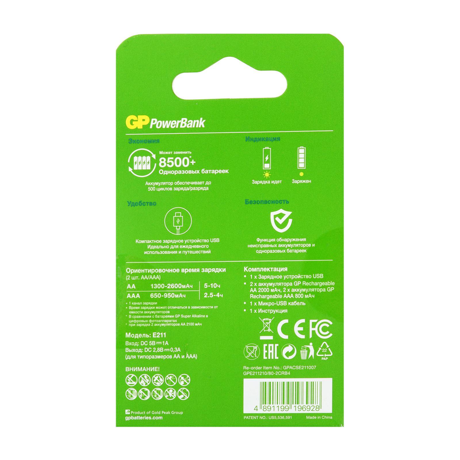 Зарядное устройство gp e211 + 4 аккумулятора aa/aaa 2100/800 мач, белое. Зарядное устройство GP PowerBank U411 имеет 4 порта для пополнения ресурса никель-металлгидридных элементов питания типов AA и AAA. Модель оснащена 2 каналами для зарядки. В комплекте поставки предусмотрено 4 перезаряжаемых аккумулятора типа AA емкостью 2100 мАч. Они предназначены для использования с часами, камерами, фонариками и другими цифровыми приборами. Питание зарядного устройства GP PowerBank U411 осуществляется через кабель от USB-порта. Световой индикатор и таймер безопасности обеспечивают простоту использования модели. Гарантийный срок, мес.: 12 Ёмкость аккумулятора, mAh: 800 Ёмкость аккумулятора, mAh: 2100 Типоразмер батареек: AAA (LR03) Типоразмер батареек: AA (LR6) Температурное ограничение: Нет  развернуть описание ▼