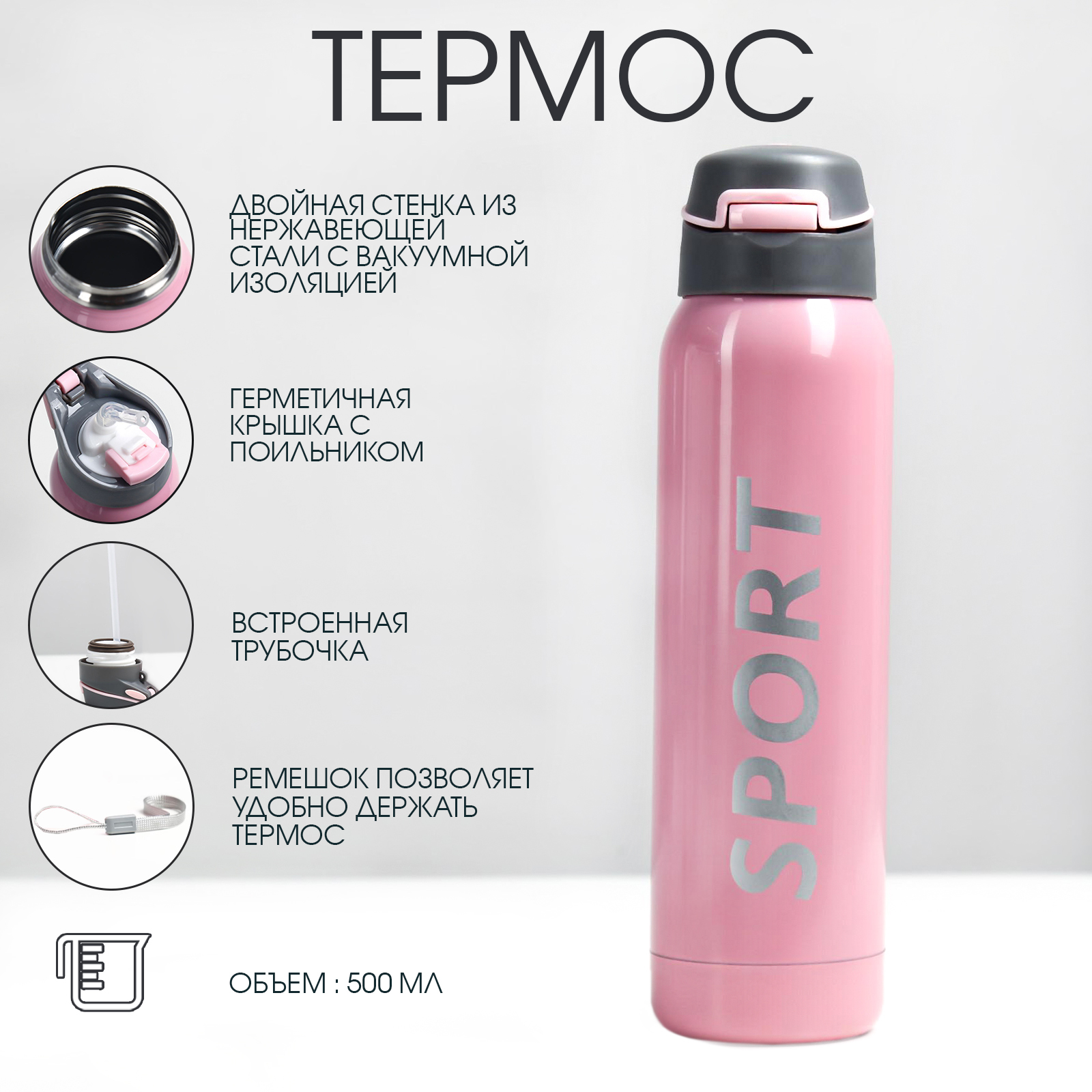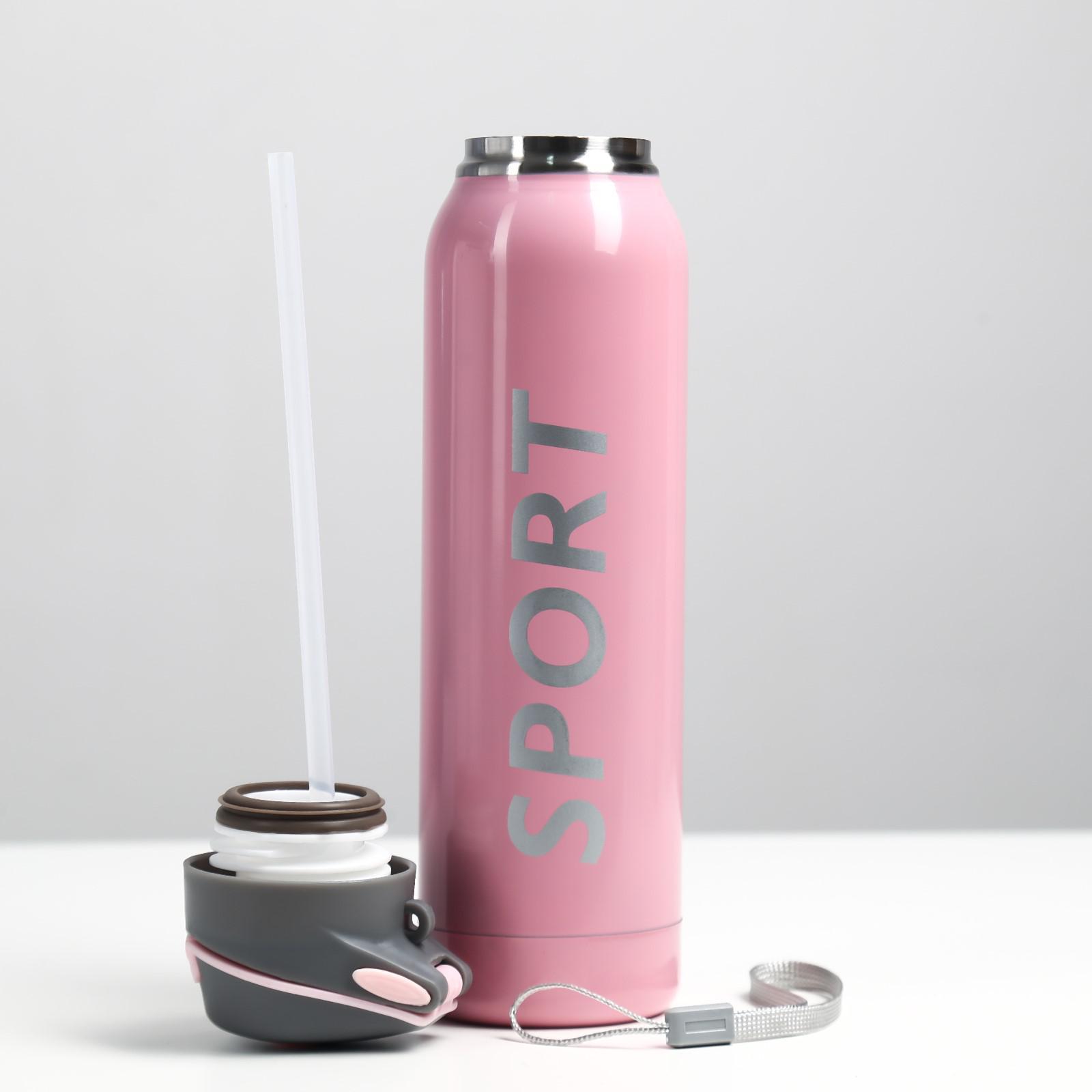 Термос, 500 мл, спорт, 5.5 х 23 см, с трубочкой, розовый