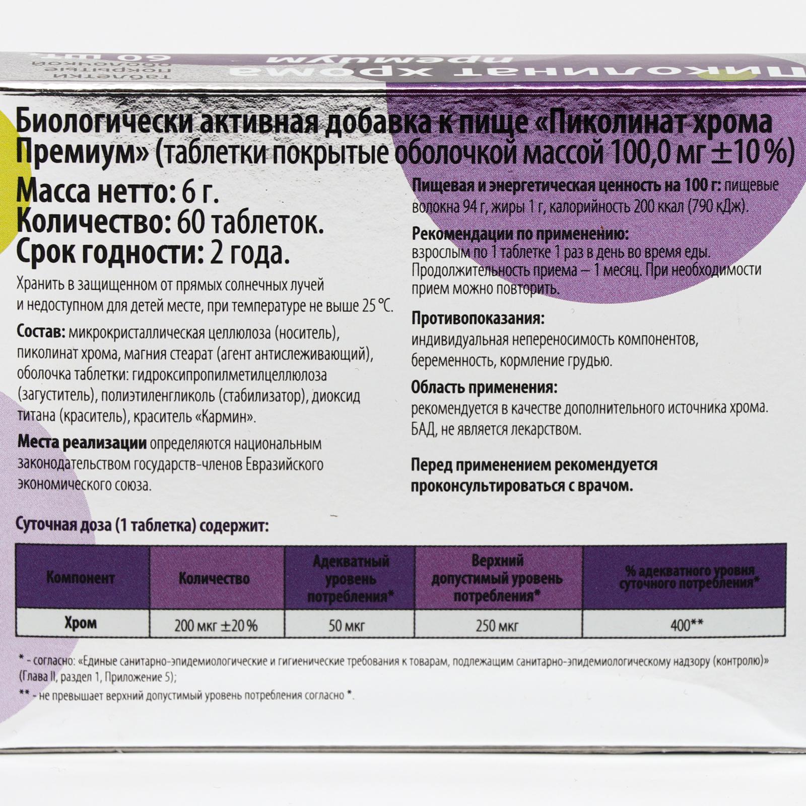 Пиколинат хрома премиум, 60 таблеток. «Пиколинат хрома Премиум» — это БАД к пище, рекомендуется в качестве дополнительного источника хрома. Рекомендации по применению: взрослым по 1 таблетке 1 раз в день во время еды. Продолжительность приема – 1 месяц. При необходимости прием можно повторить. Избыточный вес — одна из самых животрепещущих тем для обсуждения, причем не только среди женщин, но и среди представителей мужского пола. Для снижения веса важен грамотный комплексный подход, который включает в себя сбалансированное питание, регулярные физические нагрузки, соблюдение режима сна и отдыха, а также прием необходимых биологически активных веществ. «Пиколинат хрома Премиум» — биологически активная добавка к пище, которая станет отличным помощником на пути к идеальному телу. Хром — довольно распространенный химический элемент. Пиколинат — это органическая форма, обеспечивающая максимальную биодоступность хрома для организма. Важнейшая биологическая роль хрома заключается в его участии в процессах синтеза жиров и обмена углеводов. Вместе с инсулином хром действует как регулятор уровня сахара в крови, обеспечивает нормальную активность инсулина. Дополнительный прием хрома используется для повышения чувствительности к инсулину при нарушении углеводного обмена. Одной из причин тяги к сладкому является дефицит хрома, причем чем больше человек употребляет сахаросодержащих продуктов, тем сильнее снижается уровень хрома — возникает своеобразный замкнутый круг. Хром позволяет легче придерживаться низкоуглеводного питания за счет уменьшения тяги к сладкому, а также помогает ускорить обмен веществ. При физических нагрузках хром помогает увеличить расход калорий, что облегчает процесс похудения. Вес, г/Объём, мл: 6 В упаковке, шт.: 60 Вид: Витаминные комплексы Температурное ограничение: Нет Назначение: Для похудения Форма выпуска: Таблетки Честный знак: Да Микроэлементы: Cr (хром) Показания: Избыточный вес Действие: Похудение  развернуть описание ▼
