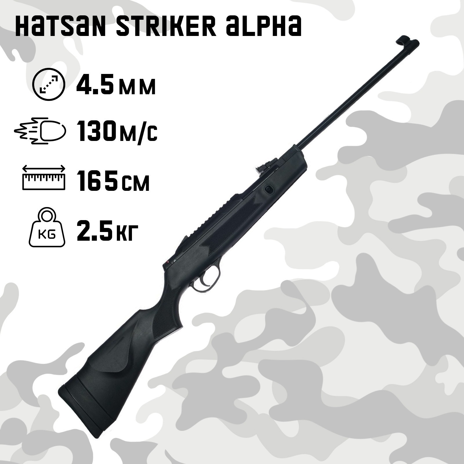 Винтовка пневматическая "hatsan striker alpha" кал. 4.5 мм, 3 дж, ложе - пласт., до 130 м/с. Винтовка Hatsan Striker Alpha – она прекрасно подойдет как любителю, так и опытному мастеру стрельбы. Особенности: Изделие имеет удобный вес, благодаря использованию в конструкции сверхпрочного пластика и каучуковых вставок. Планка Weaver позволяет осуществить установку мощной оптики для большей эффективности стрельбы. Изделие оборудовано предохранителем автоматического типа, способным предотвратить случайный выстрел. Затыльник из резины помогает уменьшить вибрацию во время выстрела, а также снизить эффект отдачи. Ствол турецкой продукции нарезной, изготовленный из оружейной стали превосходного качества. Нарезы на внутренней части ствола создают вращение для пули при стрельбе, чем значительно увеличивают ее скорость, кучность и меткость попадания. Материал сохраняет свои качественные характеристики в условиях любой погоды, обеспечивая максимальную долговечность всей конструкции. Вместимость магазина: 1 Скорость полёта пули, м/с: 130 Вид снаряда: Пули Калибр: 4.5 мм Температурное ограничение: Нет Тип работы: Пружинно-поршневой Режим стрельбы: Одиночный Источник энергии: Пружина, взведение «переламыванием» ствола Крепление для оптического прицела: Да Тип крепления прицела: Планка Вивера/Пикатини Тип крепления прицела: Ласточкин хвост Подствольная планка: Нет  развернуть описание ▼