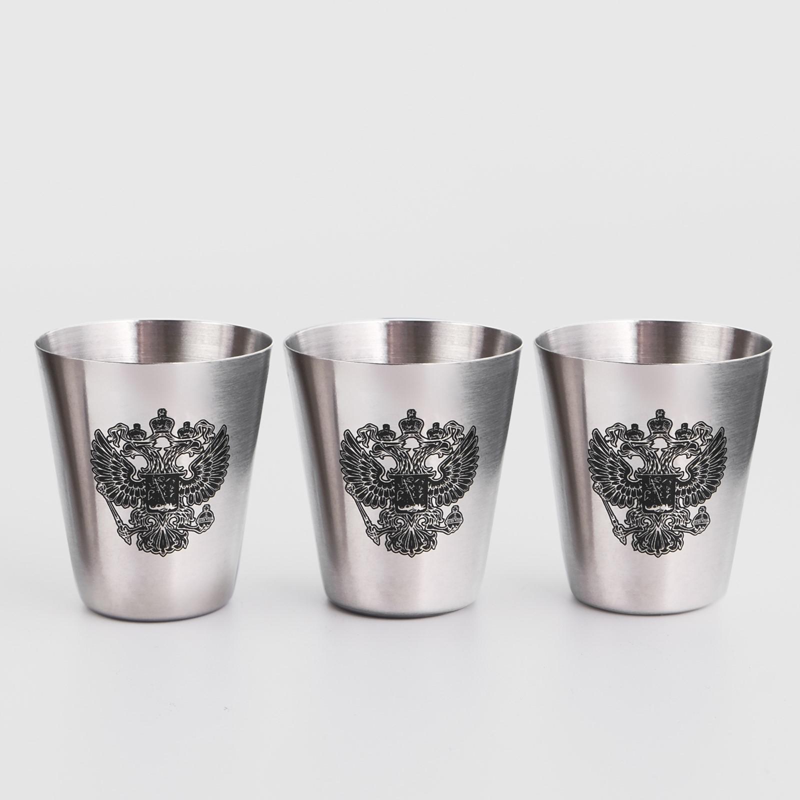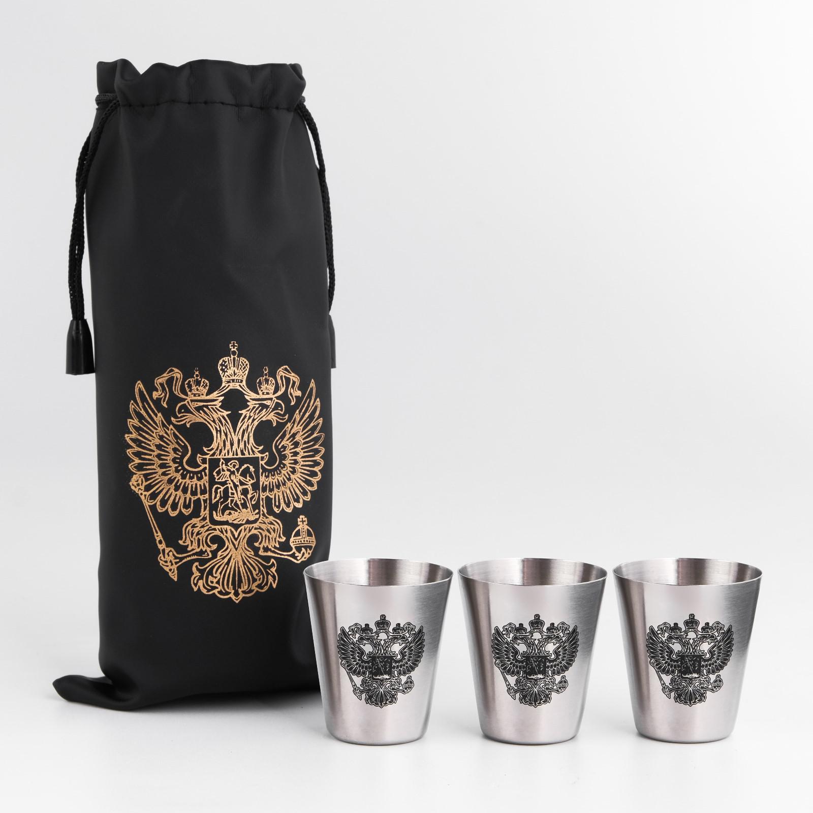 Стопки, 23 февраля "герб", набор 3 шт х 30 мл, 4 х 3.5 см. Набор стопок из 3 штук по 30 мл из пищевой нержавеющей стали с удобным и компактным мешочком с завязками для хранения и переноски. Легкие и компактные, удобно брать с собой на отдых, рыбалку, охоту, природу или в путешествия. Супер прочные и стильные, эти стопки изготовлены из высокого качества 304 нержавеющей стали, они не только красиво смотрятся, но и обеспечивают долгий срок службы изделия. Легко моются и подходят для повседневного использования. Отлично заменят стеклянные рюмки и бокалы, смотрятся эффектно и стильно. Стопки не слишком высокие, удобно помещаются в руке и имеют оптимальный объем 30 мл. Это подарочный набор на все случаи жизни! Стаканчики станут прекрасным подарком на новый год папе или маме, бабушке или дедушке, а еще коллеге или начальнику боссу на день рождения или 23 февраля, 9 мая, 8 марта, юбилей. Этот набор шоттов удивит и порадует каждого получателя. Рюмки подойдут для водки, самогона, коньяка, виски, рома, ликера и другого алкоголя. Также допустимо использовать для безалкогольных напитков, таких как сок, вода или морс. Небольшие шоты идеальны для коктейлей, текилы или настоек. Цвет: Хромированный Ширина, см: 3.5 Высота, см: 4 В наборе, шт.: 3 Объём, мл: 30 Материал: Нержавеющая сталь Материал: Текстиль  развернуть описание ▼
