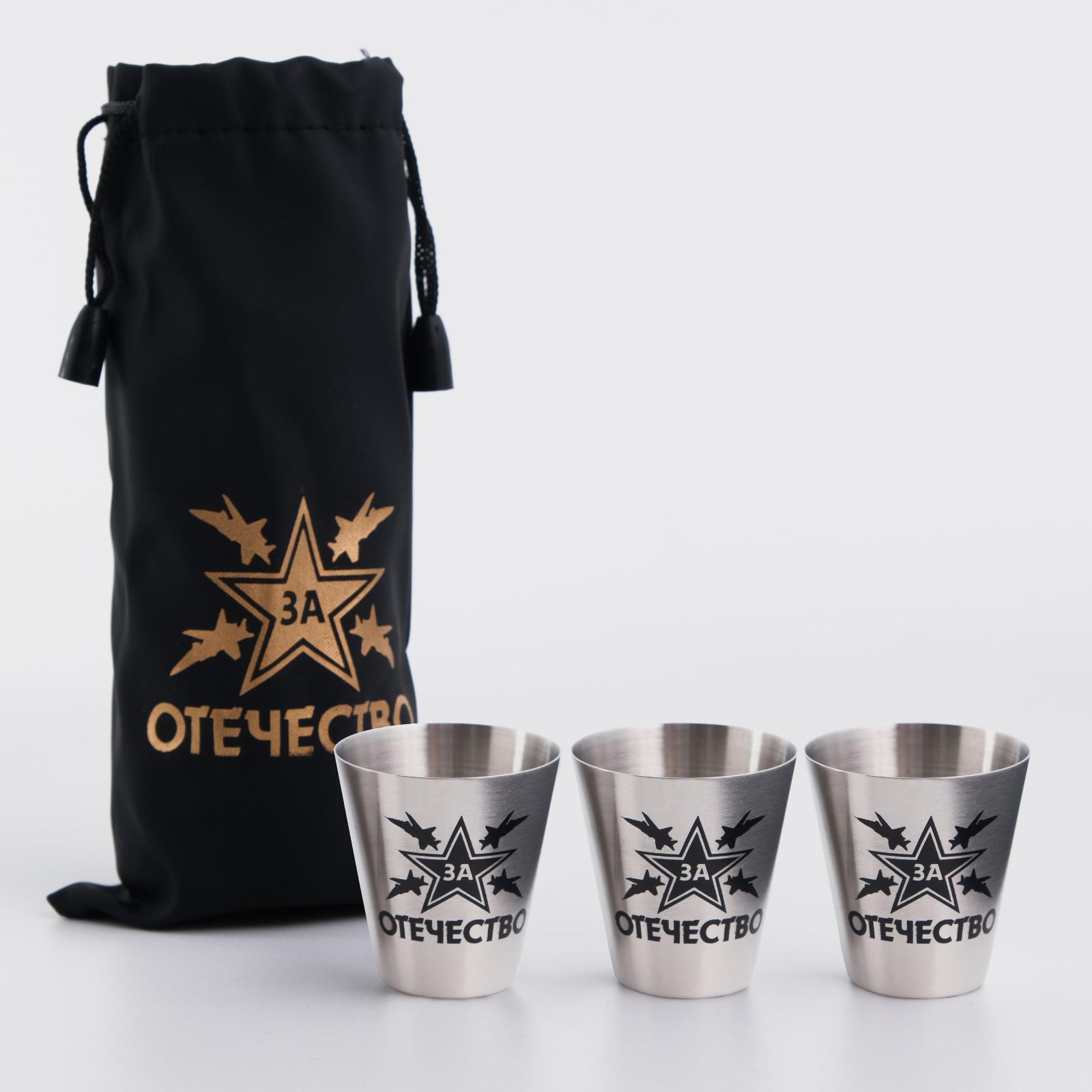 Стопки, 23 февраля, "за отечество", набор 3 шт по 30 мл, 4 х 3.5 см. Набор стопок из 3 штук по 30 мл из пищевой нержавеющей стали с удобным и компактным мешочком с завязками для хранения и переноски. Легкие и компактные, удобно брать с собой на отдых, рыбалку, охоту, природу или в путешествия. Супер прочные и стильные, эти стопки изготовлены из высокого качества 304 нержавеющей стали, они не только красиво смотрятся, но и обеспечивают долгий срок службы изделия. Легко моются и подходят для повседневного использования. Отлично заменят стеклянные рюмки и бокалы, смотрятся эффектно и стильно. Стопки не слишком высокие, удобно помещаются в руке и имеют оптимальный объем 30 мл. Это подарочный набор на все случаи жизни! Стаканчики станут прекрасным подарком на новый год папе или маме, бабушке или дедушке, а еще коллеге или начальнику боссу на день рождения или 23 февраля, 9 мая, 8 марта, юбилей. Этот набор шоттов удивит и порадует каждого получателя. Рюмки подойдут для водки, самогона, коньяка, виски, рома, ликера и другого алкоголя. Также допустимо использовать для безалкогольных напитков, таких как сок, вода или морс. Небольшие шоты идеальны для коктейлей, текилы или настоек. Цвет: Хромированный Ширина, см: 3.5 Высота, см: 4 parts count: 0 В наборе, шт.: 3 Объём, мл: 30 tnved: 7323930000 Материал: Нержавеющая сталь Материал: Текстиль  развернуть описание ▼