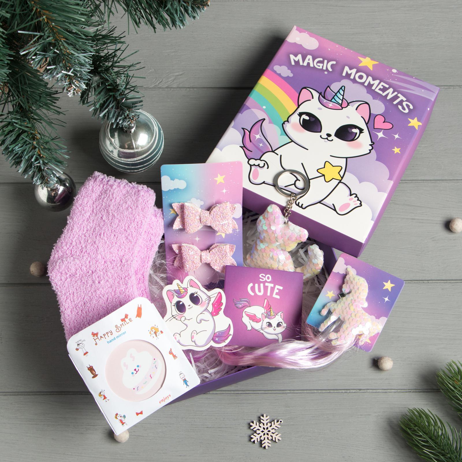 Набор подарочный kaftan magic moments: носки 18-20 см и аксессуары. В набор входит: -Носки (30-32)-; -Зеркало; -Заколки; -Открытки; -Брелок; Набор:Да|Цвет:Сиреневый|Для кого:Для девочки|В наборе, шт.:7|Длина стопы, см:18|Длина стопы, см:19|Длина стопы, см:20|Размер обуви:30|Размер обуви:31|Размер обуви:32|Вид упаковки:Подарочная коробка|Тематика праздника:Новый год|Тематика праздника:8 Марта|Адресат:Дочке|Адресат:Девочке|Составляющие набора:Аксессуары для волос|Составляющие набора:Брелок|Составляющие набора:Зеркало|Составляющие набора:Носки|Составляющие набора:Открытка|Возраст:Для детей|Страна:Китай  развернуть описание ▼