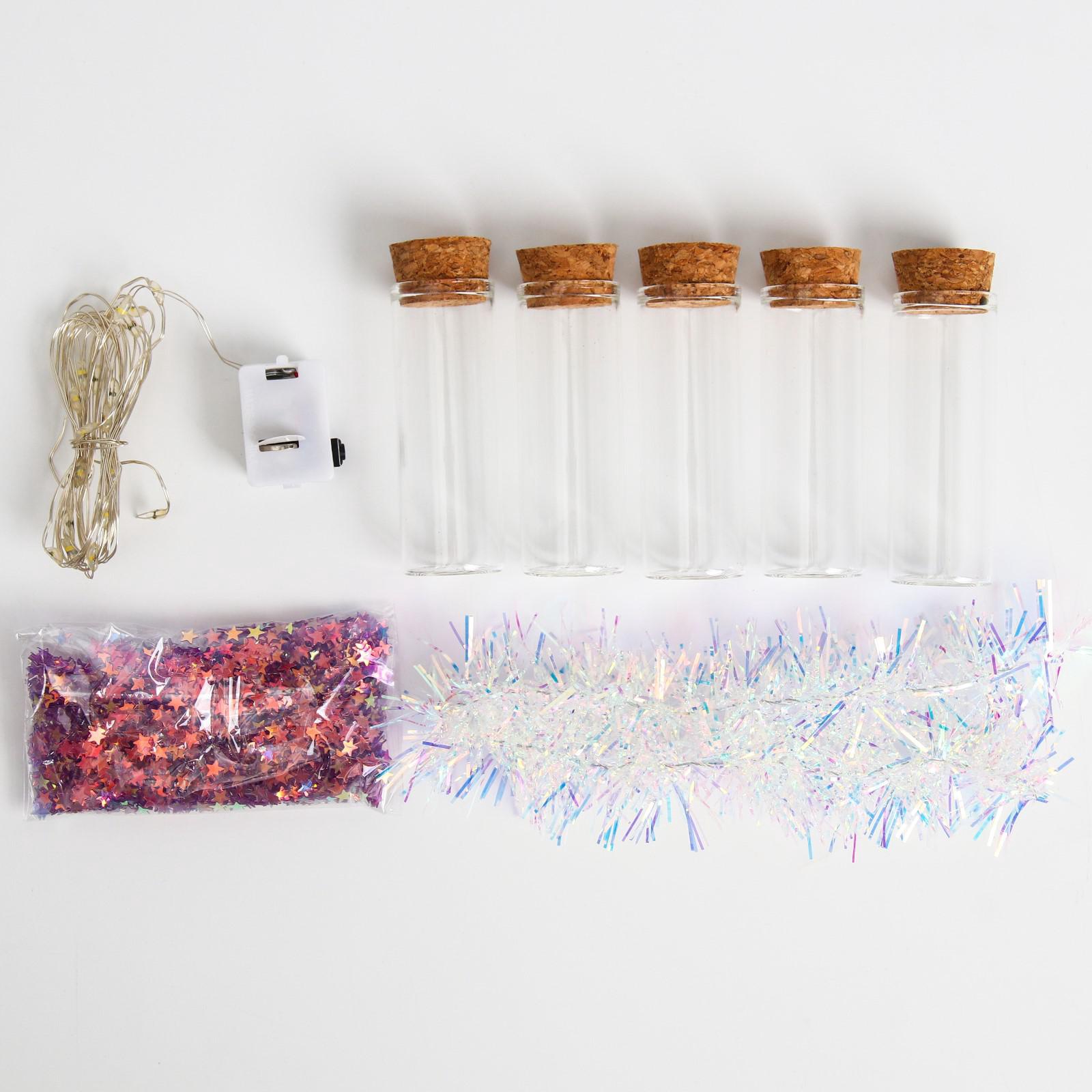 Распределите мишуру и светодиоды по баночкам.