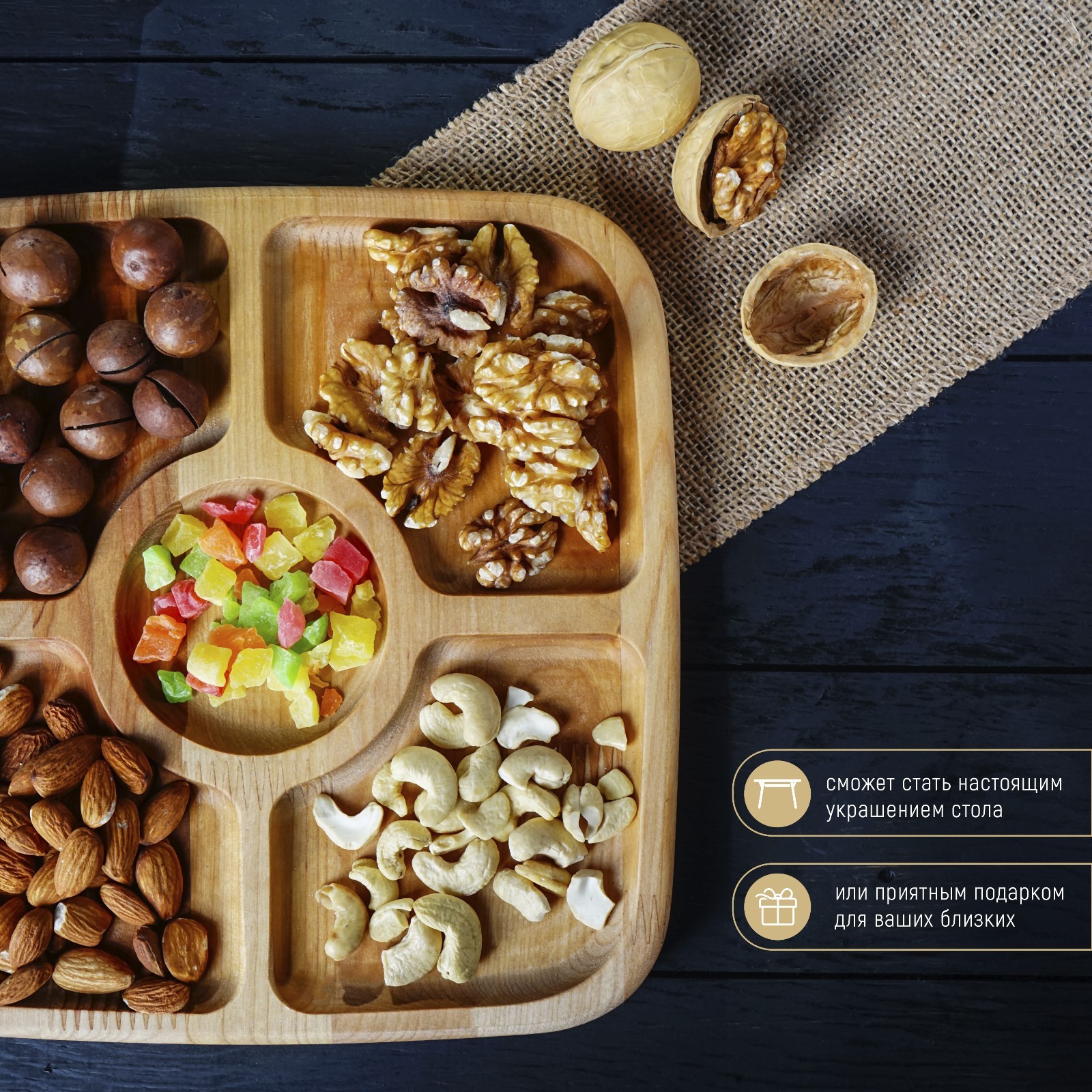Менажница квадратная доляна, 25x25x2 см, 5 секций, берёза