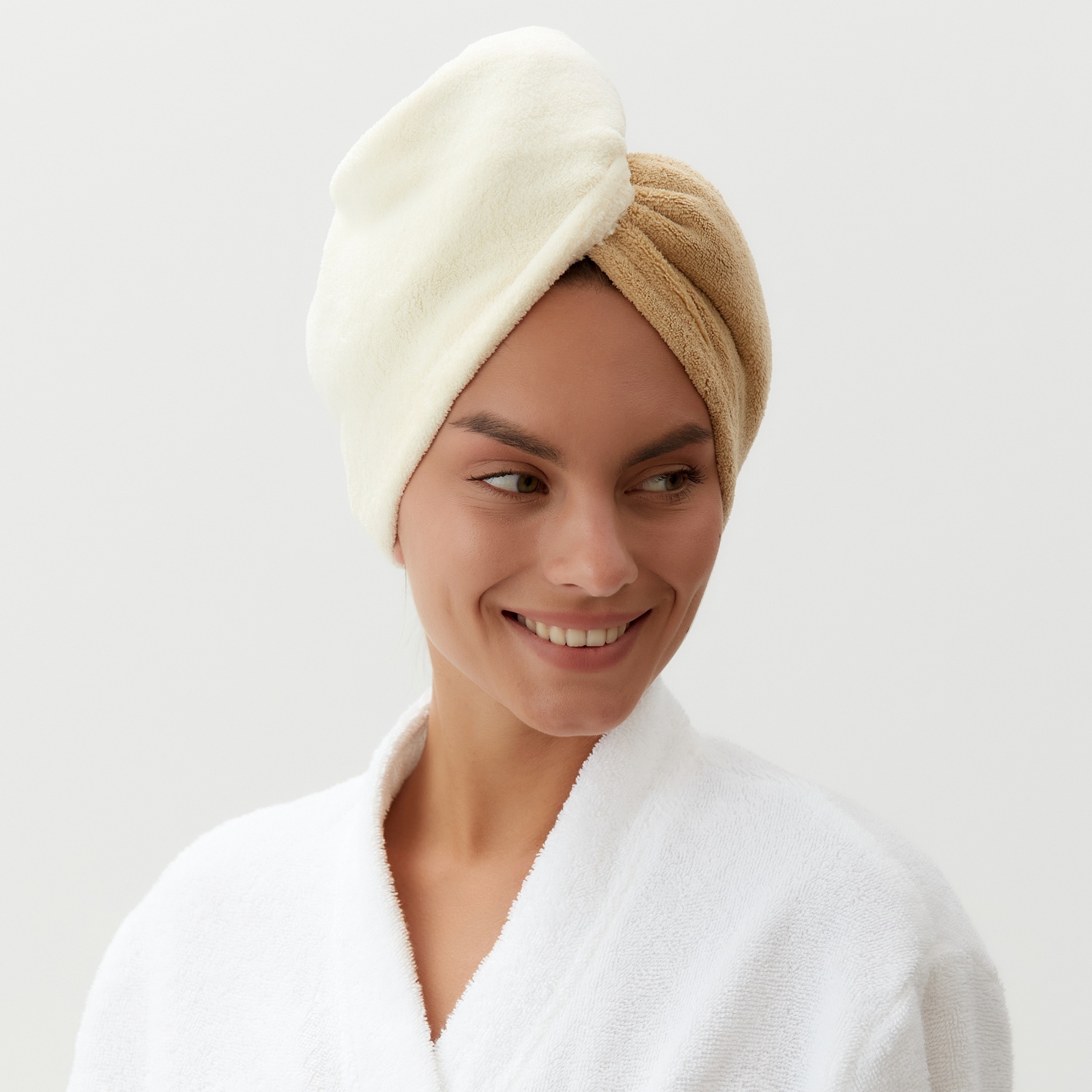 Чалма для сушки волос этель «двухцветная», цв.бежевый/коричневый, 65*25 см, 100% п/э