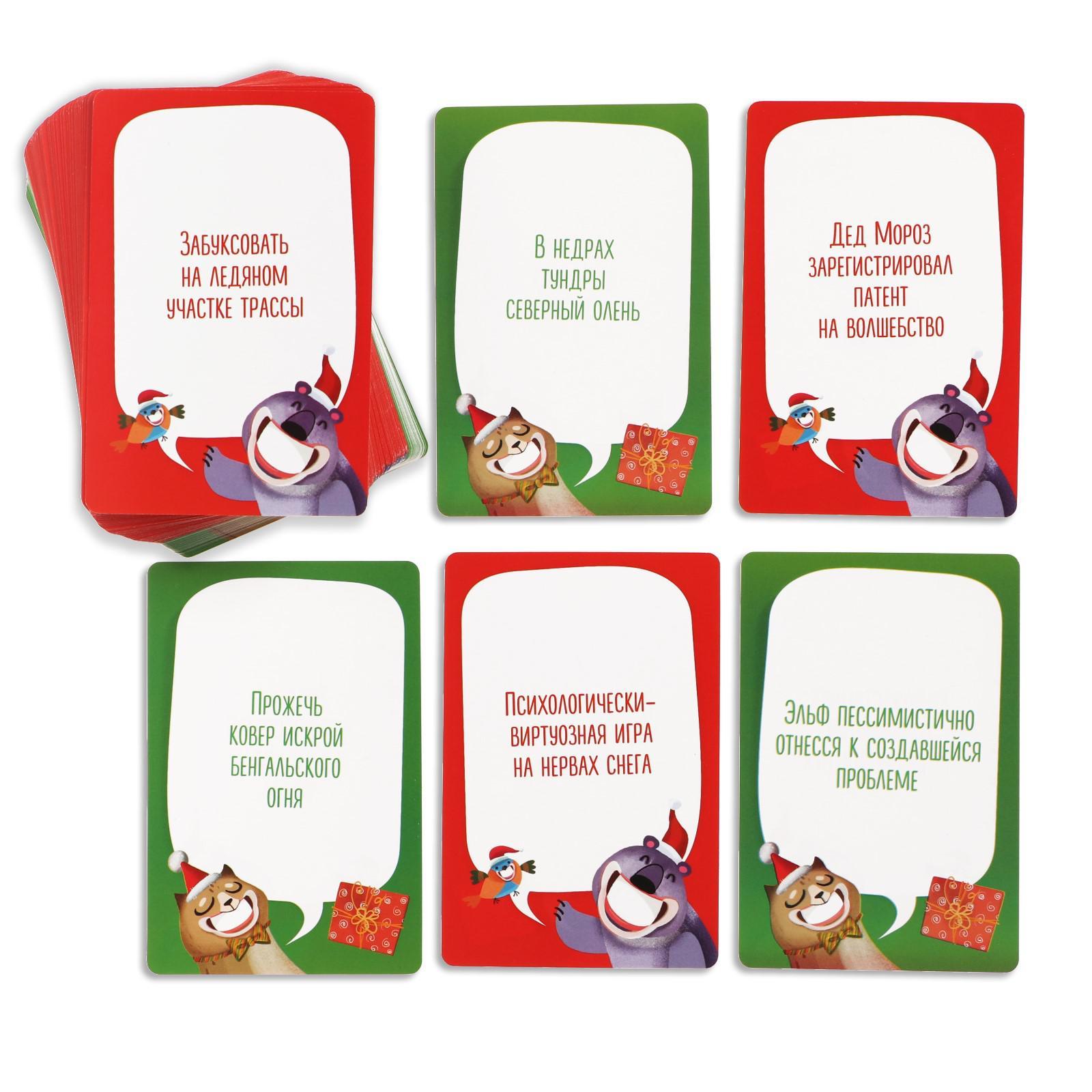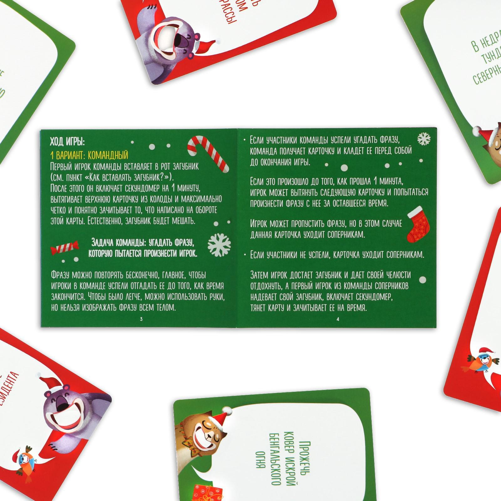 Новогодняя настольная игра «что вы говорите. с новым годом», 100 карт, 6 загубников, 12+. Что-что вы говоритеx Каков рецепт весёлого Нового годаx Всё просто: компания друзей или близких и настольная игра «Что вы говоритеx» в праздничном формате. Благодаря ей вам будет трудно удержаться от смеха, а всё потому, что участникам придётся научиться понимать даже самую неразборчивую речь. Ведь только так можно победить… с загубниками во рту! Как игратьx Первый игрок вставляет в рот загубник. После включает секундомер на смартфоне, вытягивает верхнюю карточку из колоды и максимально чётко и понятно зачитывает то, что написано на ней. Естественно, загубник при этом будет мешать. Задача остальных игроков: угадать фразу, которую пытается произнести участник. Тот, кто сделает это первым — получит карточку. Ну а если никому не удалось отгадать, она уходит в сброс. Как вы думаете, кто победитx Конечно тот, кто наберёт больше всего карт! Играть можно как командами, так и в формате «каждый сам за себя». Внутри вы найдёте: 100 двухсторонних карт,6 загубников,правила игры.Играйте и встречайте Новый год вместе с ЛАС ИГРАС! Возраст:От 12 лет|Символ года:Нет|Тематика праздника:Новый год|Возраст:Детский|Материал:Бумага|Материал:Пластик|Материал:Картон|Количество игроков:От 2 игроков|Время игры:20 минут|Жанр игры:Семейная|Жанр игры:Коммуникативная|Количество игроков:2 - 6|Материал:Картон|Страна:Китай  развернуть описание ▼