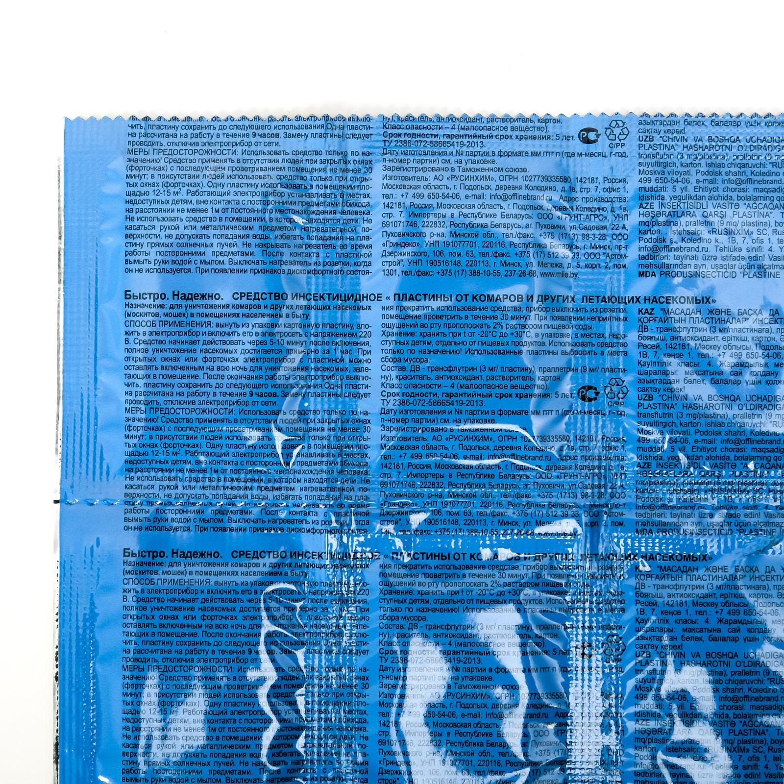 Назначение: для уничтожения комаров и других летающих насекомых (москитов, мошек) в помещениях населением в быту. Способ применения: вынуть из упаковки картонную пластину, вложить в электроприбор и включить его в электросеть с напряжением 220 В. Средство начинает действовать через 5-10 минут после включения, полное уничтожение насекомых достигается примерно за 1 час. При открытых окнах или форточках электроприбор с пластиной можно оставлять включенным на всю ночь для уничтожения насекомых, залетающих в помещение. После окончания работы электроприбор выключить, пластину сохранить до следующего использования. Одна пластина рассчитана на работу в течение 9 часов. Замену пластину следует проводить, отключив электроприбор от сети. Меры предосторожности: использовать средство только по назначению. Средство применять в отсутствии людей при закрытых окнах (форточках) с последующим проветриванием помещения не менее 30 минут; в присутствии людей использовать средство только при открытых окнах (форточках). Одну пластину использовать в помещении площадью 12-15 м2. Работающий электроприбор устанавливать в местах, недоступных детям, вне контакта с посторонними предметами обихода, на расстоянии не менее 1м от постоянного местонахождения человека. Не использовать средство в помещении, в котором находятся дети. Не касаться рукой или металлическим предметом нагревательной поверхности, не допускать попадания воды, избегать попадания на пластину прямых солнечных лучей. Не накрывать нагреватель во время работы посторонними предметами. После контакта с пластиной вымыть руки водой с мылом. Выключать нагреватель из розетки, когда он не используется. При появлении признаков дискомфортного состояния прекратить использование средства, прибор выключить из розетки, помещение проветрить в течение 30 минут. При появлении неприятных ощущений во рту прополоскать 2% раствором пищевой соды. Хранение: хранить при температуре от -20°С до +30°С, в упаковке, в местах, недоступных детям, отдельно от пищевых продуктов. Использовать средство только по назначению. Использованные пластины выбросить в места сбора мусора. Состав: трансфлутрин (3 мг/ пластину), праллетрин (9 мг/ пластину), краситель, антиоксидант, растворитель, картонная основа. Срок годности, гарантийный срок хранения: 5 лет.