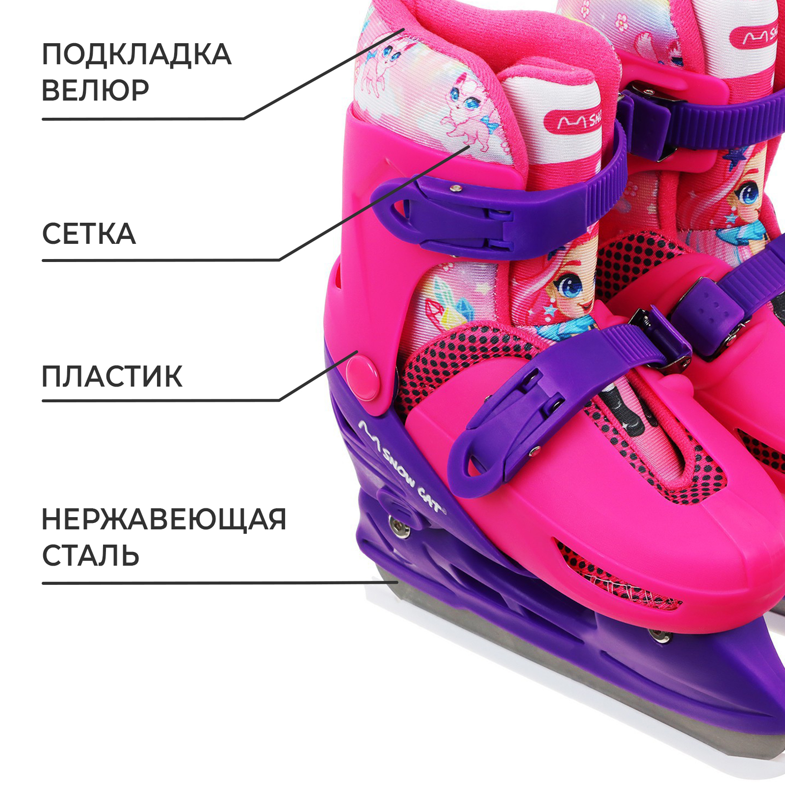 Набор: коньки детские раздвижные snow cat, с роликовой платформой, защита, р. 30-33. Коньки подходят для катания на открытом льду и крытых катках. Их легко надеть, отрегулировать и зафиксировать с помощью пластиковых клипс, которые расположены на голенище и в области ступни. Благодаря заменяемым ледовой и роликовой платформам можно кататься зимой и летом. Жёсткий корпус защищает ногу от травм, гарантирует плотную посадку и поддерживает голеностоп. Внутренняя подкладка из сетки и бархата согревает и создаёт комфорт. Коньки регулируются на 4 размера, это позволяет использовать их в течение нескольких сезонов. Для изменения размера необходимо зажать кнопку Push у основания пятки и раздвинуть две части пластикового каркаса до нужного положения. Внутренний сапожок состоит из двух частей, которые фиксируются c помощью липучек. При изменении размера его необходимо достать и закрепить в нужном положении. Универсальное лезвие из нержавеющей стали не поддаётся коррозии. В набор входит комплект защиты: шлем, наколенники, налокотники и защита кистей рук. Рекомендации по эксплуатации Удаляйте влагу с лезвия мягкой тканью. Сушите при комнатной температуре вдали от отопительных приборов. Используйте чехлы для лезвий коньков во время хранения и перехода к ледовой площадке. Заточите лезвия после покупки и повторяйте эту процедуру по мере необходимости для комфортного катания. Особенности Максимальная нагрузка: 40 кг. Максимальная температура катания: до –10 °С. Набор не предназначен для коммерческого использования и в пунктах проката. Цвет: Розовый Для кого: Для девочки Возраст: От 6 лет Диаметр колеса, мм: 5.9 Размер обуви: 30 Размер обуви: 31 Размер обуви: 32 Размер обуви: 33 Материал рамы: Пластик Материал колёс: Пластиковые Материал подкладки: Текстиль Серия: Без серии Раздвижные коньки: Да Тип коньков: Для фитнеса Тип коньков: Детские Роликовая платформа: Да Материал верха: Пластик Подходят для проката: Нет Материал лезвия: Нержавеющая сталь  развернуть описание ▼