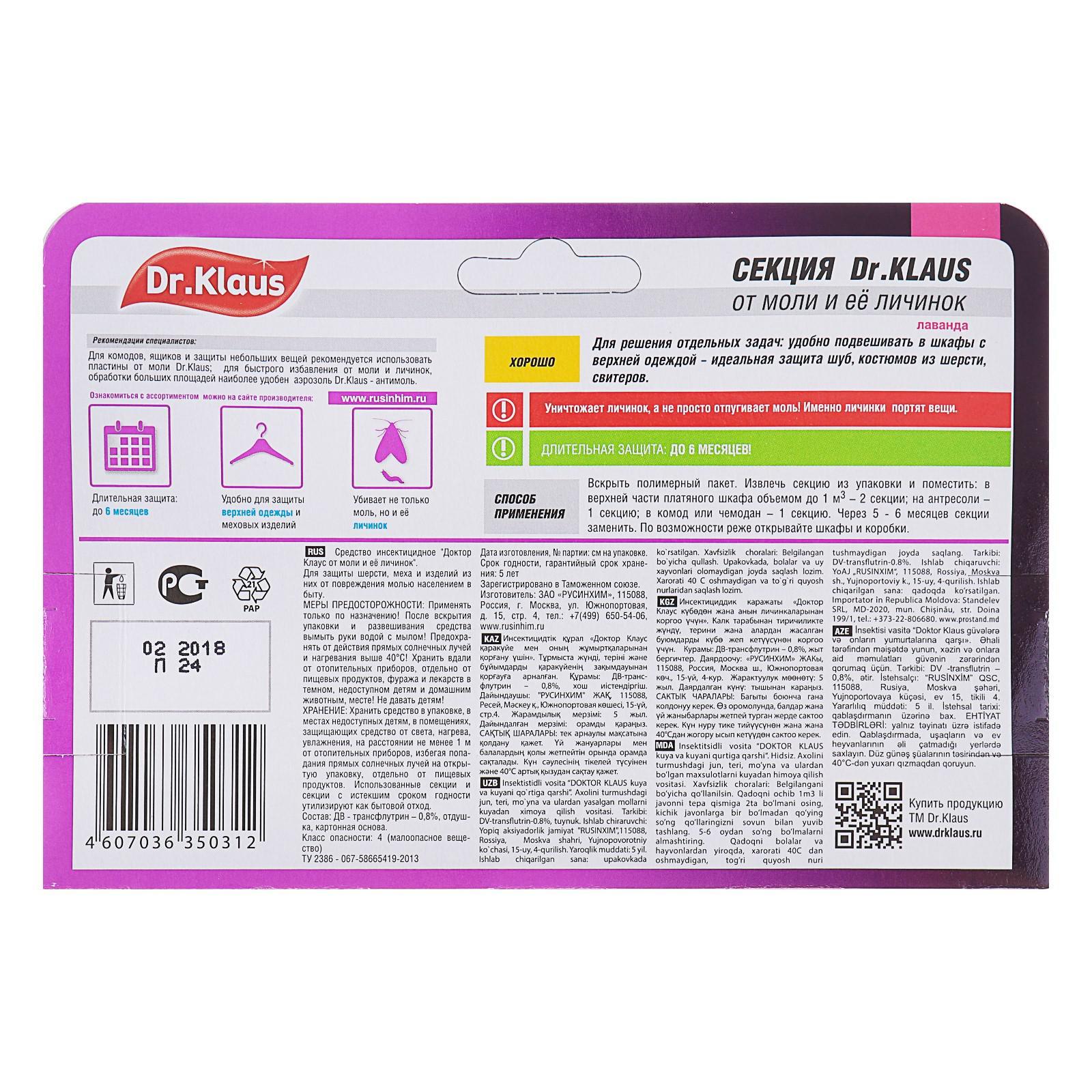 Секция от моли "Dr.Klaus", с ароматом лаванды, 1 шт