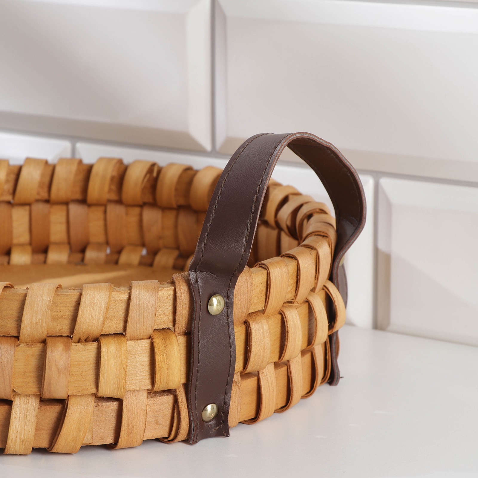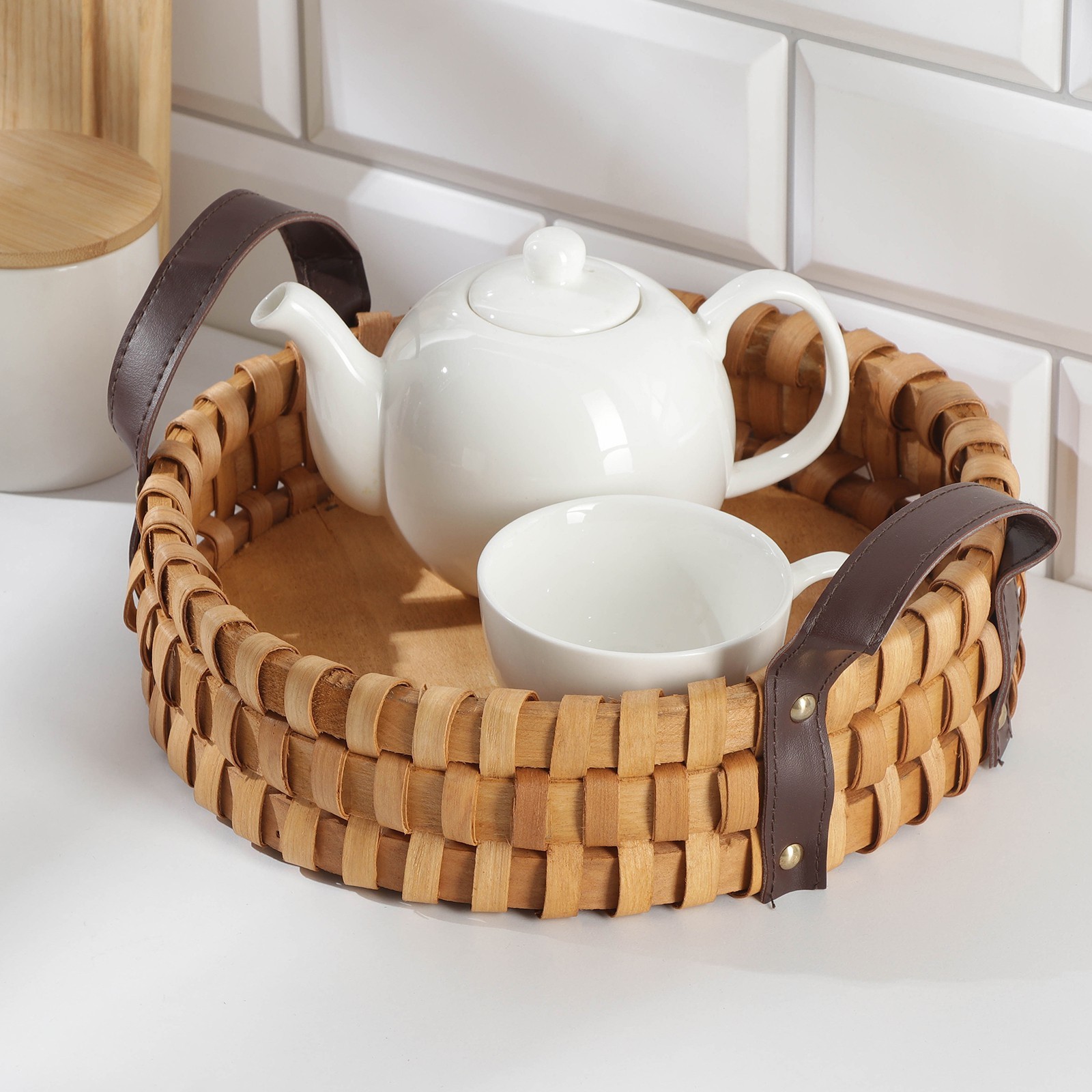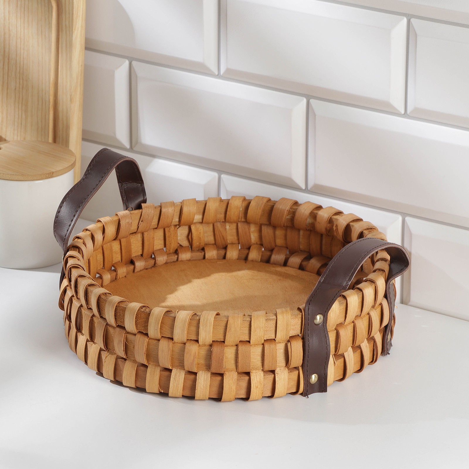 Поднос-корзинка для завтрака доляна «массив», с ручками из искусственной кожи, D=25 см
