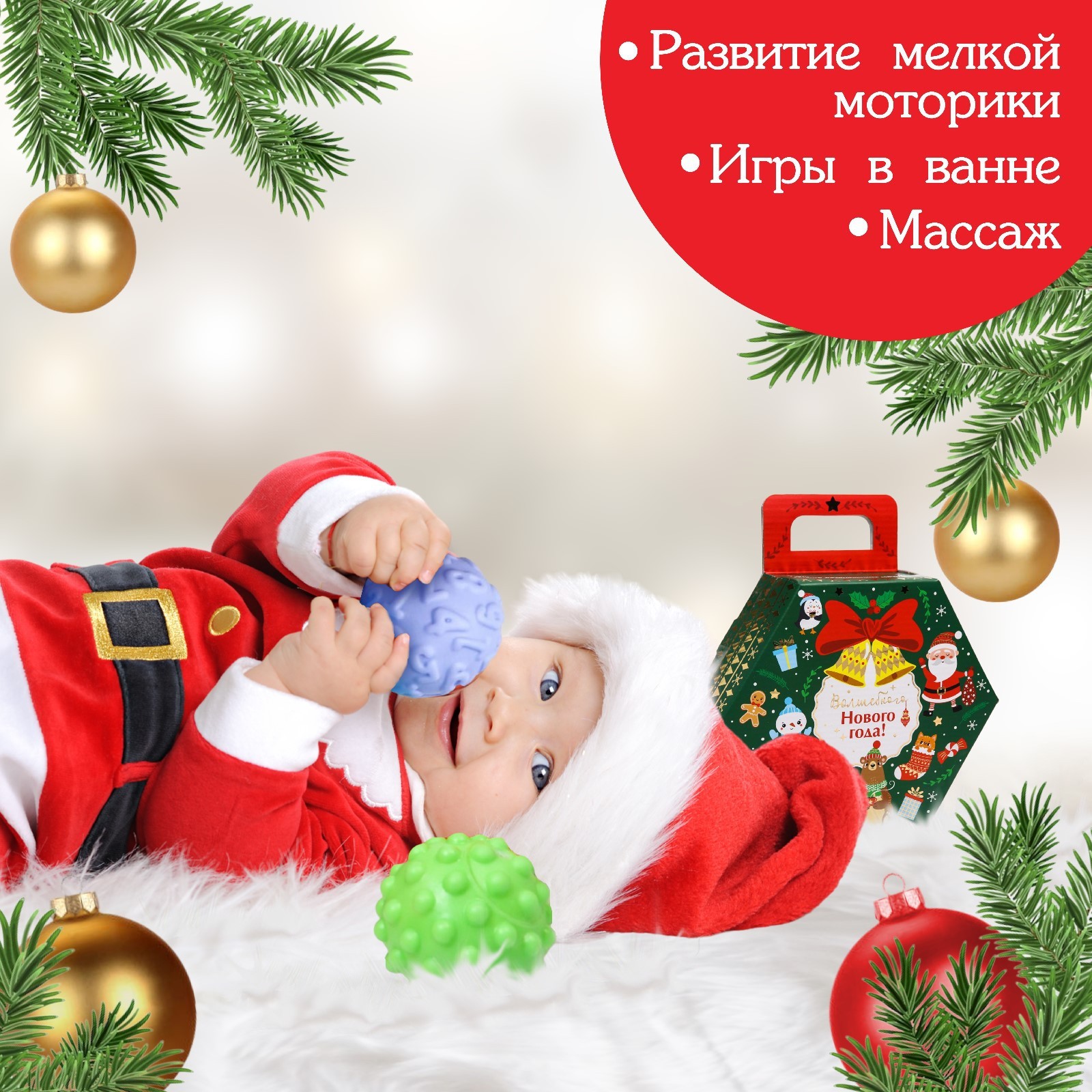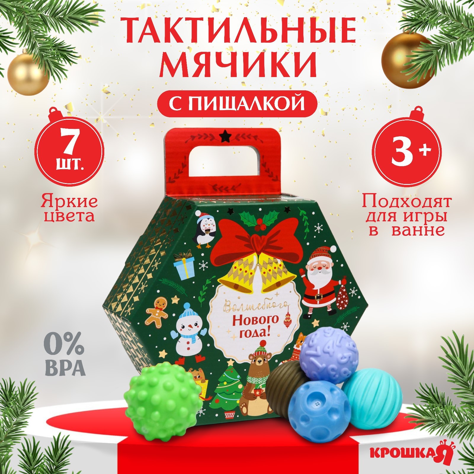 Подарочный набор развивающих тактильных мячиков «новогодний подарок», 7 шт., новогодняя подарочная упаковка, крошка я