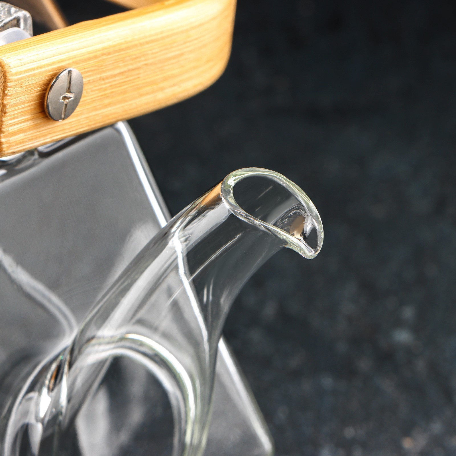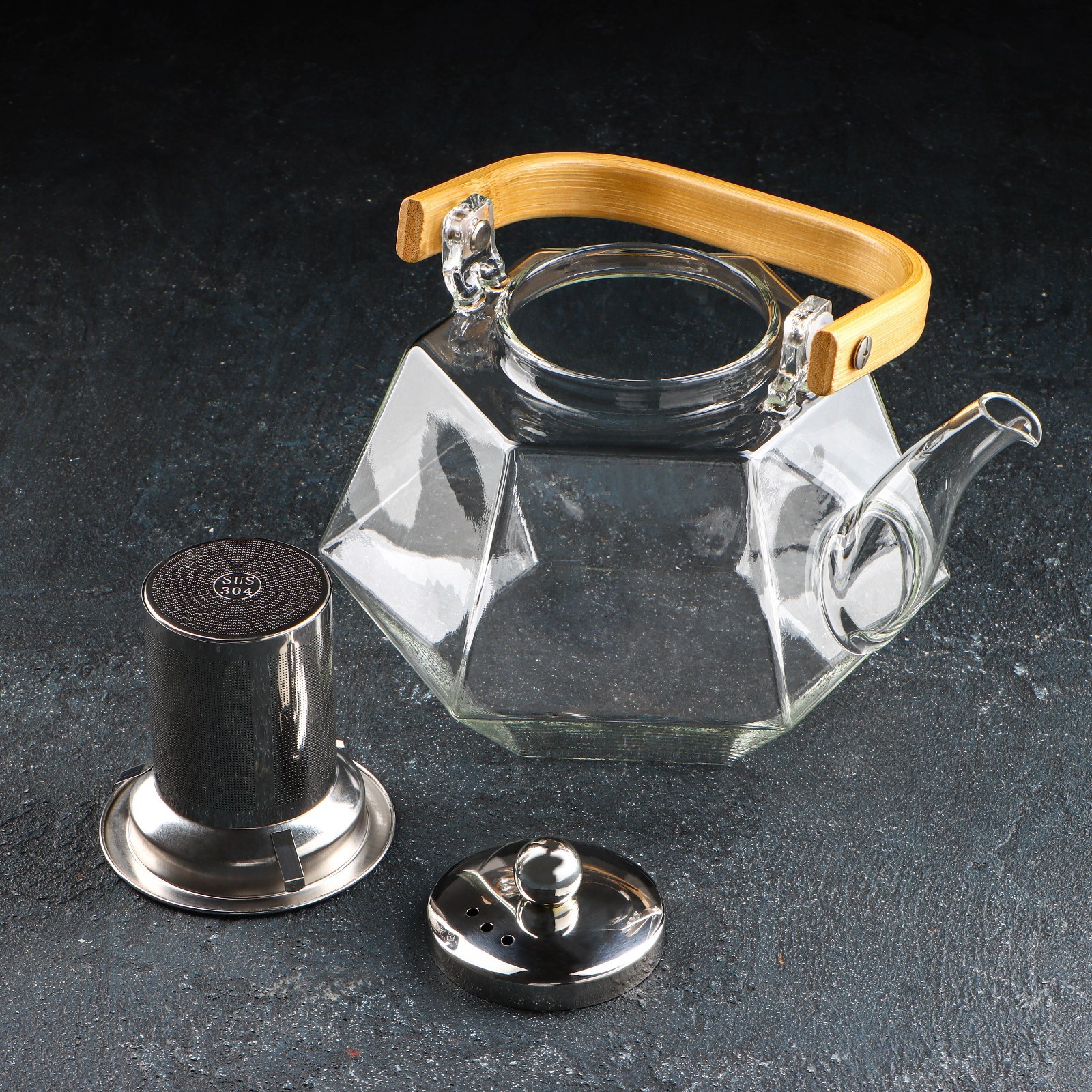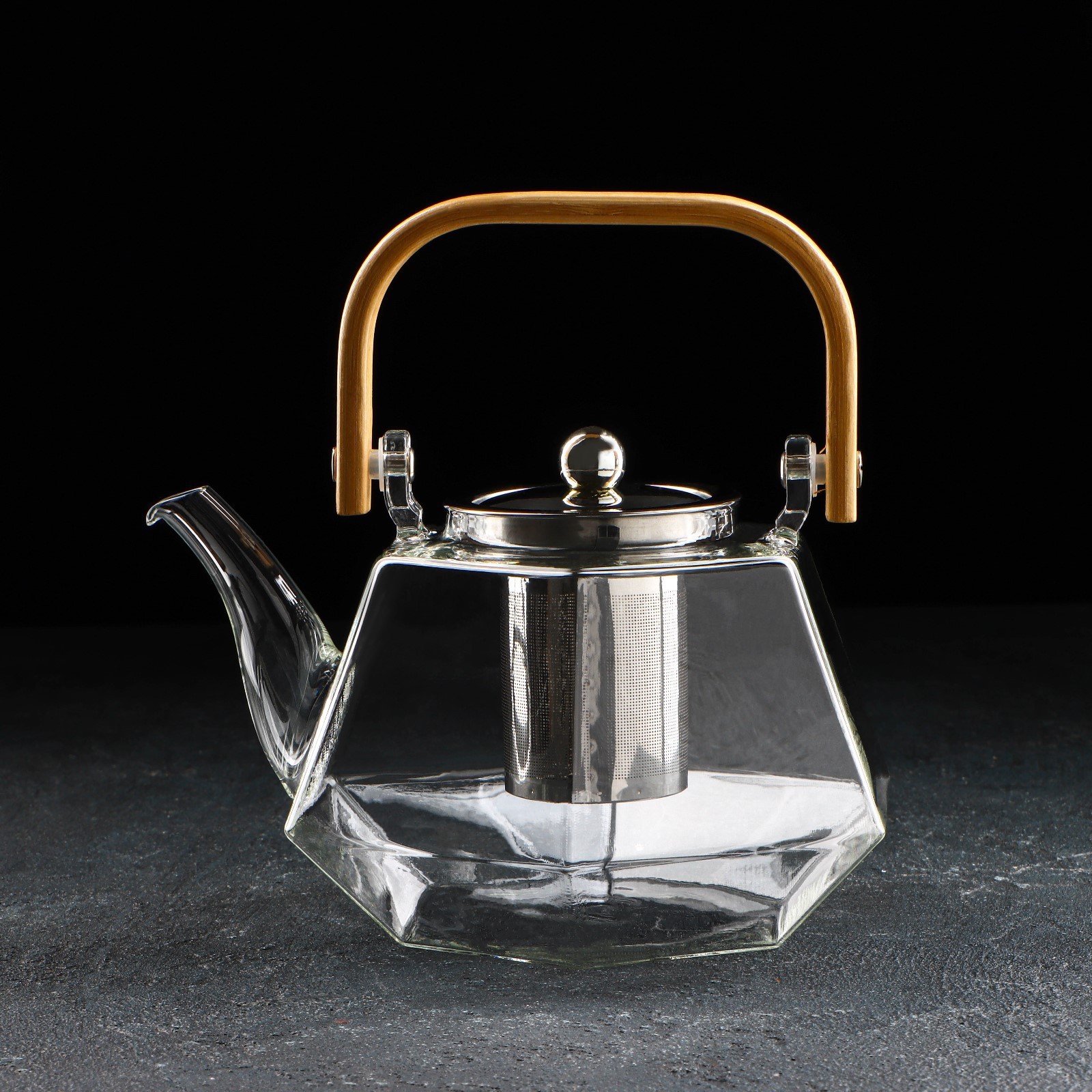 Чайник стеклянный заварочный с бамбуковой крышкой и металлическим ситом «октогон», 1,2 л