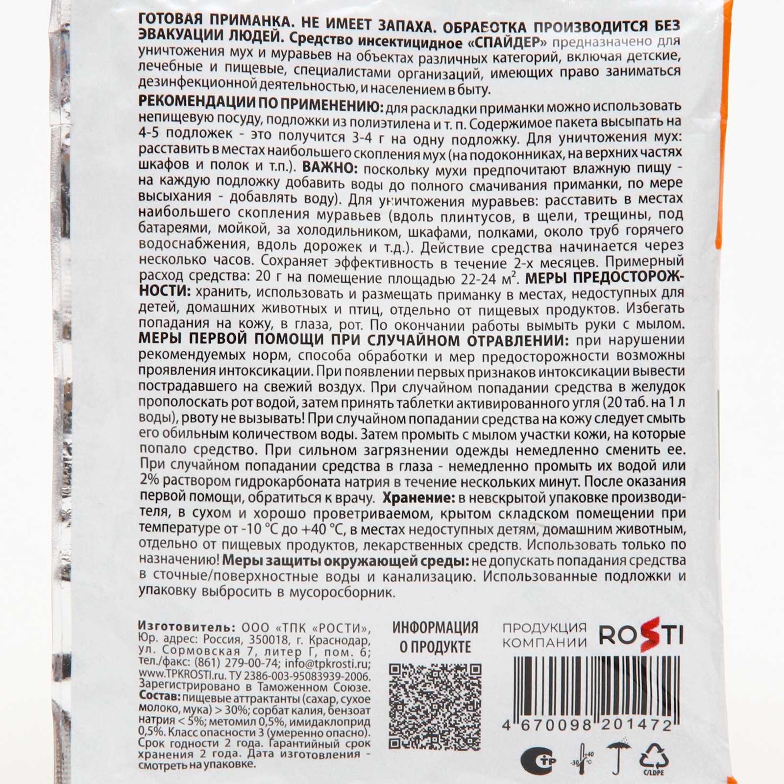 Приманка от мух "рубит" спайдер, не жуж-жи, 16 г. Назначение: гранулированная готовая к применению приманка с высокой привлекающей способностью и эффективностью, которая достигнута благодаря специально подобранному усовершенствованному составу компонентов. Содержит сразу два действующих вещества, одно из которых - широко известный метомил из группы карбаматов. Область применения: гранулы для уничтожения мух на объектах различных категорий, включая детские, лечебные и пищевые (в т. ч. , кухни-времянки, дачные и садовые домики, места общественного пользования и т. п. ). Формы фасовок: герметичный полимерный пакет 16г. Состав: пищевые аттрактанты, сорбат калия, бензонат натрия, метомил, имидаклоприд, Вид средства: Гранулы Назначение: От мух Температурное ограничение: Нет  развернуть описание ▼