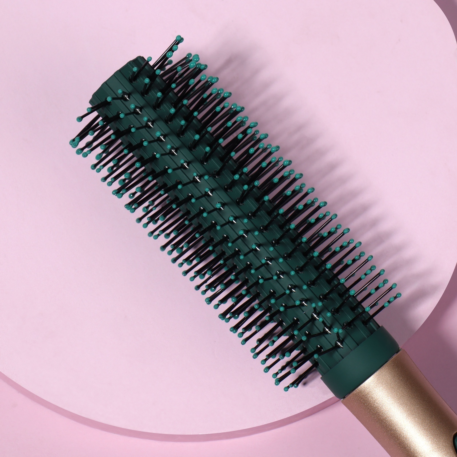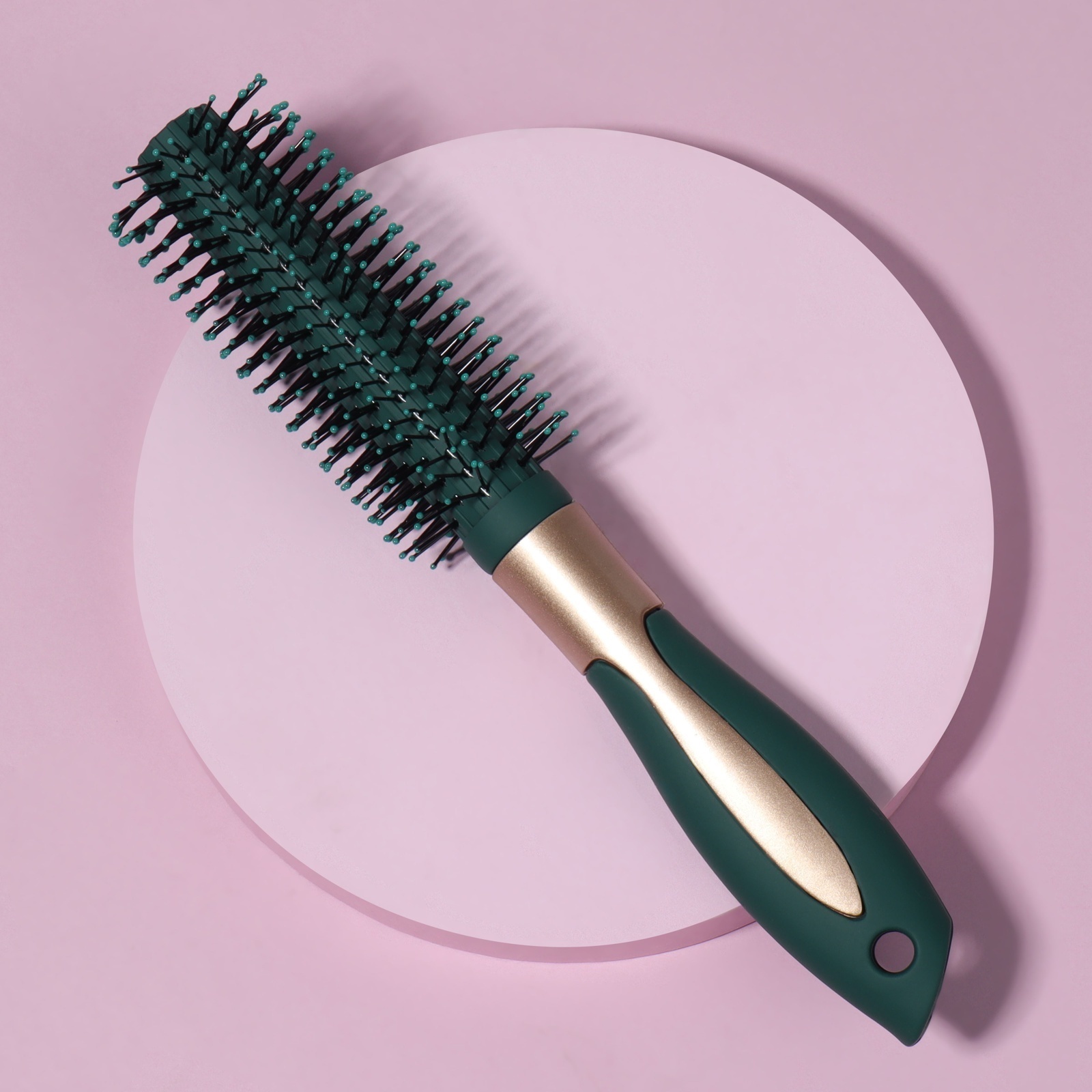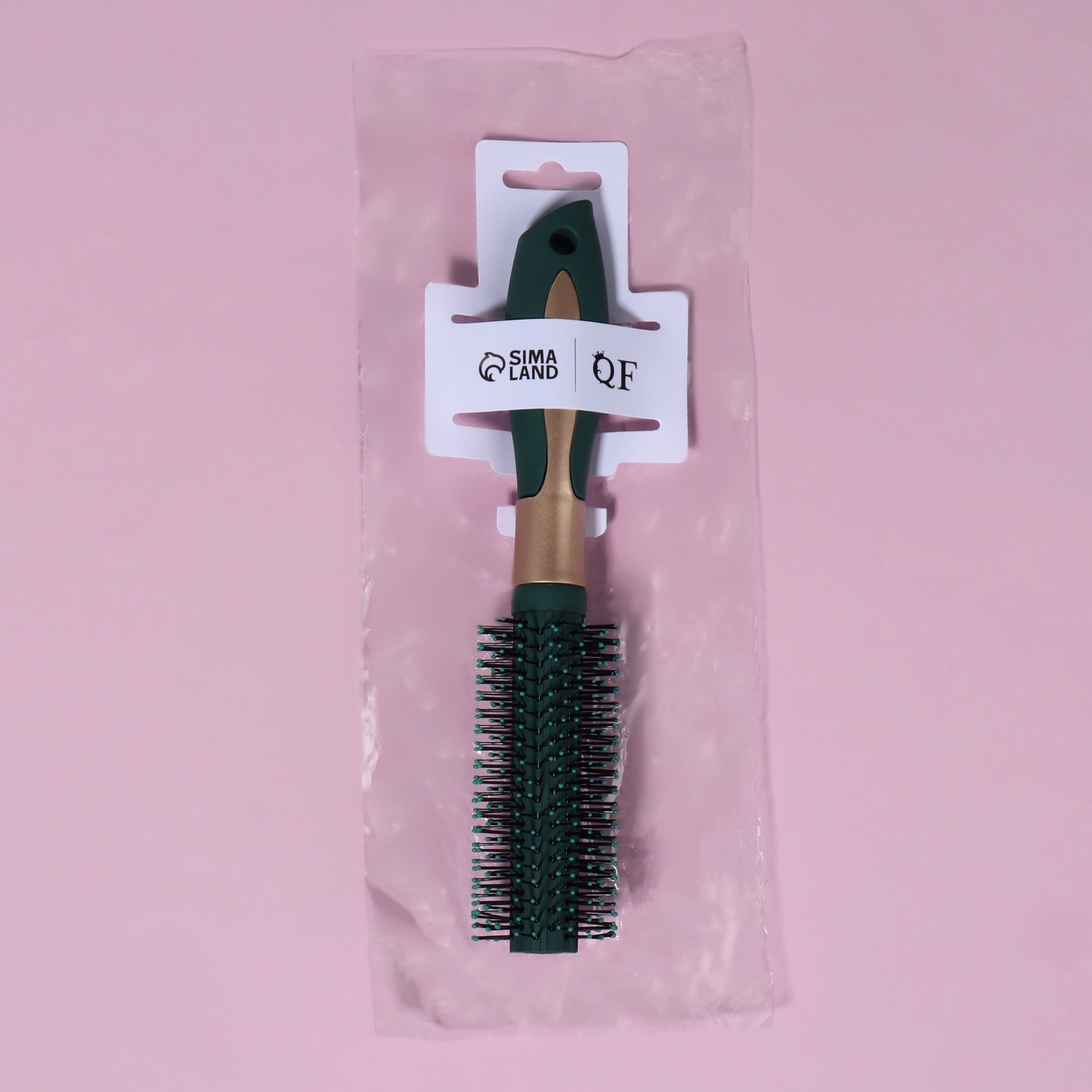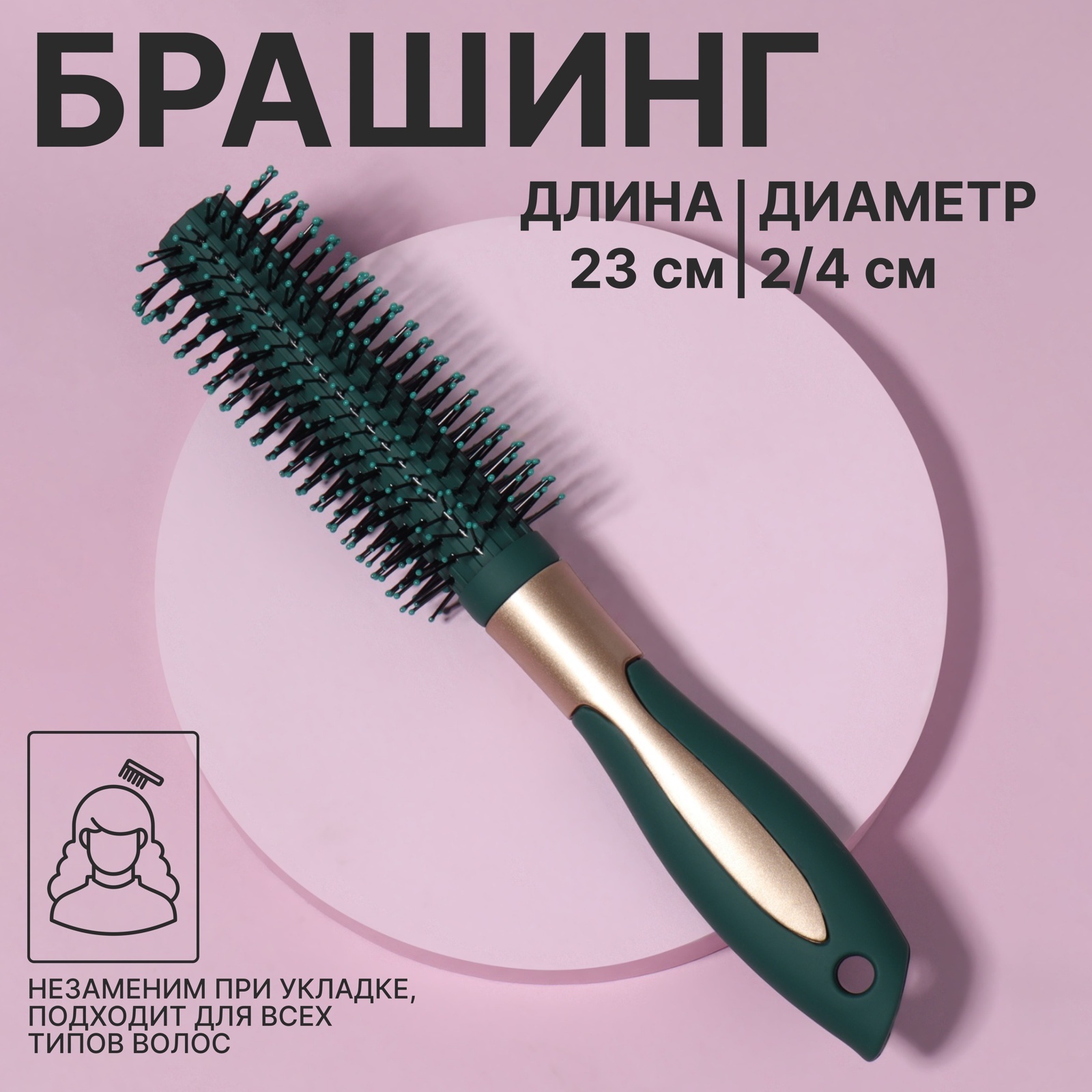 Брашинг для волос, прорезиненная ручка, d=20/40 мм, 23(±1) см, зелёный. Круглая щетка с прорезиненной ручкой в зеленом цвете — удобный инструмент для ежедневной укладки волос. Диаметр 4 см подходит для создания объема у корней и мягких волн на волосах средней длины. Основные преимущества Прорезиненная ручка — не скользит в руках, обеспечивает надежный захват во время укладкиПластиковые зубцы — бережно распутывают волосы без поврежденийЯркий дизайн — зелено-золотистое сочетание делает щетку стильным аксессуаромУниверсальный размер — подходит для большинства типов волосДля кого подойдет Щетка создана для тех, кто ценит удобство и практичность в ежедневном уходе за волосами. Особенно понравится обладателям прямых и волнистых волос средней длины. Как использовать Начинайте укладку с нижних слоев, постепенно продвигаясь к макушке. Для лучшего результата используйте фен на средних температурах. Резиновая ручка обеспечит комфорт даже при продолжительной укладке. Набор:Нет|Цвет:Зелёный|Цвет:Золотистый|Форма:Круглая|Диаметр, см:4|Детские:Нет|Материал корпуса:Пластик|Вид упаковки:Пакет|Рисунок:Нет|Материал:Пластик|Материал:Резина|Прорезиненная ручка:Да|Продуваемая расчёска:Нет|Тип расчёски:С ручкой|Зубчики расчёски:Частые|Профессиональная(ый):Нет|В подарочной упаковке:Нет|Материал щетины:Пластиковая|Страна:Китай  развернуть описание ▼