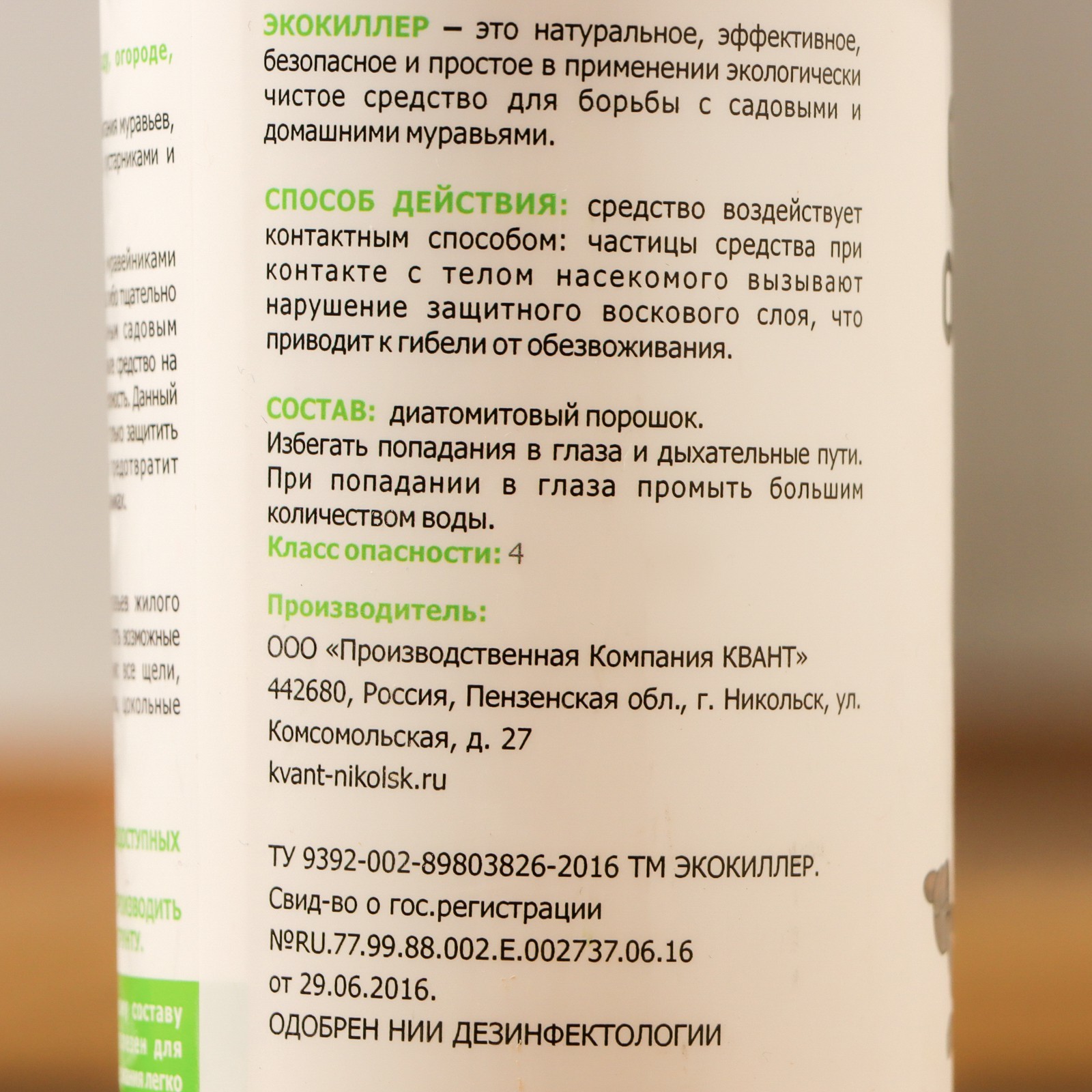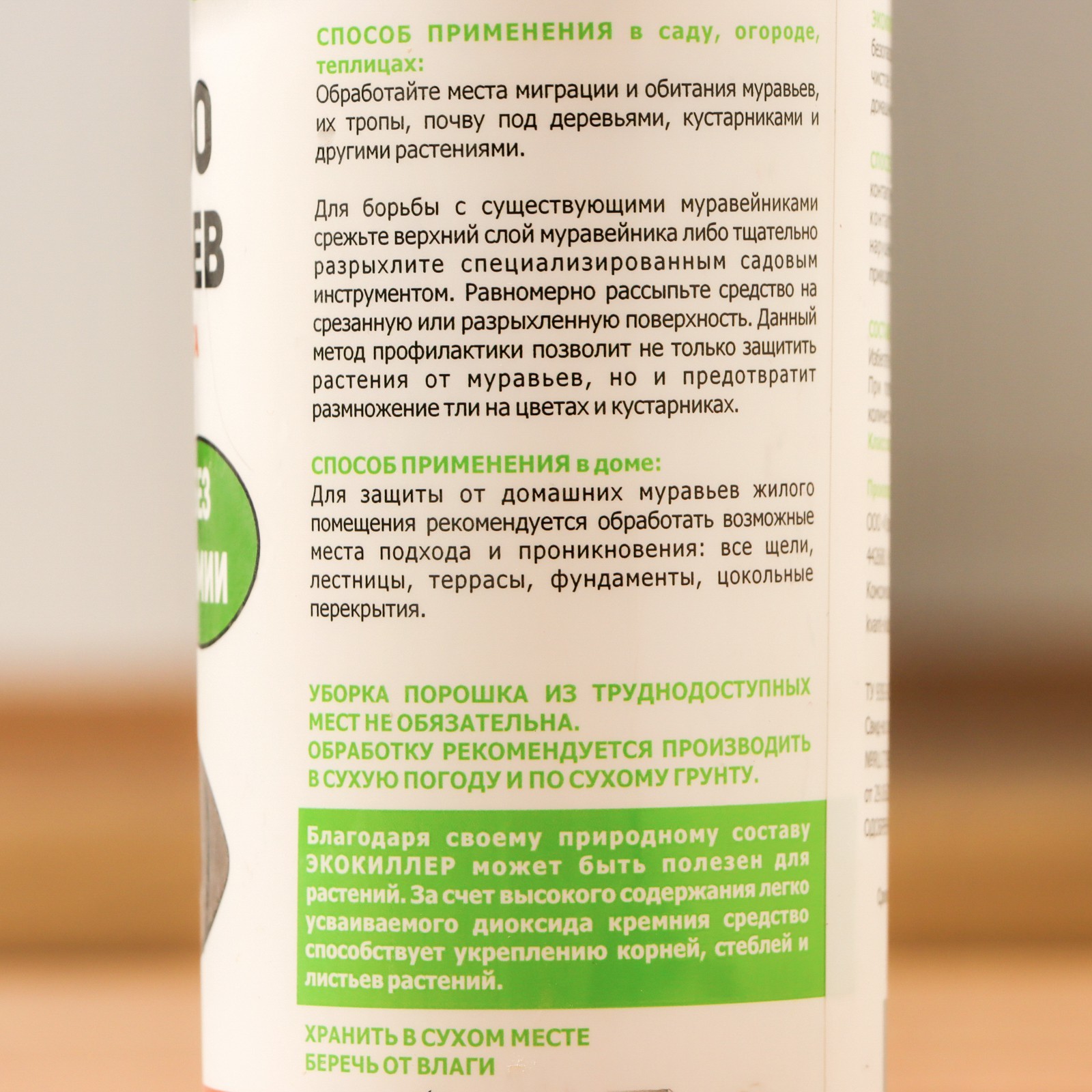 Средство от муравьев "экокиллер", туба, 500 мл,. Полностью натуральное, экологичное средство. Уникальный, природный инсектицид, не содержит ядохимикатов и отравляющих веществ. Безопасен для людей и животных. Природное происхождение - аморфный минерал диоксид кремния (специально обработанный диатомит). Не токсичен, не содержит химии. Не имеет запаха, не вызывает аллергических реакций и отравления. Природная формула не загрязняет землю, воду и воздух. Применение: При нанесении в скрытые полости и труднодоступные места отвинтите колпачок на носике-крышке флакона, переверните флакон вертикально донышком вверх. Легкими нажатиями на флакон распылите порошок в необходимые места (внутрь плинтусов, в подрозетники, под наличники и т. п. ). Порошок из обработанных полостей не убирать!Состав: диатомитовый порошок. Вид средства: Порошок Температурное ограничение: Нет  развернуть описание ▼