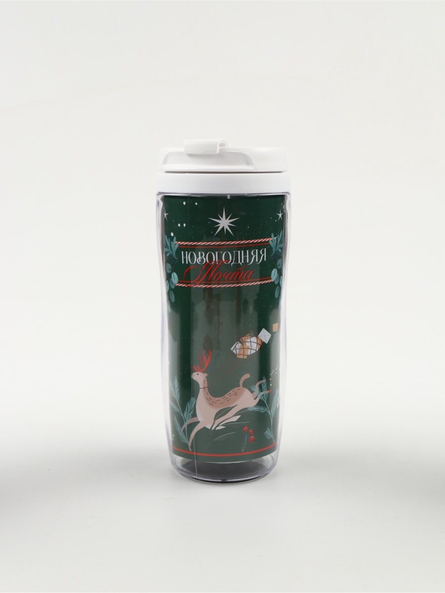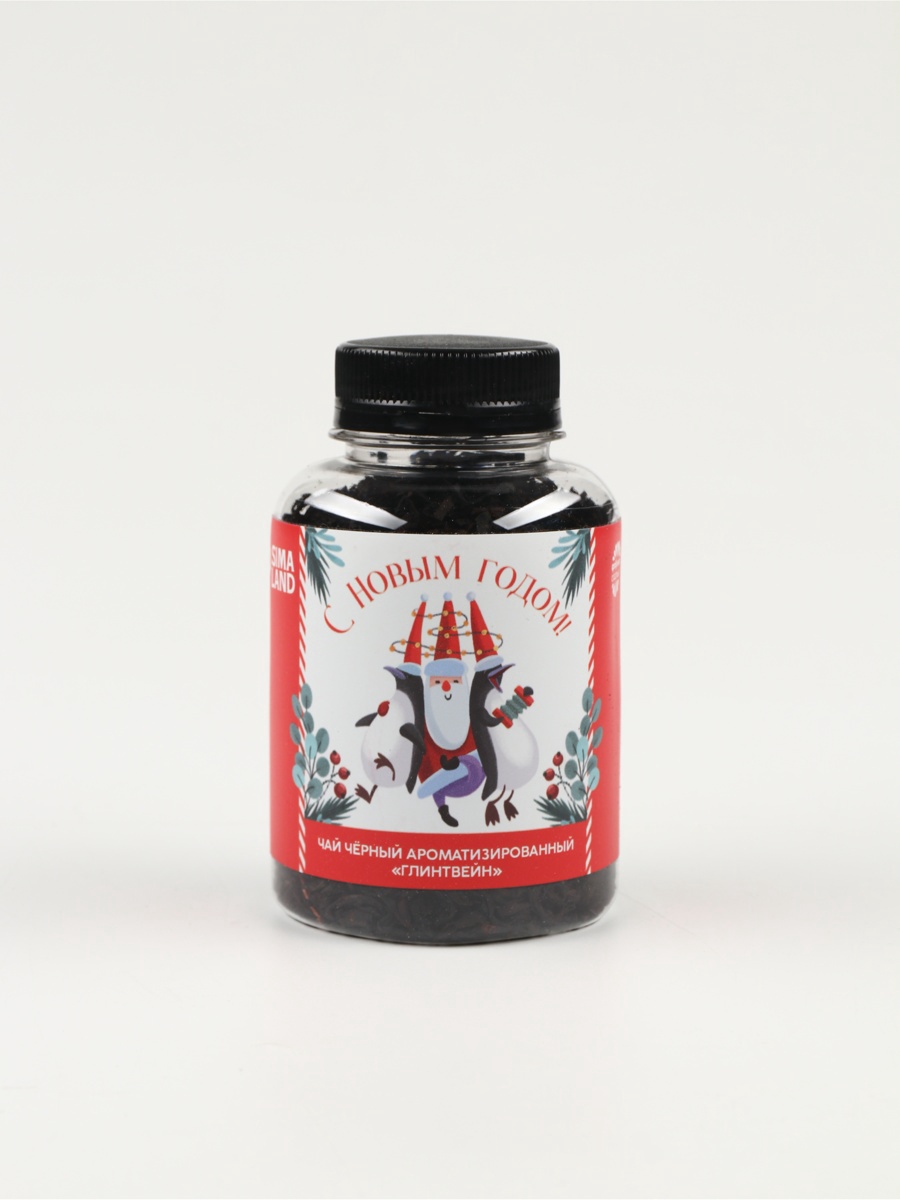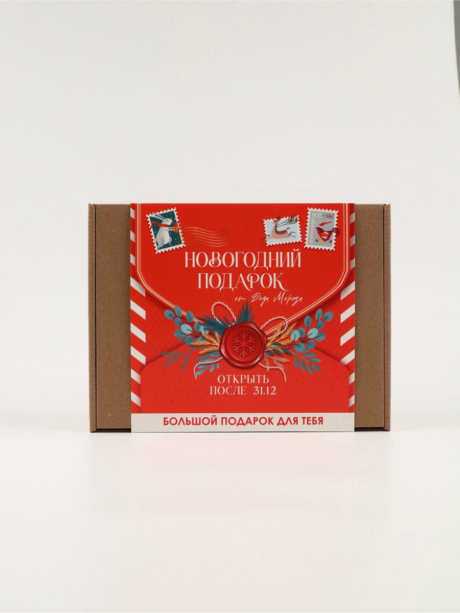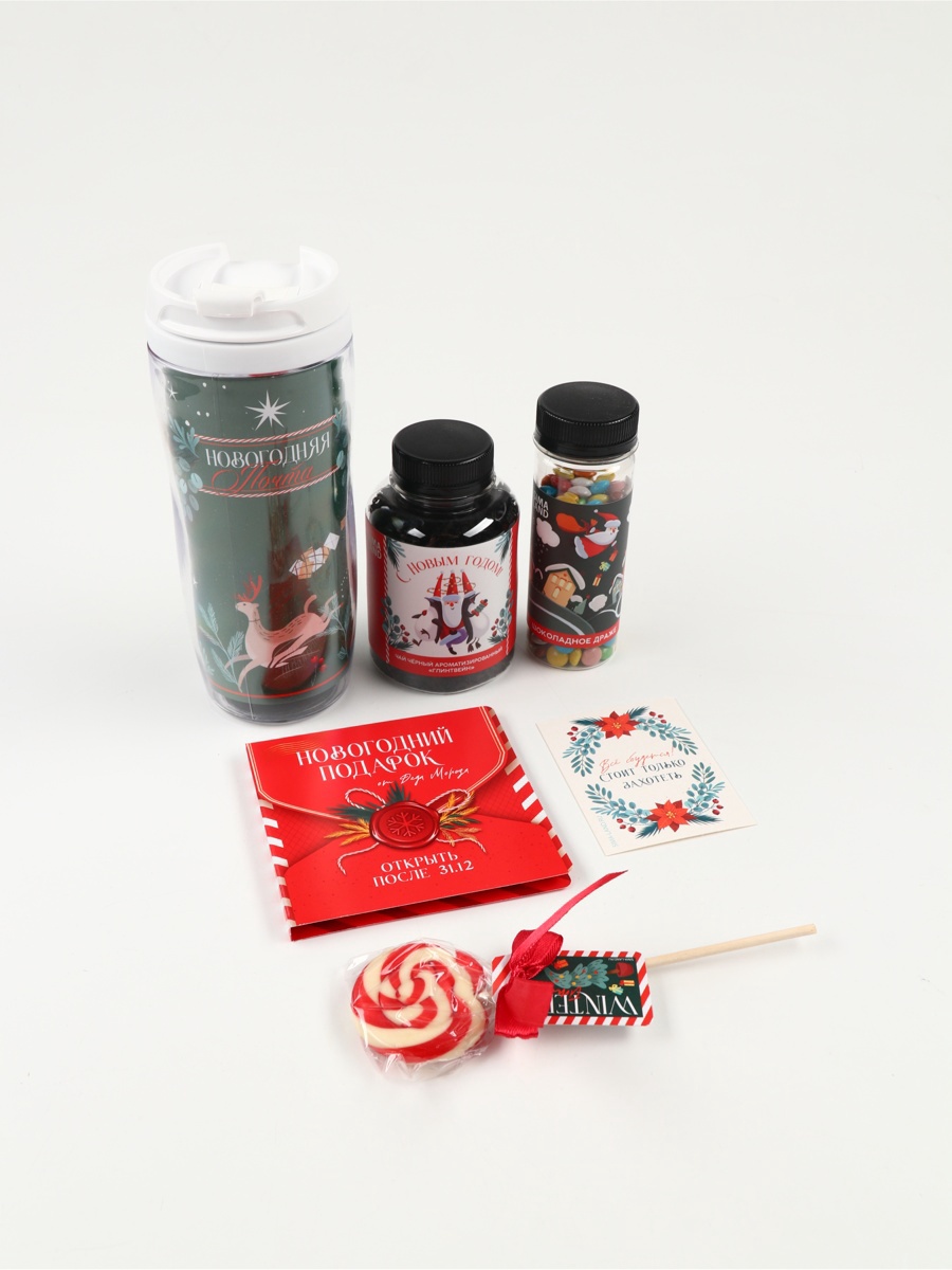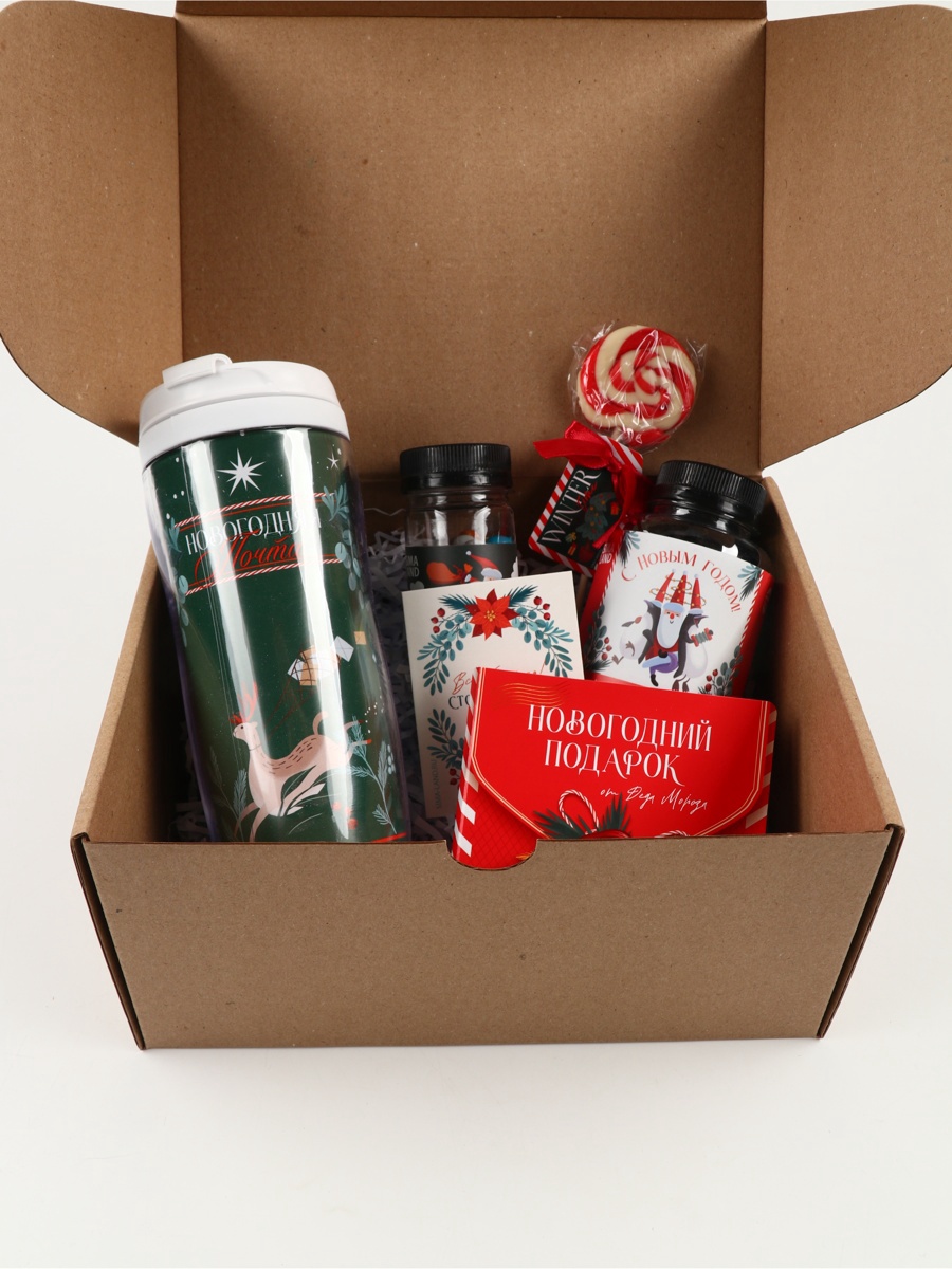 Подарочный набор гифтбокс «новогодний подарок»: термостакан, чай, леденец, драже, молочный шоколад.