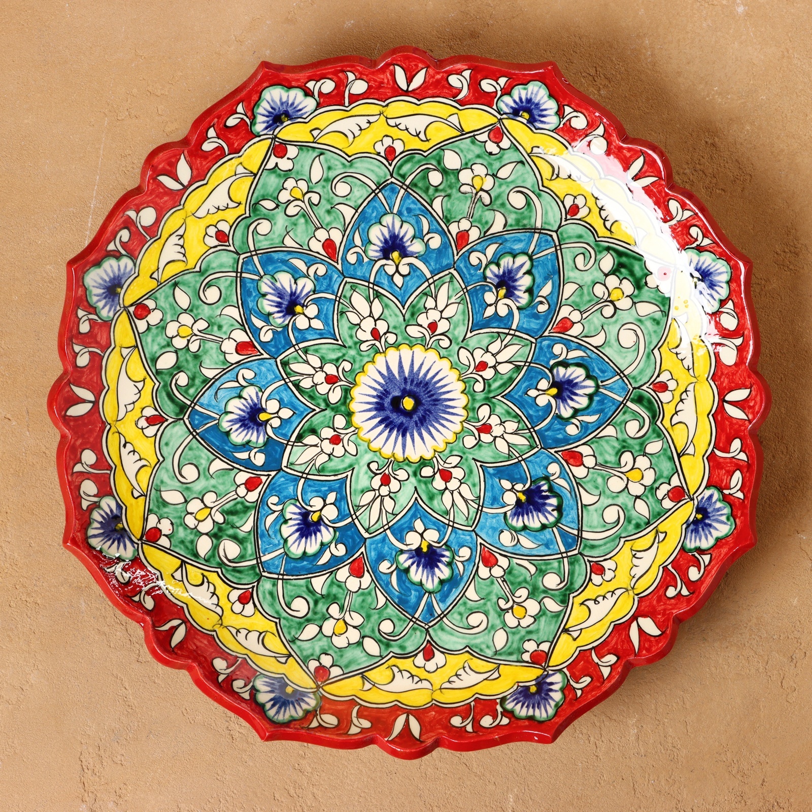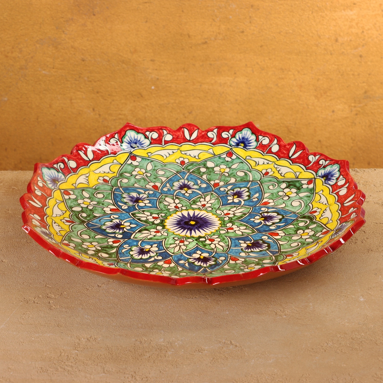 Ляган риштанская керамика "цветы", 32 см, красный микс, рифлённый