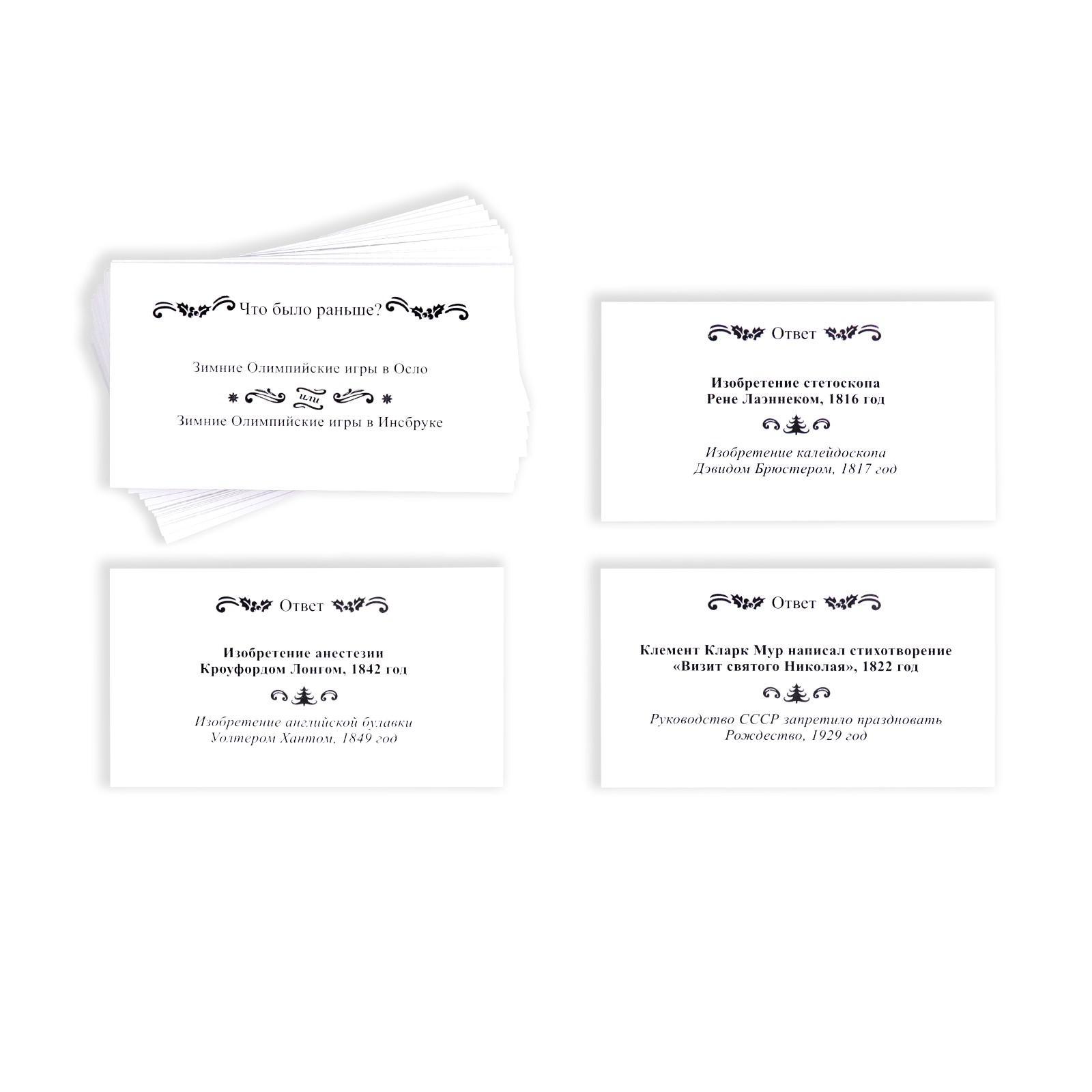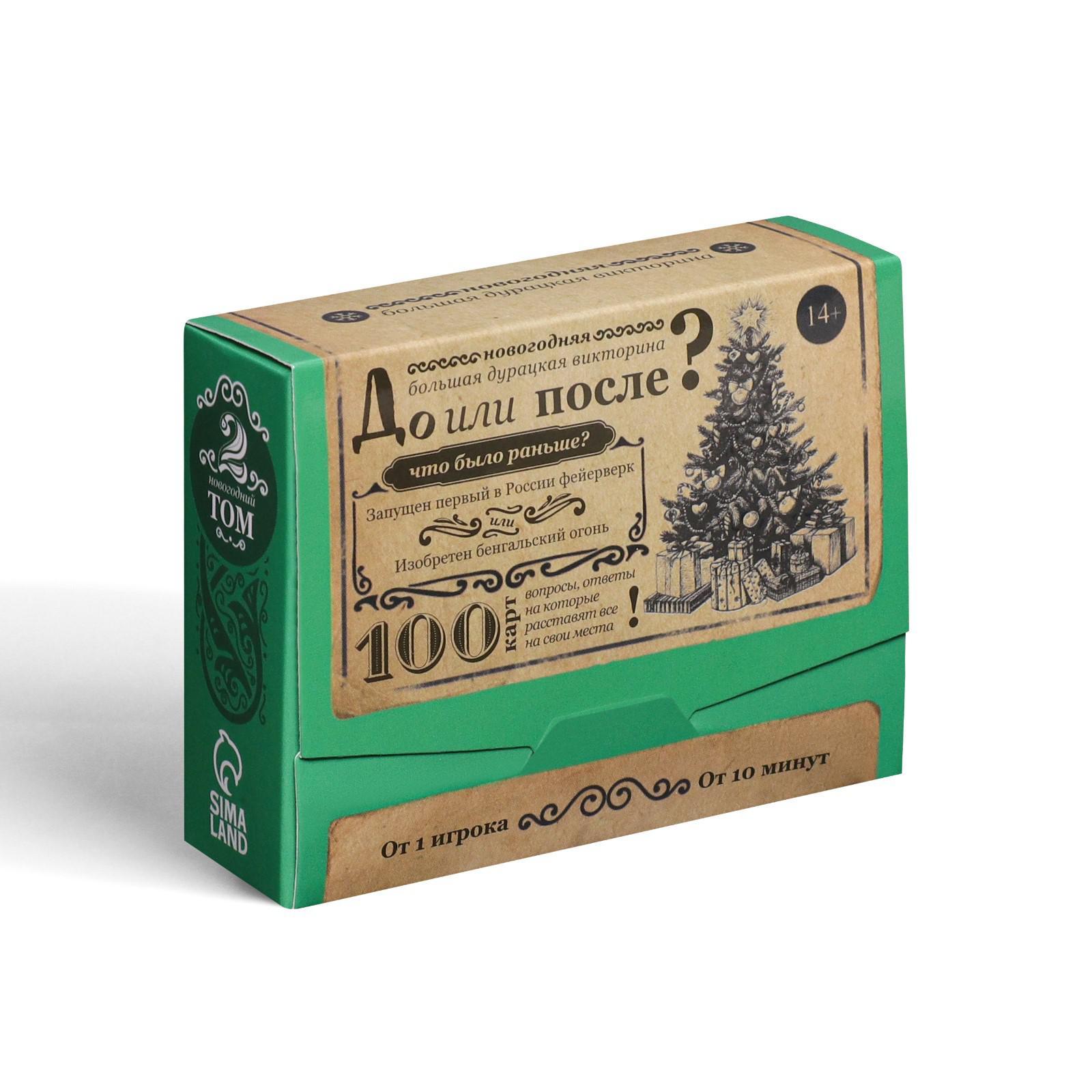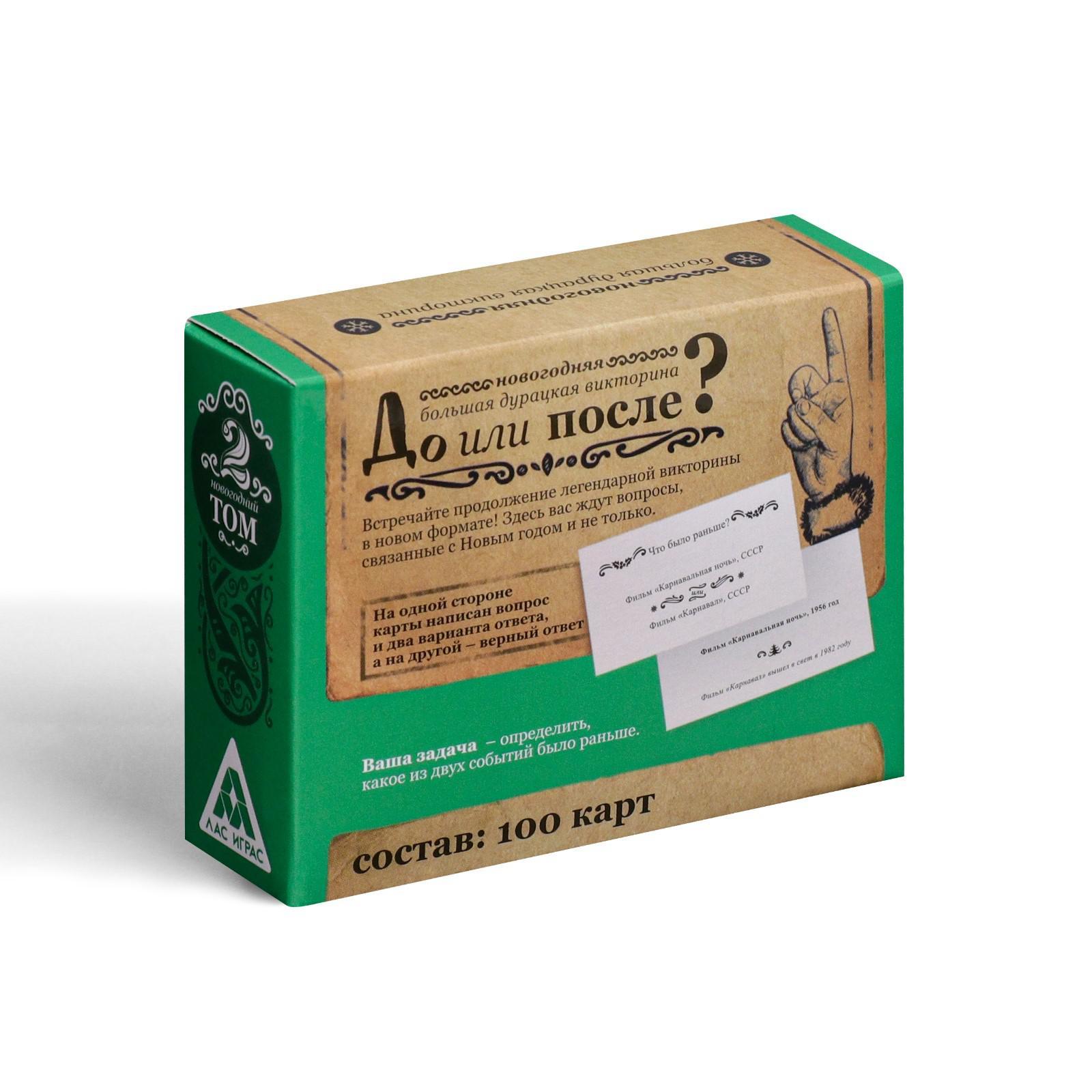 Новогодняя настольная игра «новый год: большая дурацкая викторина. до или после», 100 карт, 14+. Вопросы, ответы на которые расставят всё на свои места Встречайте продолжение легендарной викторины в новом формате. Здесь вас ждут вопросы, связанные с Новым годом и не только. На одной стороне карточки написан вопрос и два варианта ответа. Ваша задача — определить, какое из двух событий было раньше. Чтобы проверить себя или другого участника, просто переверните карту. Там находится ответ и небольшая пояснительная информация. Состав: 100 карт. Встречайте Новый год вместе с ЛАС ИГРАС! Возраст:От 14 лет|Символ года:Нет|Тематика праздника:Новый год|Возраст:Детский|Материал:Картон|Материал:Бумага|Количество игроков:От 1 игрока|Время игры:10 минут|Жанр игры:Карточная|Жанр игры:Викторины|Жанр игры:Семейная|Количество игроков:1 - 10|Материал:Картон|Страна:Китай  развернуть описание ▼
