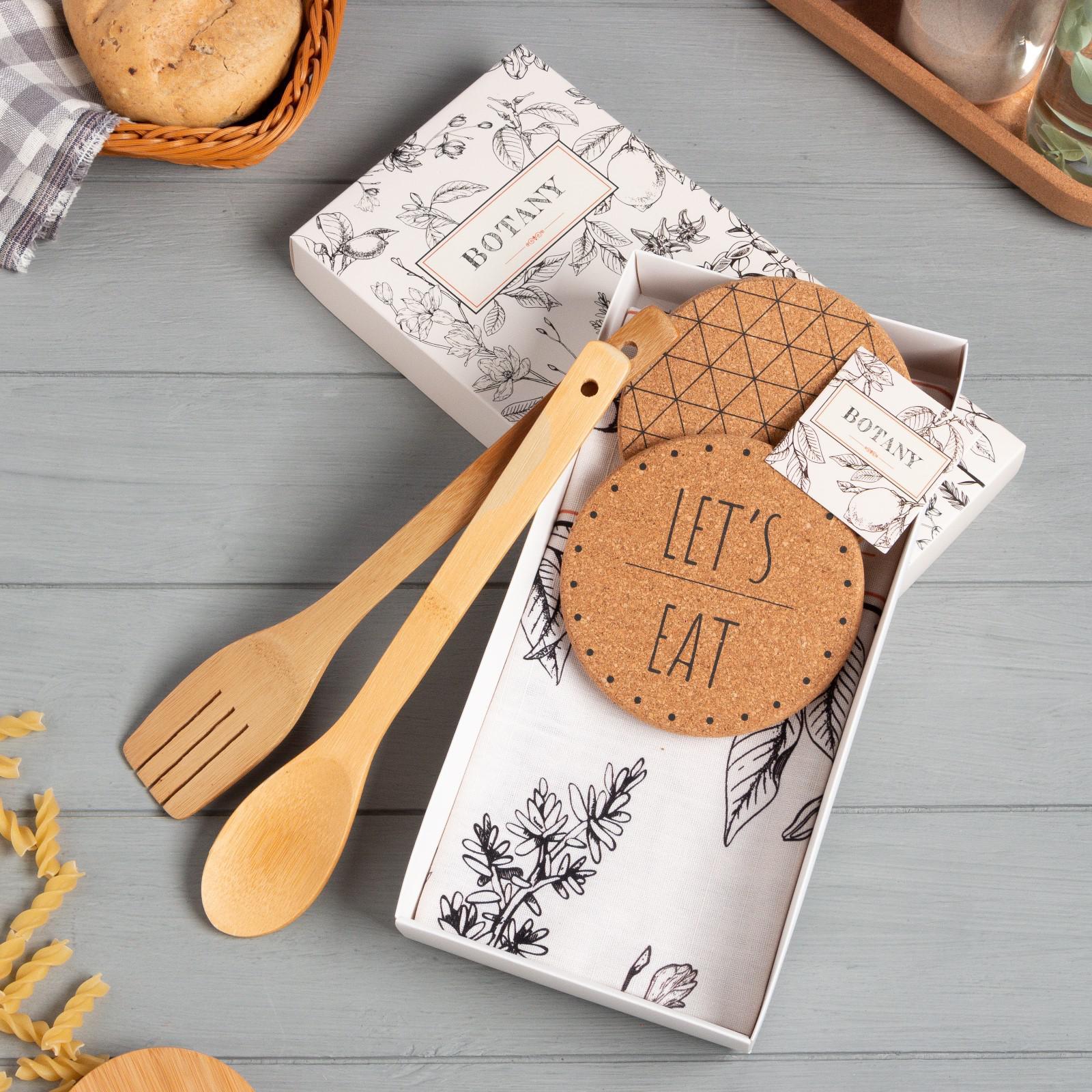 Набор подарочный botany: полотенце, подставки, кухонная ложка, кухонная лопатка. Подставка пробковая d=12 см - 2 шт. Ложка и ложка кухонная 25 см, бамбукНабор:Да|Цвет:Белый|Цвет:Коричневый|Форма:Прямоугольная|Форма:Фигурная|Ткань:Репс|Плотность, г/м :210|Размер, см:40 х 73|В наборе, шт.:5|Вид упаковки:Коробка картонная с PVC|Тематика праздника:8 Марта|Адресат:Женщине|Декоративные элементы:Без элементов|Рекомендации по уходу:Бережный режим глажки|Рекомендации по уходу:Стирка при 30 °С|Рекомендации по уходу:Не отбеливать|Состав ткани:Хлопок|Составляющие набора:Полотенце|Составляющие набора:Ложка кухонная|Составляющие набора:Подставка под горячее|Составляющие набора:Кухонная лопатка|В подарочной упаковке:Да|Страна:Россия  развернуть описание ▼