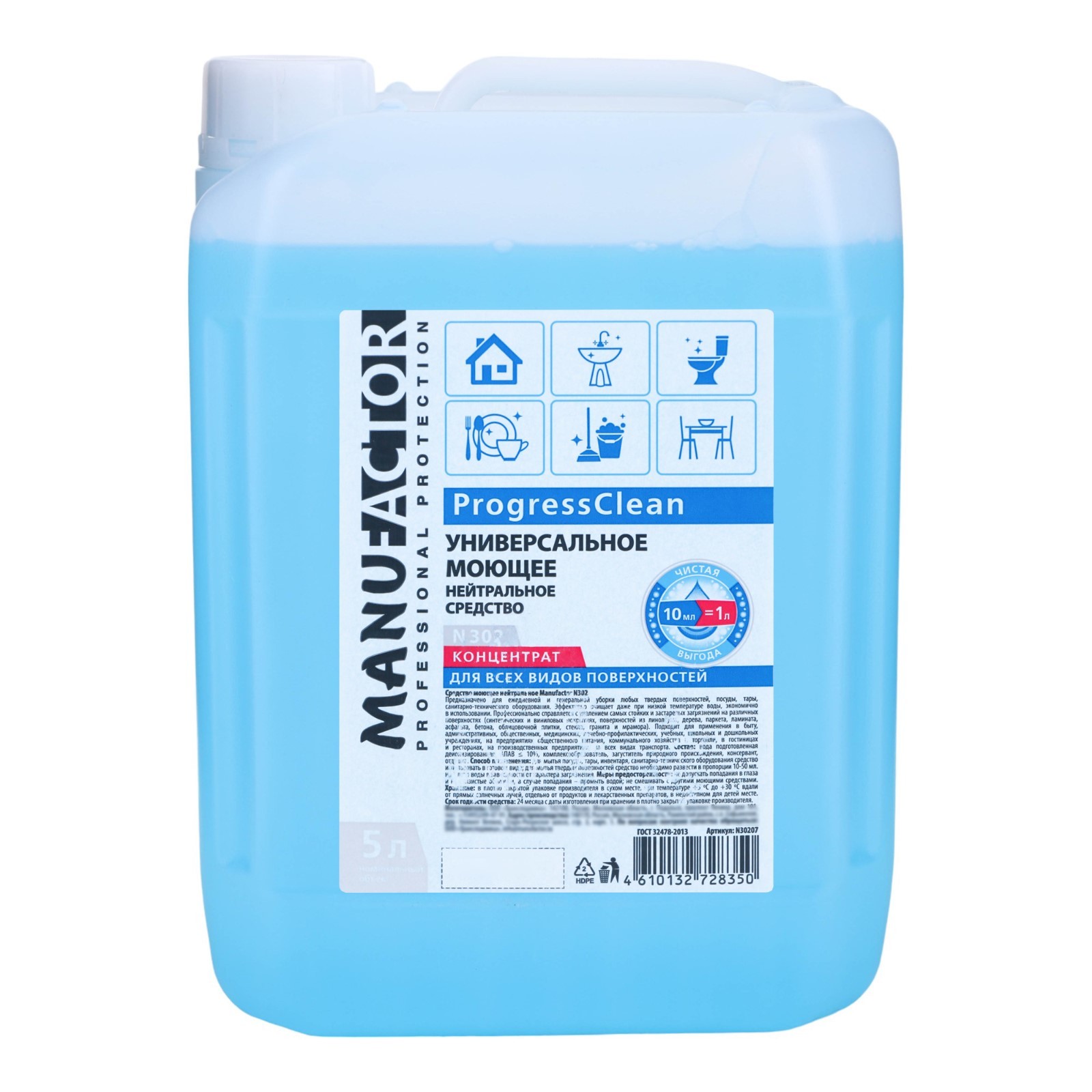 N302 универсальное моющее нейтральное средство "manufactor" концентрат, пвх, 5 л.   Универсальное моющее нейтральное средство предназначено для мытья и обезжиривания посуды, кухонного инвентаря и тары, сантехники, плитки, полов, стен, других влагостойких поверхностей.  Способ применения: для ручной очистки влагостойких поверхностей использовать разбавленный раствор в соотношении 40-60 мл концентрата на 1 л воды, хорошо вымочить салфетку в приготовленном растворе, обработать поверхность, промыть чистой водой, вытереть насухо; для мытья посуды нанести средство на губку, обработать поверхность посуды, смыть водой.  Вес, г/Объём, мл: 5000 : 0 Температурное ограничение: Нет  развернуть описание ▼