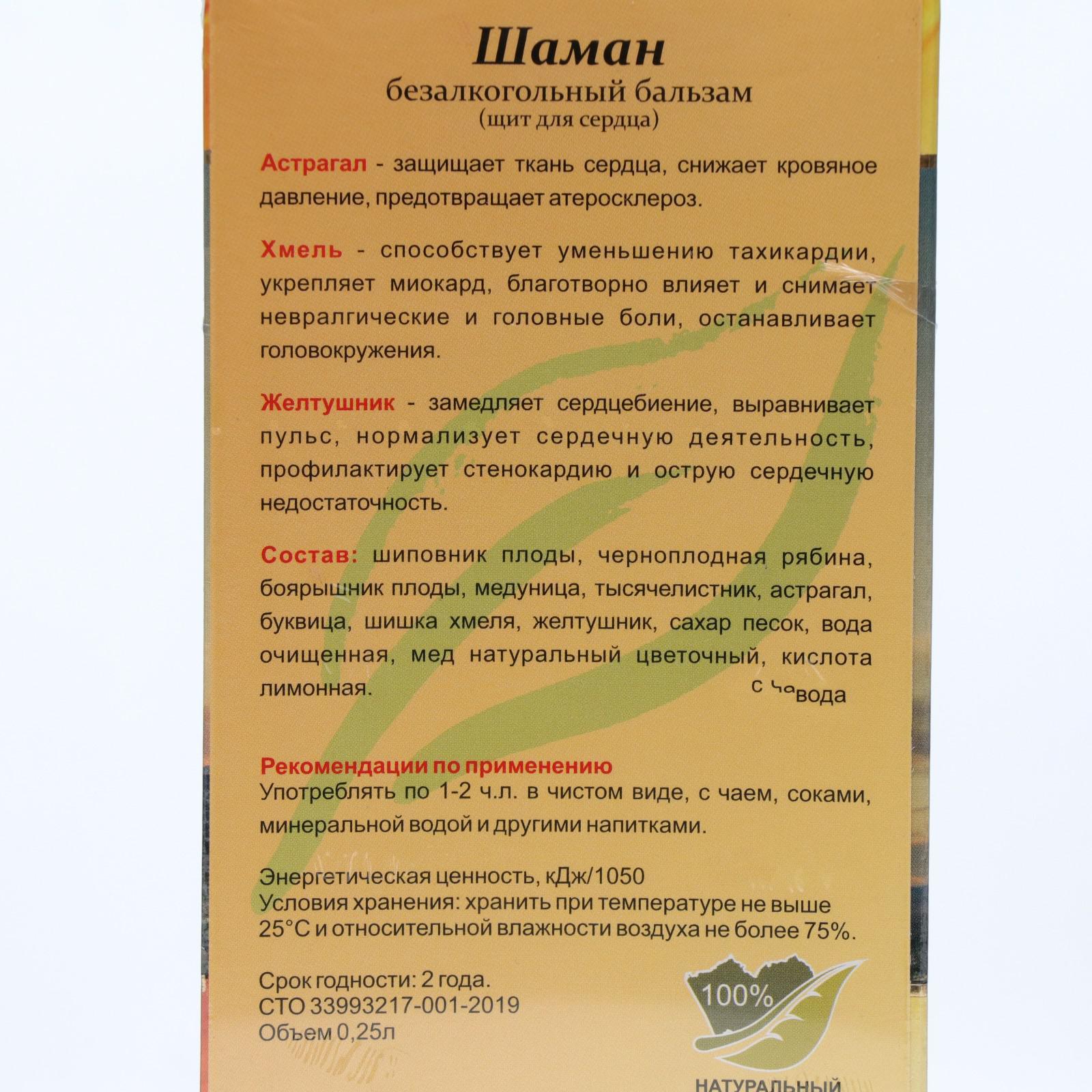 Бальзам шаман щит для сердца, 250 мл. В состав бальзама входят такие травы как «Астрагал» - защищает ткани сердца, снижает кровяное давление, предотвращает атеросклероз; «Хмель» - способствует уменьшению тахикардии, укрепляет миокард, благотворно влияет и снимает неврологические и головные боли, останавливает головокружения; «Желтушник» - замедляет сердцебиение, выравнивает пульс, нормализует сердечную деятельность, обеспечивает профилактику стенокардии и острую сердечной недостаточности. Назначение: профилактика сердечных заболеваний. Способ употребления: 1-2 ч. л. добавлять в чай, кофе, молоко, сок и другие жидкости течении дня. Состав: шиповник, черноплодная рябина, боярышник, медуница, тысячелистник, астрагал, буквица, шишка хмеля, желтушник. Противопоказания: противопоказаний нет, не рекомендуется людям с сахарным диабетом. Вес, г/Объём, мл: 250 : 0 Температурное ограничение: Нет Назначение: Для сердца и сосудов Форма выпуска: Бальзам Показания: Укрепление сердечно-сосудистой системы Компоненты: Астрагал Компоненты: Хмель Действие: Общеукрепляющее Действие: Успокоительное  развернуть описание ▼