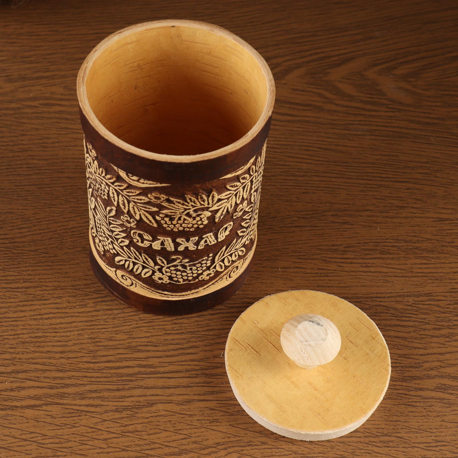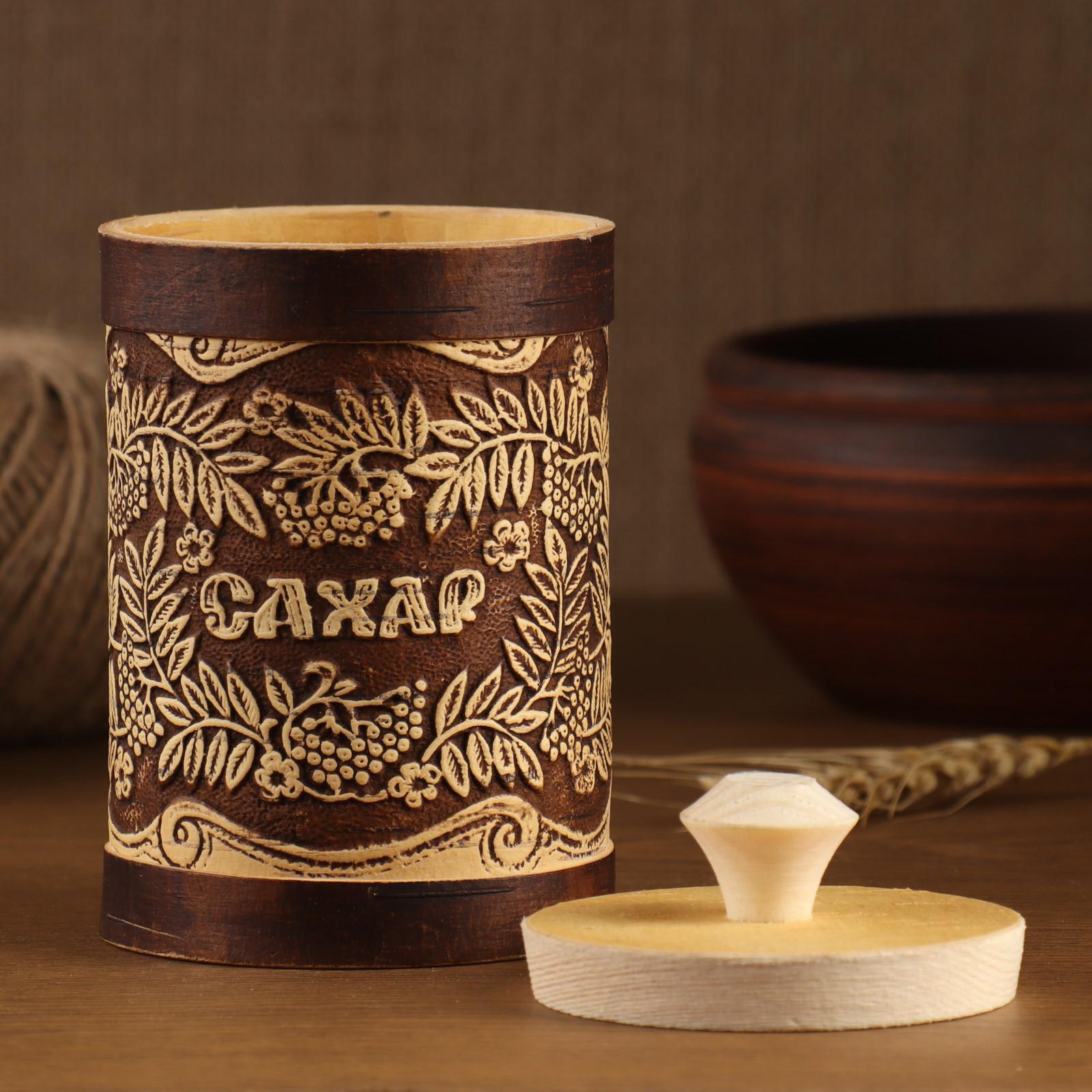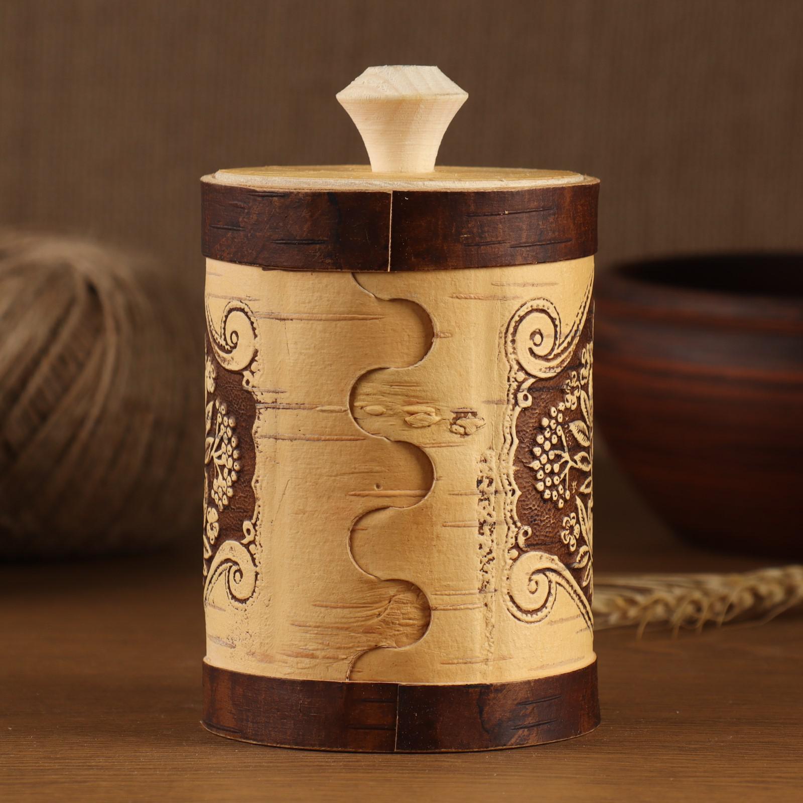 Туес "гроздья рябины" д8см, сахар, береста. Туес из бересты – практичный и лаконичный выбор для вашей кухни! Изделие выполнено из экологически чистого сырья, которое идеально подходит для хранения продуктов. Береста является природным антисептиком и прекрасно впитывает влагу. Продукты в такой посуде дольше сохраняют свою свежесть и вкусовые качества, в ней не заводятся насекомые и не размножаются бактерии. Изготовлено из натуральной коры берёзы вручную российскими мастерами. Цвет: Коричневый Цвет: Бежевый Форма: Цилиндрическая Объём, л: 0.2 Крышка: Да Материал крышки: Дерево Вид дерева: Берёза Материал: Береста Из натурального дерева: Да Покрытие: Воск Герметичная крышка: Нет Тип нанесения рисунка: Тиснение Ручная работа: Да Объём: 100 мл - 300 мл Температурное ограничение: Нет Можно мыть в посудомоечной машине: Нет Текстура: С рельефом Назначение: Для специй Особенности: Без особенностей Форма: Круг, шар, цилиндр  развернуть описание ▼