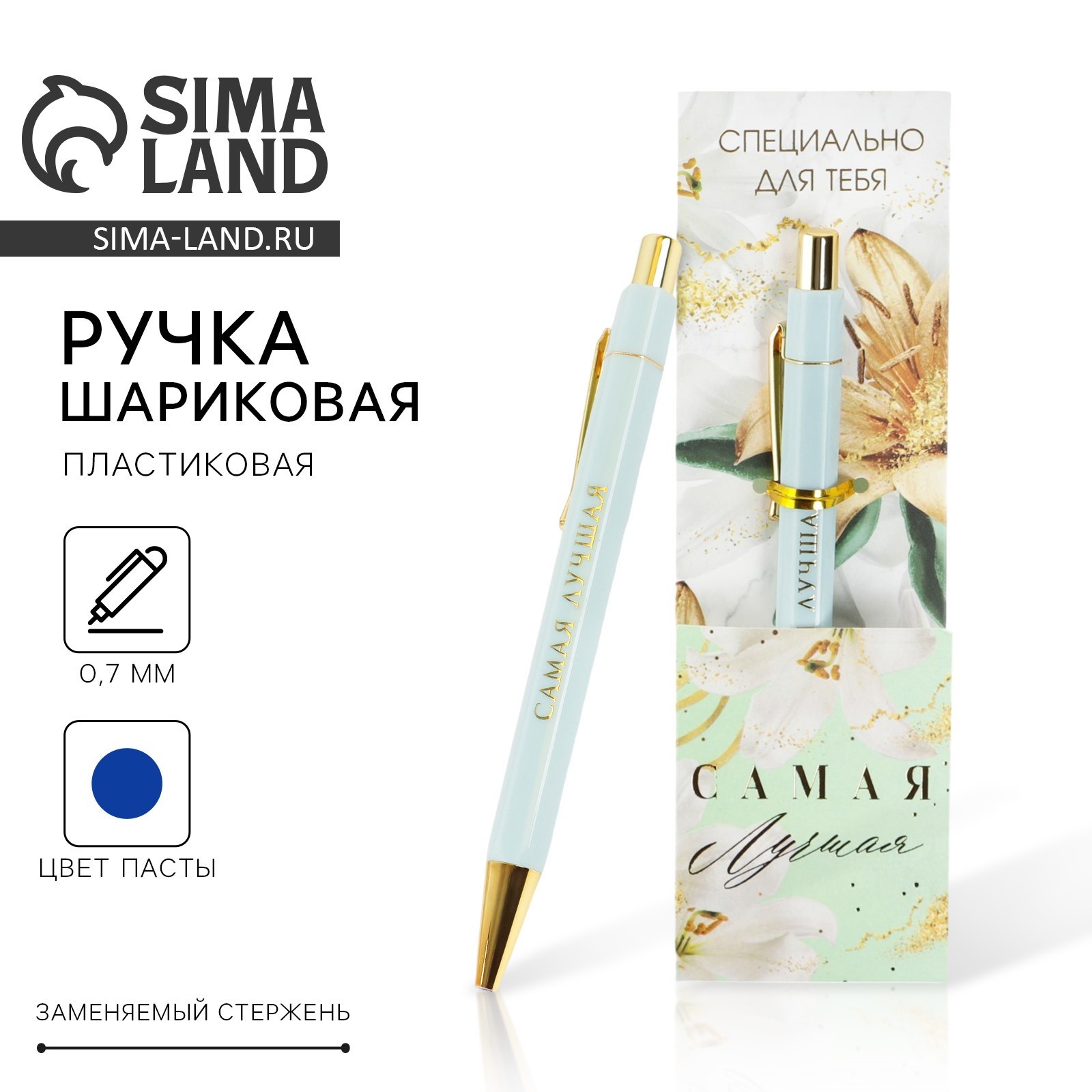 Ручка шариковая, синяя паста, 0.7 мм «самая лучшая». Ручка отличное дополнение к подарку. Яркий дизайн несомненно привлечет внимание и будет выделяться среди других предметов, а удобная форма корпуса позволит использовать ее с комфортом. Стержень заменяемый: да;Материал: пластик.Диаметр пишущего узла, мм:0.7|Набор:Нет|Цвет стержня:Синий|Европодвес:Нет|Вид упаковки:Подложка|Тематика праздника:8 Марта|Адресат:Без адресата|Материал:Пластик|Материал упаковки:Картон|Составляющие набора:Ручка|Штрихкод на единице товара:Нет|Наличие грипа:Нет|Страна:Китай  развернуть описание ▼