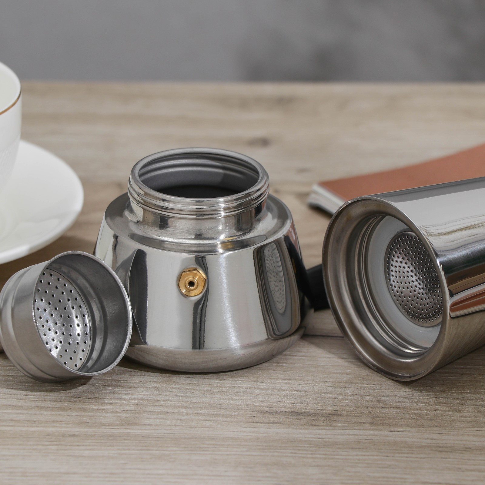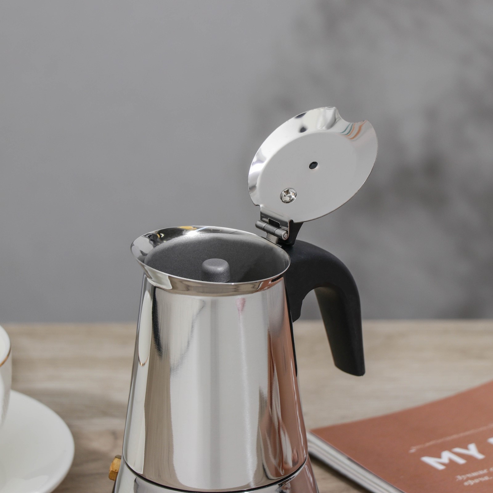 Кофеварка гейзерная magistro classic, на 2 чашки, 100 мл, нержавеющая сталь. Как приготовить самый вкусный кофе в гейзерной кофеварке? Для начала отвинтите верхнюю часть и достаньте фильтр-воронку. Налейте в нижний резервуар воды до уровня предохранительного клапана. Важно: клапан должен остаться над водой – это нужно для того, чтобы в случае перегрева кофеварки давление в нижнем резервуаре не превысило критической отметки. Наполните воронку молотым кофе. Обязательно учитывайте, что необходим помол именно для гейзерной кофеварки. Вставьте воронку в нижний резервуар, уберите излишки кофе с бортиков, чтобы они не прилипли к уплотнителю, и крепко прикрутите верхнюю часть на место. Поставьте кофеварку на плиту. Маленький секрет: варите кофе на медленном огне – лучше подождать на пару минут дольше, но получить идеальный кофе. Когда вы и увидите, что кофе полностью вышел в верхний резервуар, а из столбца выходит уже не кофе, а жидкая пена, снимите кофеварку с огня. Ваш свежесваренный и ароматный кофе готов! С ним утром будет по-настоящему добрым. Цвет: Хромированный Количество чашек: 2 Объём, мл: 100  развернуть описание ▼