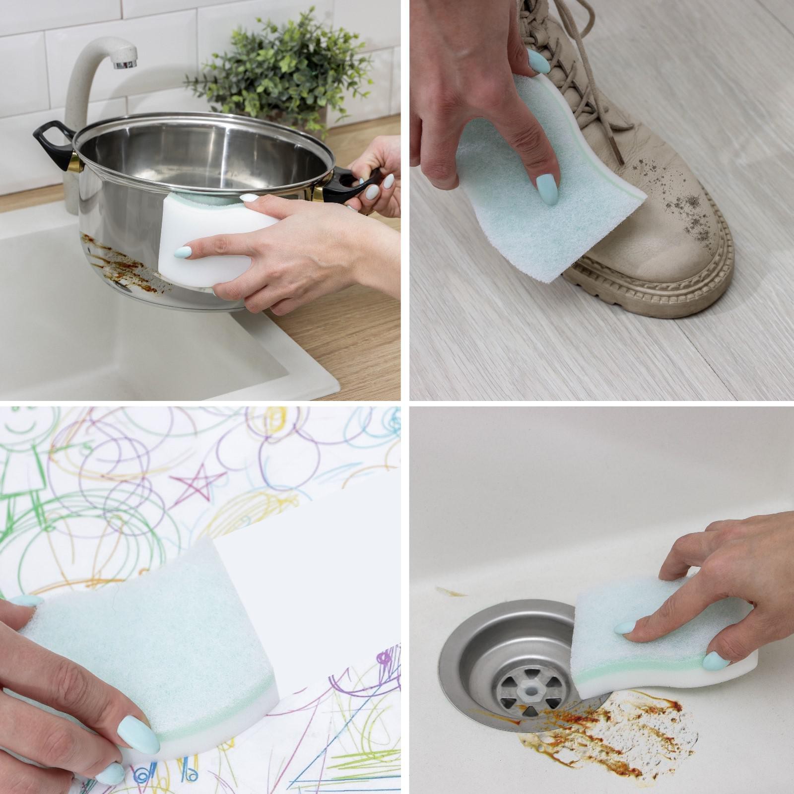 Губка меламиновая «тройной эффект», 3 слоя: меламин, поролон, абразив, 11x7x3 см. Меламиновая губка - незаменимое средство уборки в современном доме. Губка легко справится со многими загрязнениями без использования химии. Материал: Меламин — пластик нового поколения, который выглядит как самая обычная губка, но имеет совершенно другую структуру. На ощупь он больше напоминает тонкую наждачную бумагу, но, что важно, не царапает очищаемые поверхности. Преимущества: Губка не имеет запаха и позволяет с легкостью очистить обувь (особенно эффективно на светлой подошве), сантехнику, пластиковые окна, керамическую плитку, бытовую технику и другие поверхности. Меланиновая губка легко удалит налет и пятна ржавчины, жирных пятен, плесени. Имеется абразивный слой. Как использовать: Можно использовать как сухую, так и влажную губку. Если вы решили её намочить, обратите особое внимание на процесс отжима: легонько сожмите губку между ладоней, ни в коем случае не перекручивая. Затем проведите ею по месту загрязнения. При необходимости повторите процедуру. Советы по эксплуатации: Со временем губка истирается, пользуйтесь её кончиком или отрежьте часть и произведите чистку ею. Не используйте губку для чистки посуды. При чистке эмалированных или лаковых поверхностей проведите небольшой тест на малозаметном участке. Не использовать с бытовой химией. Цвет: Голубой Цвет: Белый Размер, см: 11 х 7 Вид: Губка/мочалка Материал: Абразив Материал: Меламин  развернуть описание ▼