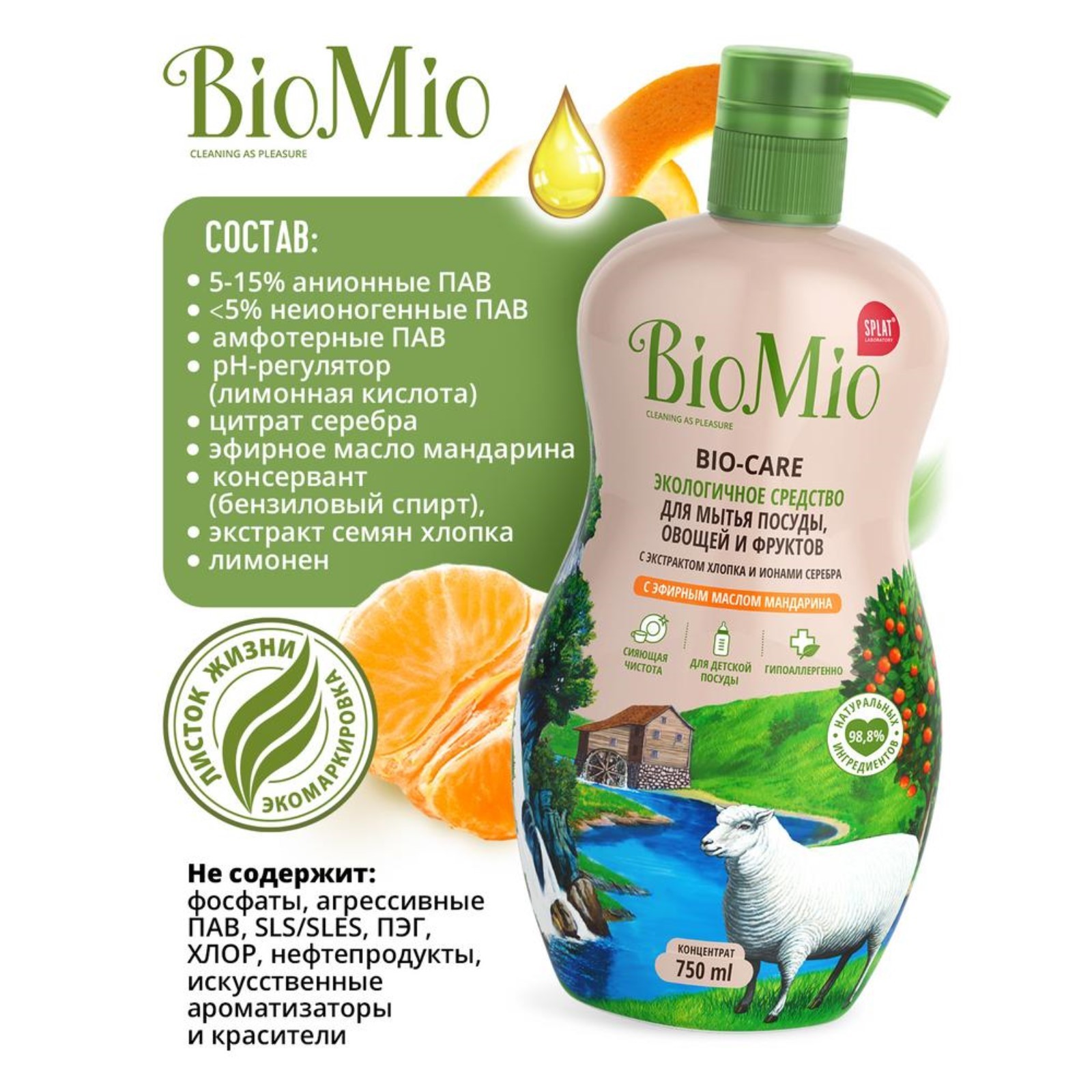 Средство для мытья посуды, овощей и фруктов Biomio Bio-care "мандарин", концентрат, 750 мл
