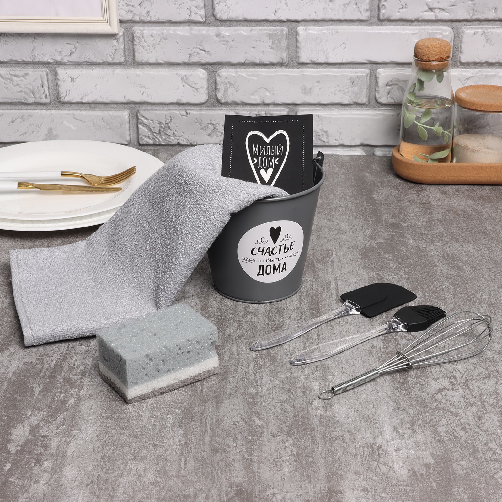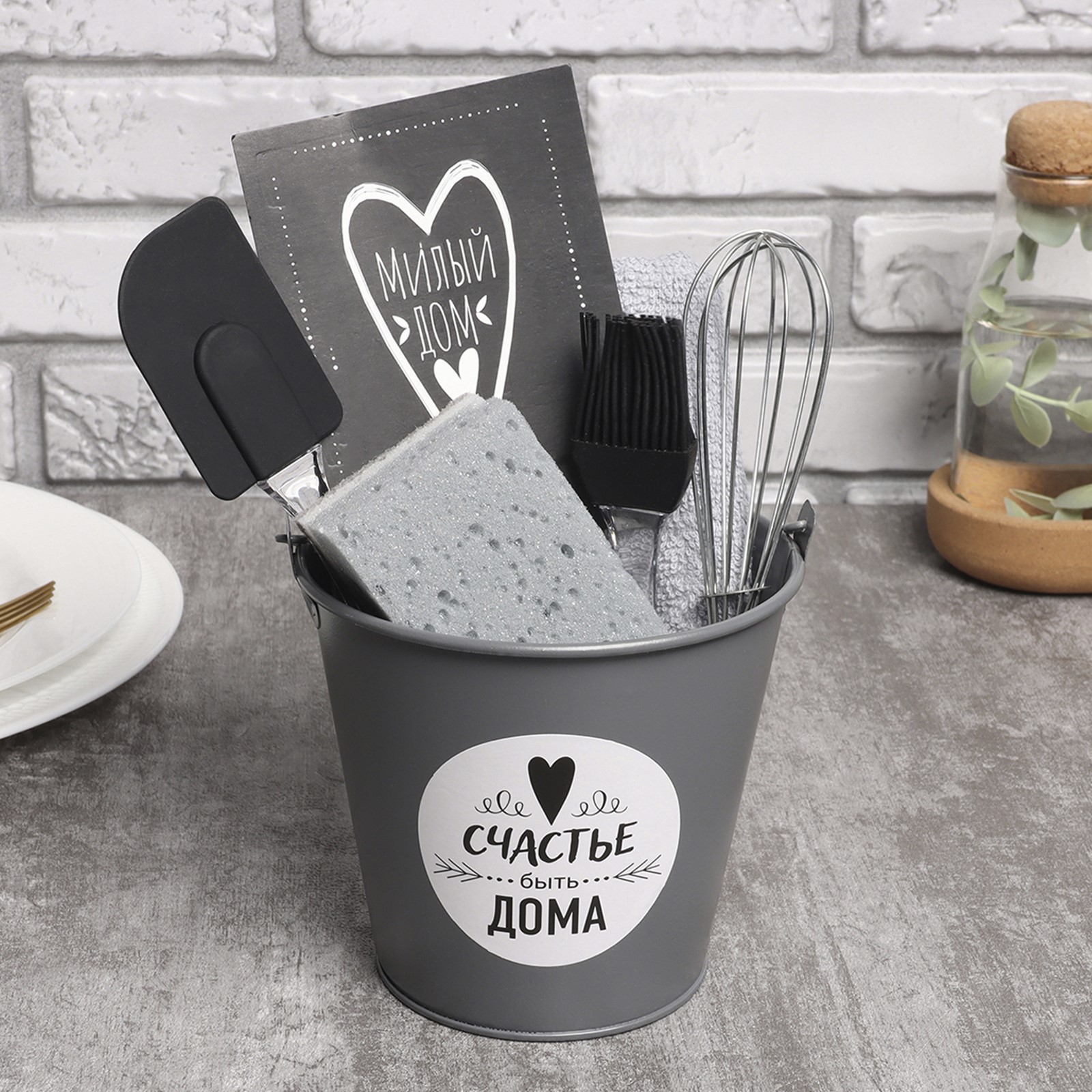 Набор подарочный «милый дом»: ведро, полотенце 35 60, лопатка, кисть, венчик, губка. Набор:Да|Цвет:Серый|Форма:Фигурная|Форма:Прямоугольная|Ткань:Вафельное полотно|Плотность, г/м :220|Размер, см:35 х 60|Размер, см:18 х 3.5|Размер, см:8.5 х 5.5|Размер, см:19 х 3.5|В наборе, шт.:5|Тематика:Надписи, цифры, буквы|Вид упаковки:Термоусадочная плёнка|Тематика праздника:8 Марта|Тематика праздника:14 Февраля|Декоративные элементы:Без элементов|Рекомендации по уходу:Не отбеливать|Рекомендации по уходу:Стирка при 40 °С|Рекомендации по уходу:Барабанная сушка при низкой температуре|Состав ткани:Хлопок|Составляющие набора:Кулинарная кисть|Составляющие набора:Кухонная лопатка|Составляющие набора:Полотенце|Составляющие набора:Губка для мытья посуды|Составляющие набора:Венчик|Страна:Россия  развернуть описание ▼