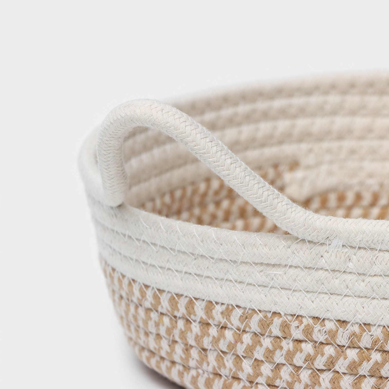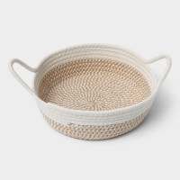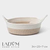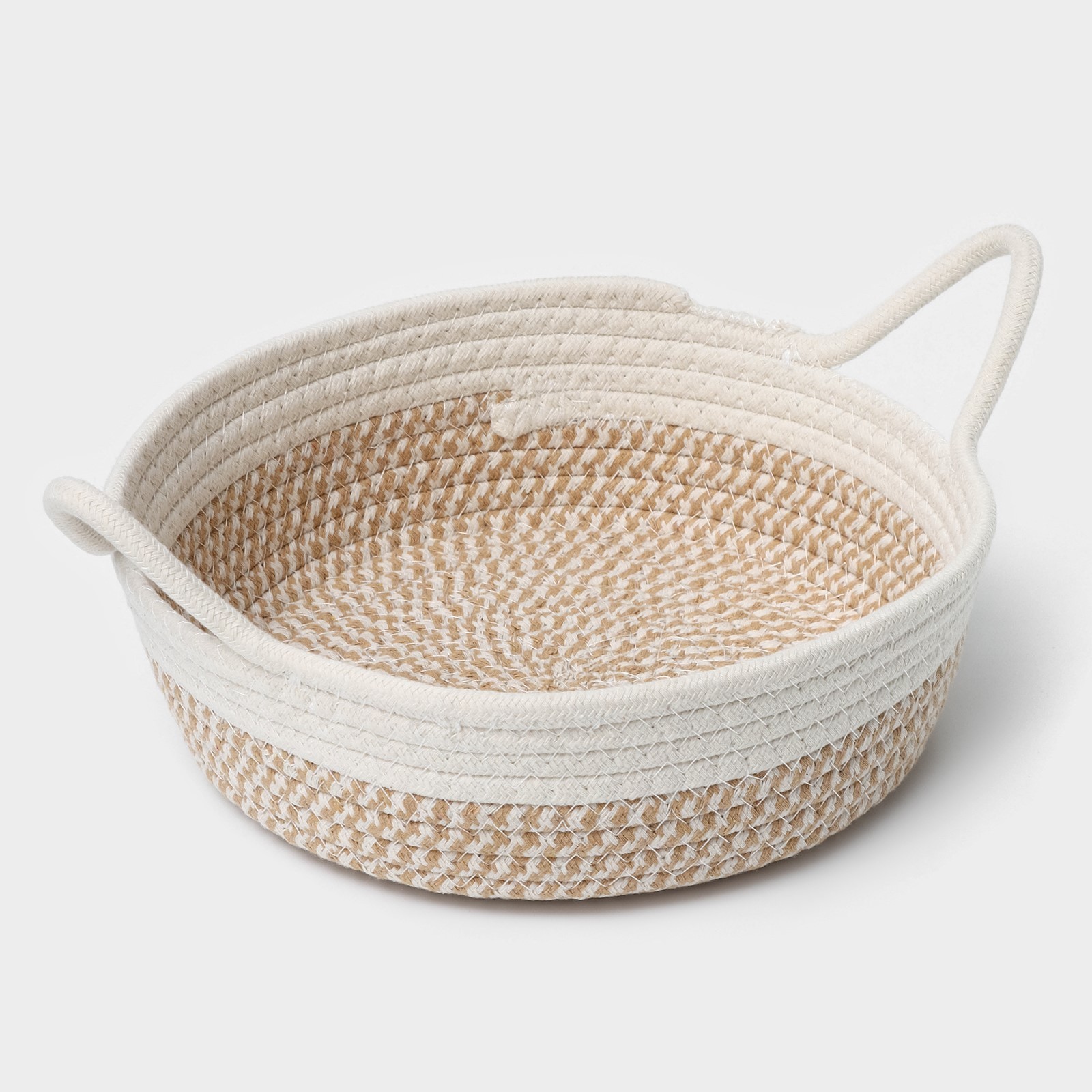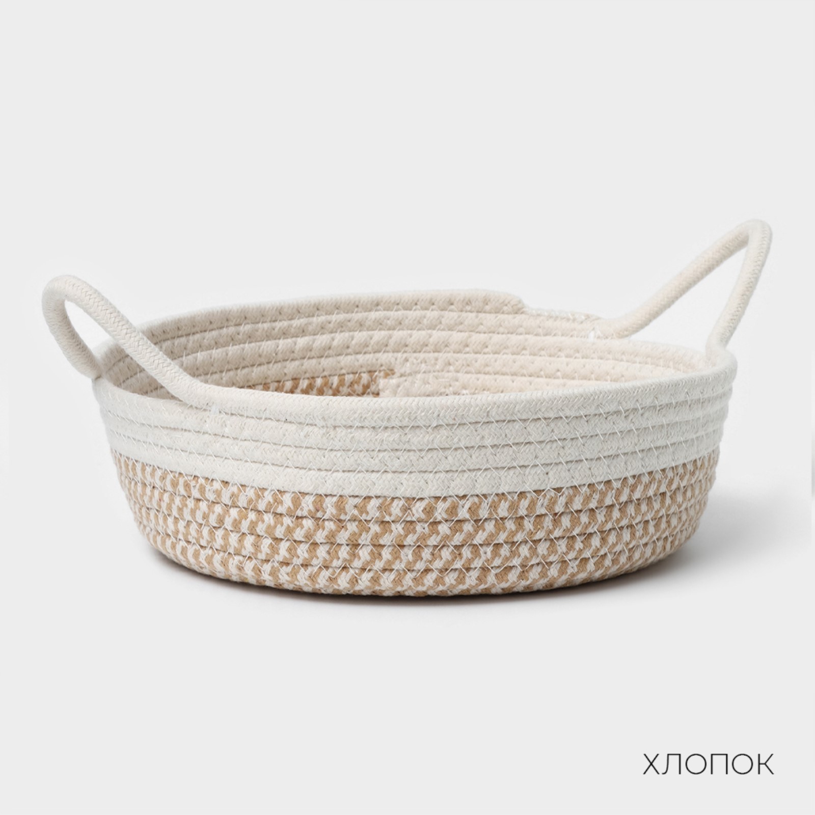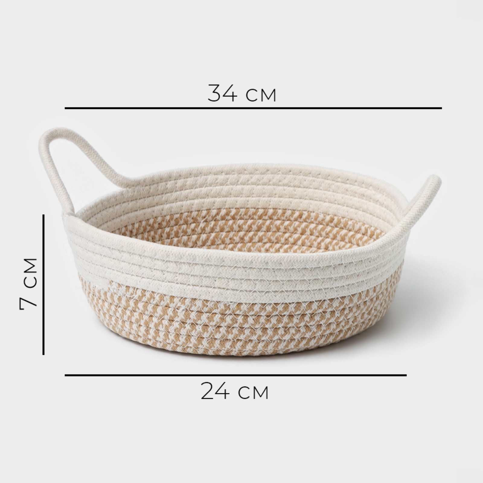 Array. Представляем вам универсальную корзину для хранения вещей, которая станет незаменимым аксессуаром в вашем доме! Она идеально подходит для хранения и впишется в интерьер любой комнаты. Преимущества: Уникальность наших корзинок в том, что все изделия – ручной работы. Корзинка изготовлена из экологичного материала. Дизайн корзины подойдет для интерьеров в стиле: скандинавский, рустик, лофт, этно, фьюжен, фьюжн, кантри, деревенский, бохо, афро, шале. Такие корзины хорошо комбинировать натуральными материалами – текстиль, керамика, камень, кирпич. Получится уютный и вместе с тем динамичный интерьер. Применение: Милая интерьерная корзинка прекрасно подходит для размещения в прихожей или гардеробной. Она станет удобным и стильным органайзером для одежды, шапок и других головных уборов, белья. На кухне корзину можно использовать для хранения полотенец, хозяйственных принадлежностей, бытовой химии или даже продуктов. В корзинке можно компактно и эстетично разместить пряжу и другие принадлежности для рукоделия, вязания, шитья, швейные инструменты и нитки, а также разнообразные ткани и материалы для творчества. В детской комнате подойдет для хранения игрушек. Корзинка станет замечательным офисным аксессуаром для комфортного размещения книг, журналов и канцелярских принадлежностей. Уход и эксплуатация: Не рекомендуем стирать корзину в стиральной машине. Для устранения местных загрязнений используйте теплую воду, мыло (средство для посуды) и мягкую губку или щетку, но не рекомендуется сильно мочить корзинку. Выбирайте предметы интерьера, которые вдохновляют и делают вас счастливыми. Закажите корзину для хранения на нашем сайте и начните преображение своего дома уже сегодня! Цвет: Бежевый Форма: Круглая Ширина, см: 34 Высота, см: 7 Глубина, см: 24 Крышка: Нет Материал: Хлопок Основной материал: Текстиль Форма: Круг, шар, цилиндр  развернуть описание ▼