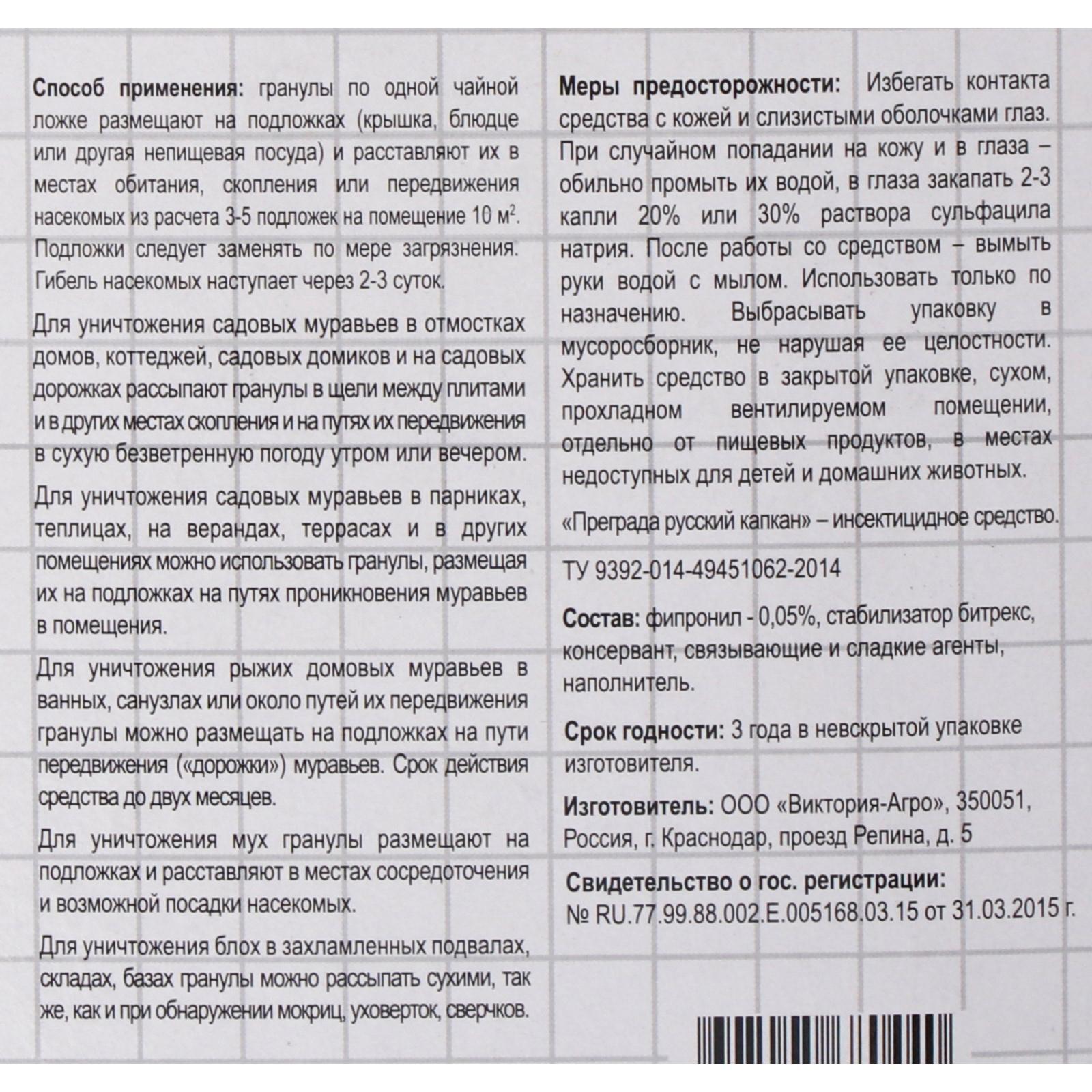 Гранулы от муравьев "капкан", 100 г. Препарат (в гранулах) от садовых и рыжих домовых муравьев, мокриц, блох, тараканов, сверчков, мух полностью уничтожает насекомых за 3-5 дней. Препарат может использоваться в жилых помещениях и вне дома (в парниках, теплицах, на террасах и в саду). Способ применения: по 1 чайной ложке гранул разместить на подложках (крышка, блюдце, другая непищевая посуда) и расставить на пути передвижения тараканов, муравьев. Расход - 3-5 подложек на 10 кв. м. Для уничтожения садовых муравьев в отмостках домов и на садовых участках рассыпать гранулы в щели между плитами в сухую погоду утром. Состав: фипронил - 0, 05%, битрекс (горечь), консервант, связывающие и сладкие агенты, наполнитель.