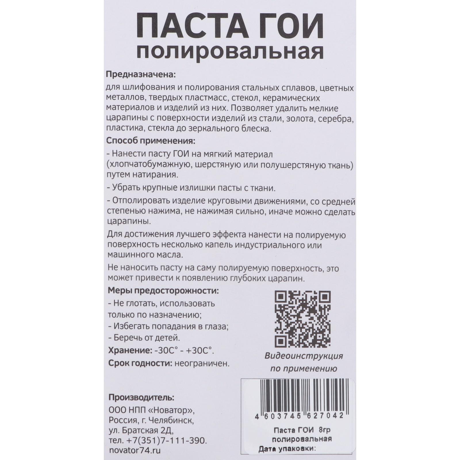 Чистящее средство гои , "паста для полирования", блистер, 8 г. Чистящие средство предназначен для шлифования и полирования стальных сплавов, цветных металлов, твердых пластмасс, стекл, керомических материалов и изделий из них. Позволяет удалить мелкие царапины с поверхности изделий из стали, золота, серебра, пластика, стекла до зеркального блеска. Способ применения: нанести пасту ГОИ на мягкий материал ( хлопчатобумажную, шерстяную или полушерстяную ткань) путем натирания. Убрать крупные излишки пасты с ткани. Отполировать изделие круговыми движениями, со средней степенью нажима, не нажимая сильно, иначе можно сделать царапины. Для достижения лучшего эффекта нанесите на полируемую несколько капель индустриального или машинного масла. Не наносить пасту на саму полируемую поверхность, это может привести к появлению глубоких царапин. Меры предосторожности: не глотать, использовать только по назначению. Избегать попадания в глаза. Беречь от детей. Хранение -30 °C - + 30 °C. Срок годности неограничен. parts count: 0 Вес, г: 8 Температурное ограничение: Нет  развернуть описание ▼
