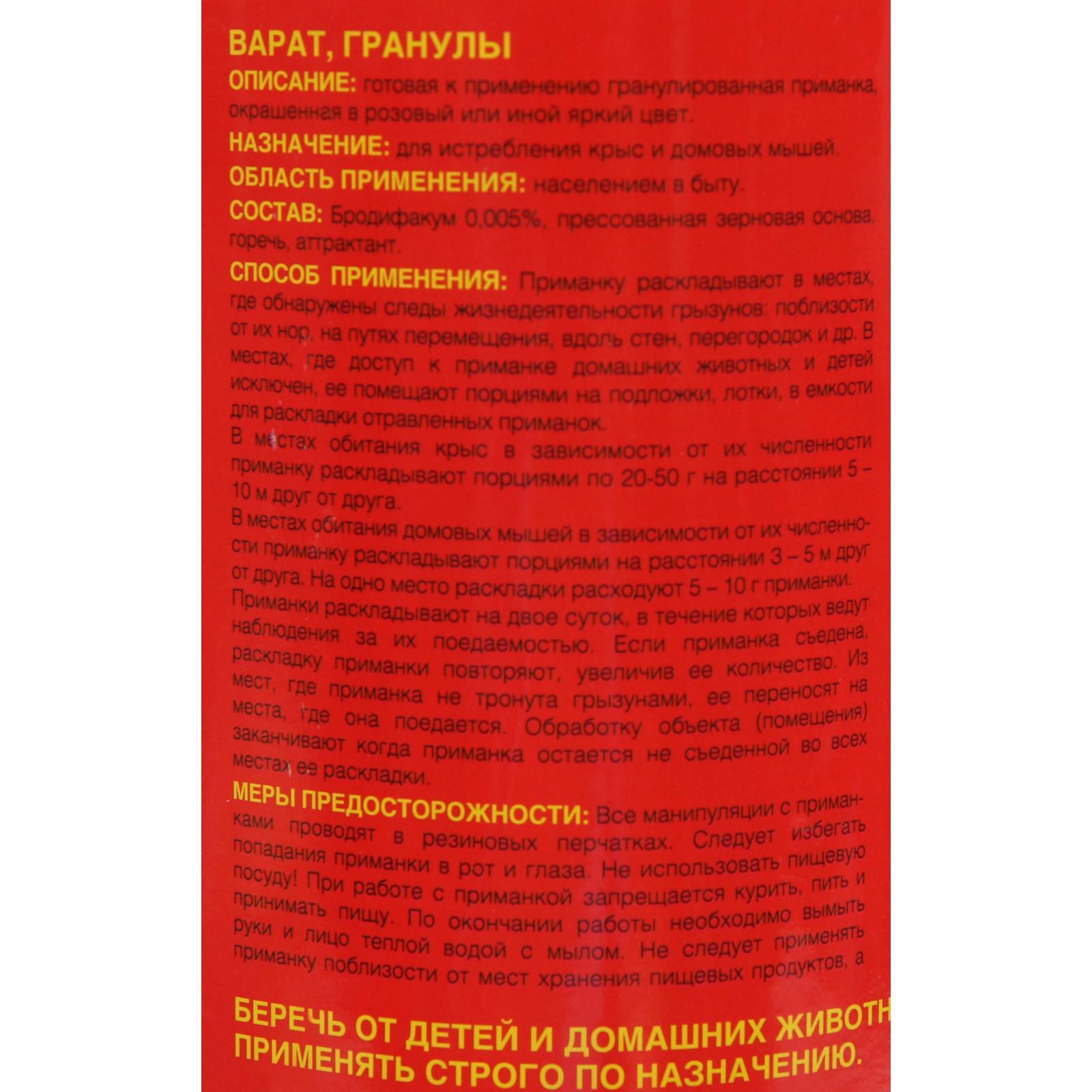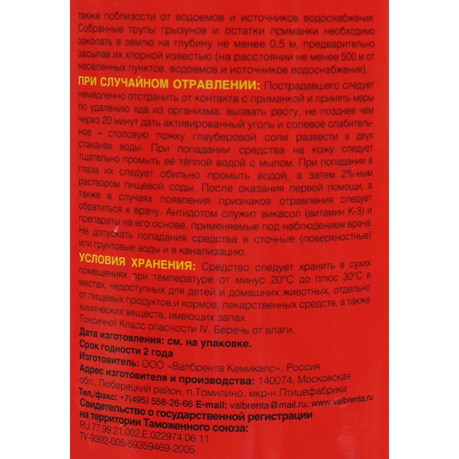 Гранулы от грызунов "антикрыс", аромат яблока, 800 гр. Готовая к применению гранулированная приманка, окрашенная в яркий цвет. Назначение: для истребления крыс и домовых мышей. Область применения: населением в быту. Способ применения: в местах, где доступ к приманке домашних животных и детей исключен, ее раскладывают в небольшие ёмкости или на подложках (листы плотной бумаги, картона, клеенки и т. д. ), что позволяет быстро и аккуратно собрать ее остатки после окончания работы. Для повышения безопасности и обеспечения сохранности приманки целесообразно раскладывать приманку в укрытия, прикормочные ящики и другие приспособления. Приманку раскладывают в местах, где обнаружены следы жизнедеятельности грызунов (поблизости от их нор, на путях перемещения, вдоль стен, перегородок и др). В местах обитания крыс в зависимости от их численности приманку раскладывают порциями по 3-5 брикетов на расстоянии 3 – 10 м друг от друга. В местах обитания домовых мышей в зависимости от их численности приманку раскладывают порциями по 1-2 брикета на расстоянии 2 – 5 м друг от друга. Приманки раскладывают на двое суток, в течение которых ведут наблюдения за их поедаемостью. Если приманка съедена, раскладку приманки повторяют, увеличив ее количество. Из мест, где приманка не тронута грызунами, ее переносят на места, где она поедается. Обработку объекта (помещения) заканчивают когда приманка остается не съеденной во всех местах ее раскладки. Состав: бродифакум 0, 005%, прессованная зерновая основа, битрекс (горечь), ароматизатор, аттрактант, краситель. Вес, г: 800 Область применения: От грызунов Вид средства: Гранулы Температурное ограничение: Нет  развернуть описание ▼