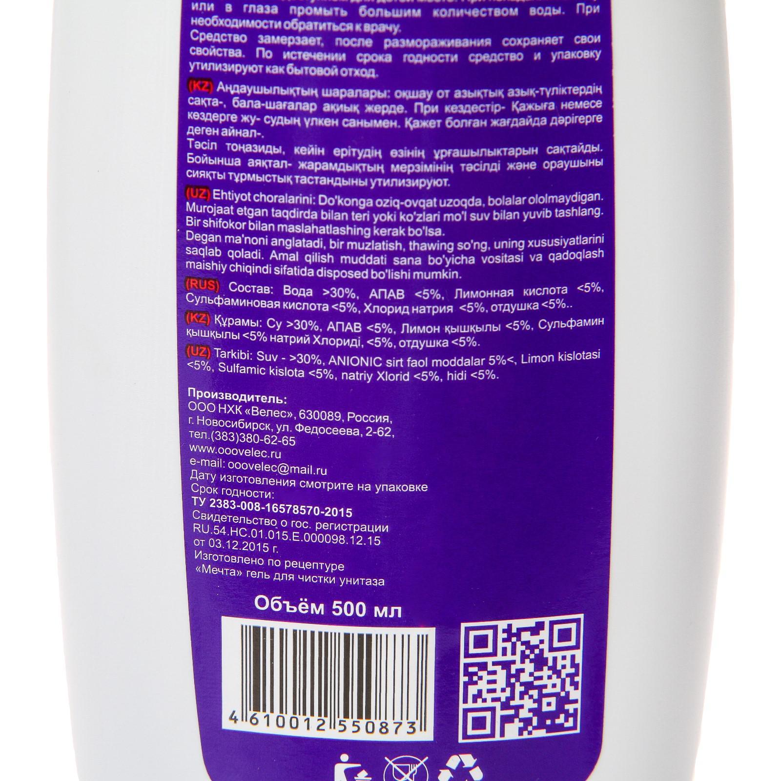 Гель для чистки унитаза, "сила мечты", 500мл. Гель для чистки унитаза, растворяет водный и мочевой камень, удаляет ржавчину. Придает блеск. Способ применения: распределить средство под ободок унитаза, потереть щеткой или губкой и смыть водой. Меры предосторожности: хранить отдельно от пищевых продуктов, в недоступном для детей месте. При попадании на кожу или в глаза промыть большим количеством воды. При необходимости обратиться к врачу. Средство замерзает, после размораживания сохраняет свои свойства. По истечении срока годности средство и упаковку утилизируют как бытовые отходы. Состав: вода 30%, АПАВ 5%, лимонная кислота 5%, сульфаминовая кислота 5%, хлорид натрия 5%, отдушка 5%. parts count: 0 Вес, г/Объём, мл: 500 Назначение: Для туалета Температурное ограничение: Нет Эффект: Очищение Эффект: Дезинфицирующее  развернуть описание ▼