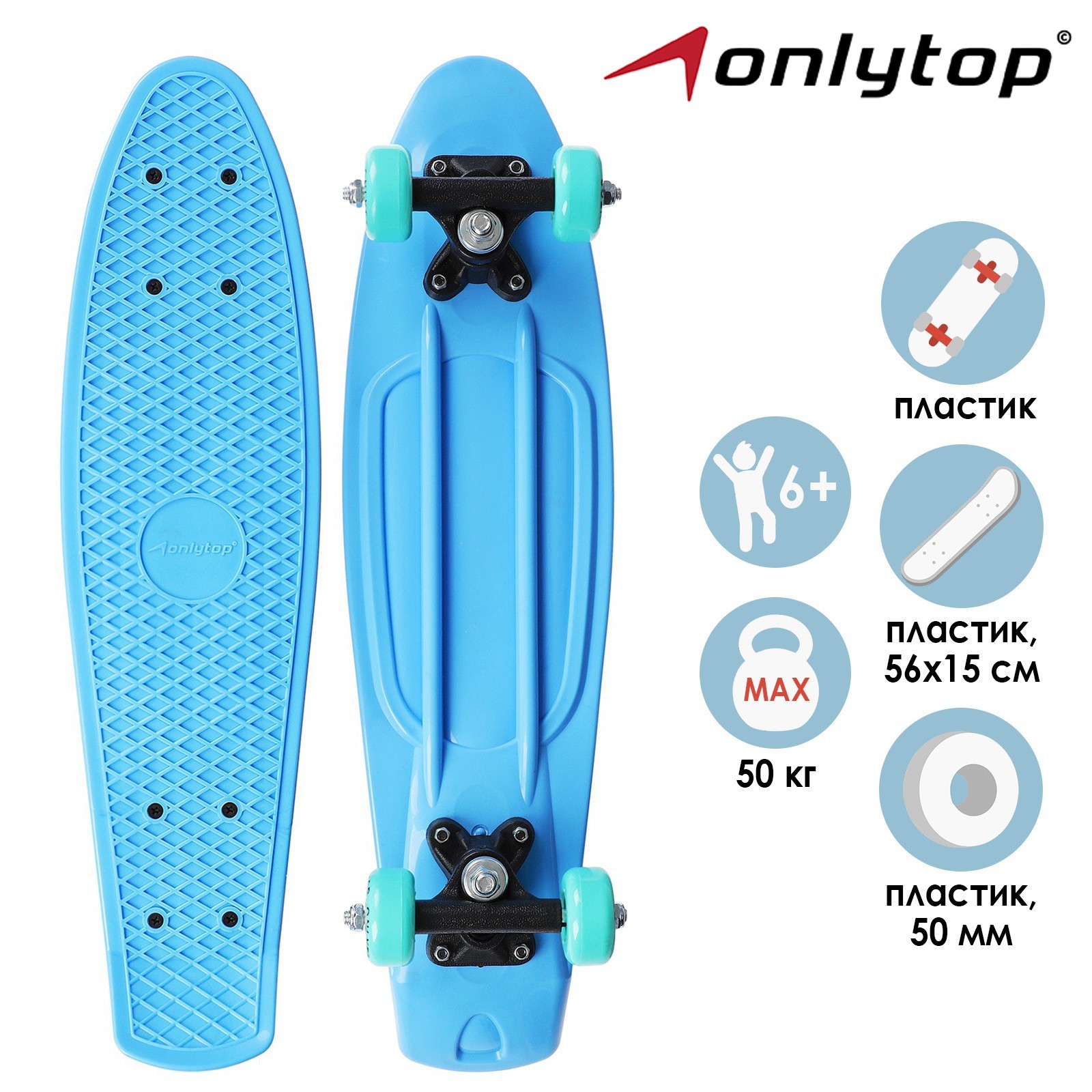 Пенниборд Onlytop, 56х15 см, колёса Pvc 50 мм, пластиковая рама, цвет светло-голубой