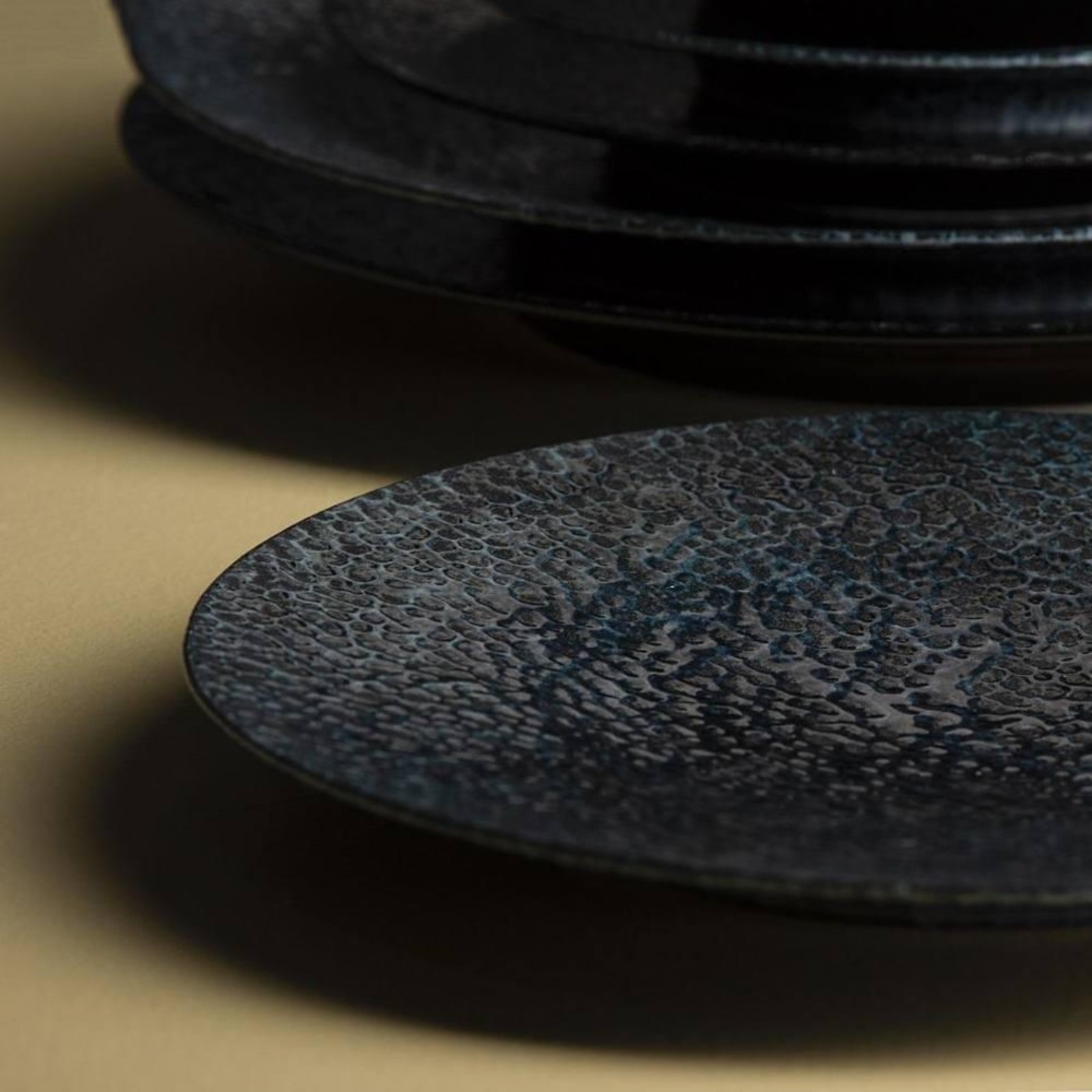 Посуда коллекции Moss имеет гладкую поверхность с маленькими ямочками, похожими на лунные кратеры. У изделий очень тонкие стенки, материал напоминает костяной фарфор, тарелки очень лёгкие и элегантные.