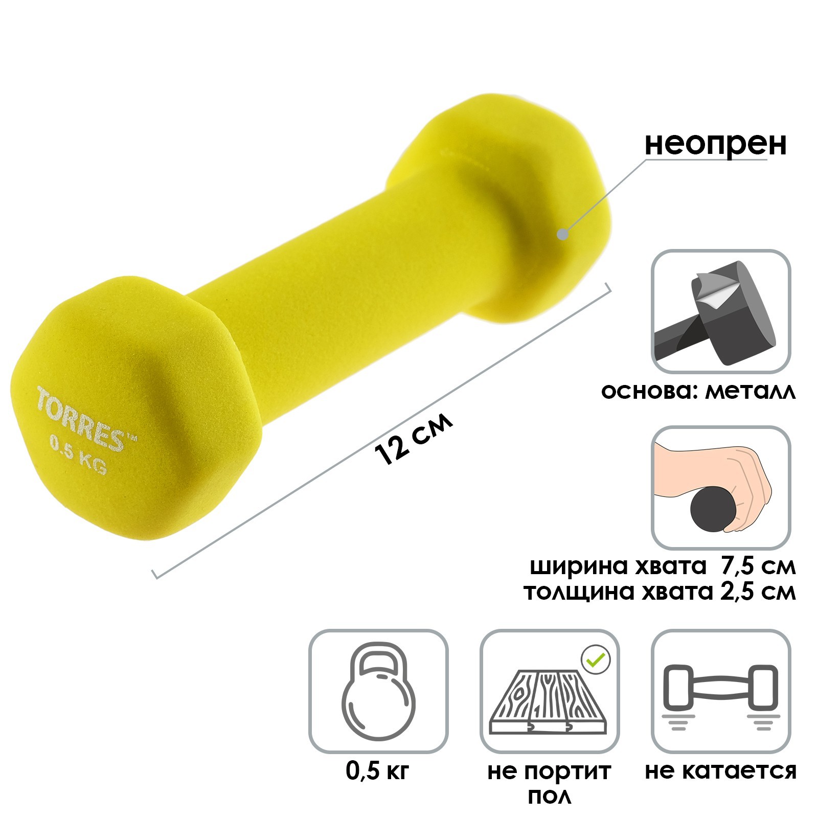 Гантель, 0,5 кг. Металлическая гантель TORRES покрыта неопреновой оболочкой. Неопреновое покрытие обладает отличными абсорбирующими свойствами, что позволяет ладоням оставаться сухими даже при самых интенсивных тренировках. Это обеспечивает хороший захват и препятствует выскальзыванию. Мягкое покрытие приятно на ощупь, что, в совокупности с удобной формой ручки, обеспечивает максимальный комфорт при занятиях. Шестигранная форма гантели с мягкими углами предотвращает качение, обеспечивает безопасность при занятиях и удобство хранения. Длина 12, 5 см. Цвет: Жёлтый parts count: 0 Вес, кг: 0.5 Толщина хвата, см: 2.5 Ширина хвата, см: 7.5 Защитное покрытие: Да Тип покрытия: Неопрен Тип гантели: Неразборная Форма дисков: Шестиугольные Наличие замков: Нет  развернуть описание ▼