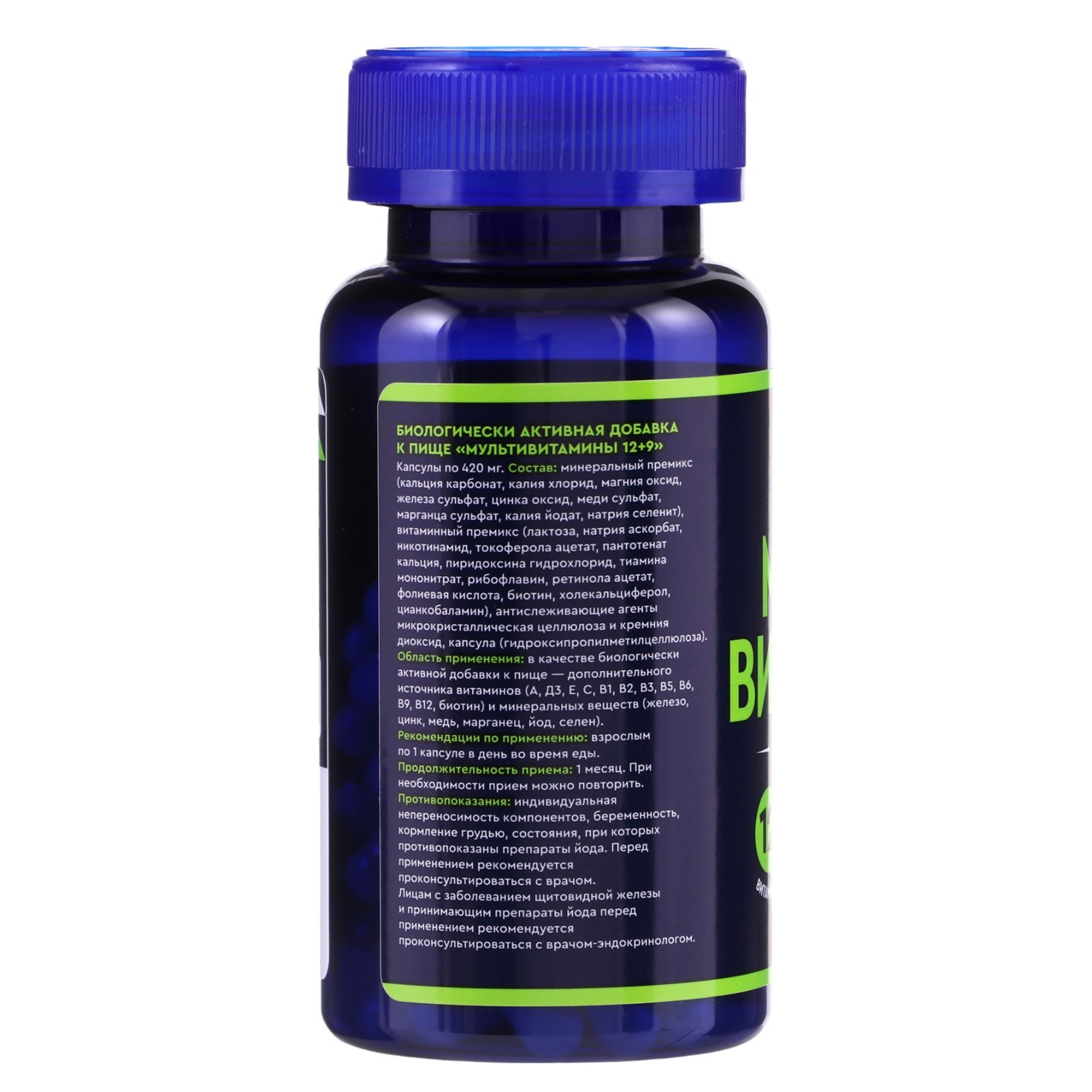 Мультивитамины 12 витаминов и 9 минералов, улучшение работы мозга и сопротивляемости стрессам, 60 капсул по 430 мг. Мультивитамины 12+9 - это полноценный мультивитаминно-минеральный комплекс для поддержания здоровья. Является источником 12 витаминов и 9 минеральных веществ. Повышает уровень энергии. Улучшает работу мозга. Снижает частоту заболеваний ОРВИ. Улучшает сопротивляемость стрессам. Положительно влияет на общее самочувствие. Способ употребления: взрослым по 1 капсуле в день во время еды. Продолжительность приема - 1 месяц. При необходимости прием можно повторить. Состав: минеральный премикс (кальция карбонат, калия хлорид, магния оксид, железа сульфат, цинка оксид, меди сульфат, марганца сульфат, калия йодат, натрия селенит), витаминный премикс (лактоза, натрия аскорбат, никотинамид, токоферола ацетат, пантотенат кальция, пиридоксина гидрохлорид, тиамина мононитрат, рибофлавин, ретинола ацетат, фолиевая кислота, биотин, холекальциферол, цианкобаламин), антислеживающие агенты микрокристаллическая целлюлоза и кремния диоксид, капсула (гидроксипропилметилцеллюлоза). Вспомогательные вещества: Гидроксипропилметилцеллюлоза. Микрокристаллическая целлюлоза. Кремния диоксид. Противопоказания: индивидуальная непереносимость компонентов, беременность, кормление грудью. Возраст до 18 лет. Для кого: Для женщины Для кого: Для мужчины Для кого: Унисекс В упаковке, шт.: 60 Вес, г/Объём, мл: 420 Вид: Витаминные комплексы Возраст: Для взрослых Температурное ограничение: Нет Назначение: Для энергии и тонуса организма Назначение: Для иммунной системы Назначение: Для нервной системы Назначение: При простуде и гриппе Группа витаминов: Поливитамины Форма выпуска: Капсулы Честный знак: Да Показания: Укрепление иммунитета Действие: Общеукрепляющее  развернуть описание ▼