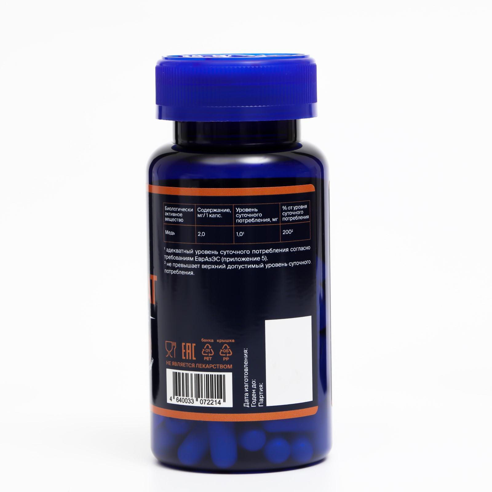Меди глюконат, витамины для волос и кожи, 60 капсул по 400 мг. Медь является необходимым микроэлементом для жизнедеятельности человеческого организма. Она играет важную роль в выработке гемоглобина и формировании эритроцитов, имеет большое значение в выработке энергии и работе иммунной системы. Медь участвует в выработке эластина и коллагена, поддерживая тонус, упругость, эластичность и молодость кожи. Медь предупреждает преждевременное старение, укрепляет волосы, сохраняет их цвет, препятствуя появлению седины. Недостаток меди может стать причиной серьезных проблем со здоровьем. В первую очередь это отражается на здоровье кожи, волос, провоцирует развитие анемии, хронической усталости. Способ применения: взрослым по 1 капсуле в день во время еды. Продолжительность приема: 1 месяц. При необходимости прием можно повторить. Возрастные ограничения: 18+. Состав: 1 вегетарианская капсула (суточная доза) содержит: Меди глюконата 14, 5 мг, в том числе меди 2 мг Вспомогательные вещества: гидроксипропилметилцеллюлоза (капсула), антислеживающие агенты микрокристаллическая целлюлоза, кальциевая соль стеариновой кислоты, кремния диоксид. Противопоказания: индивидуальная непереносимость компонентов, беременность, кормление грудью. Вес, г/Объём, мл: 0.4 В упаковке, шт.: 60 Температурное ограничение: Нет Назначение: Для кожи, волос и ногтей Назначение: Антивозрастной Назначение: Для иммунной системы Форма выпуска: Капсулы Честный знак: Да Микроэлементы: Cu (медь)  развернуть описание ▼