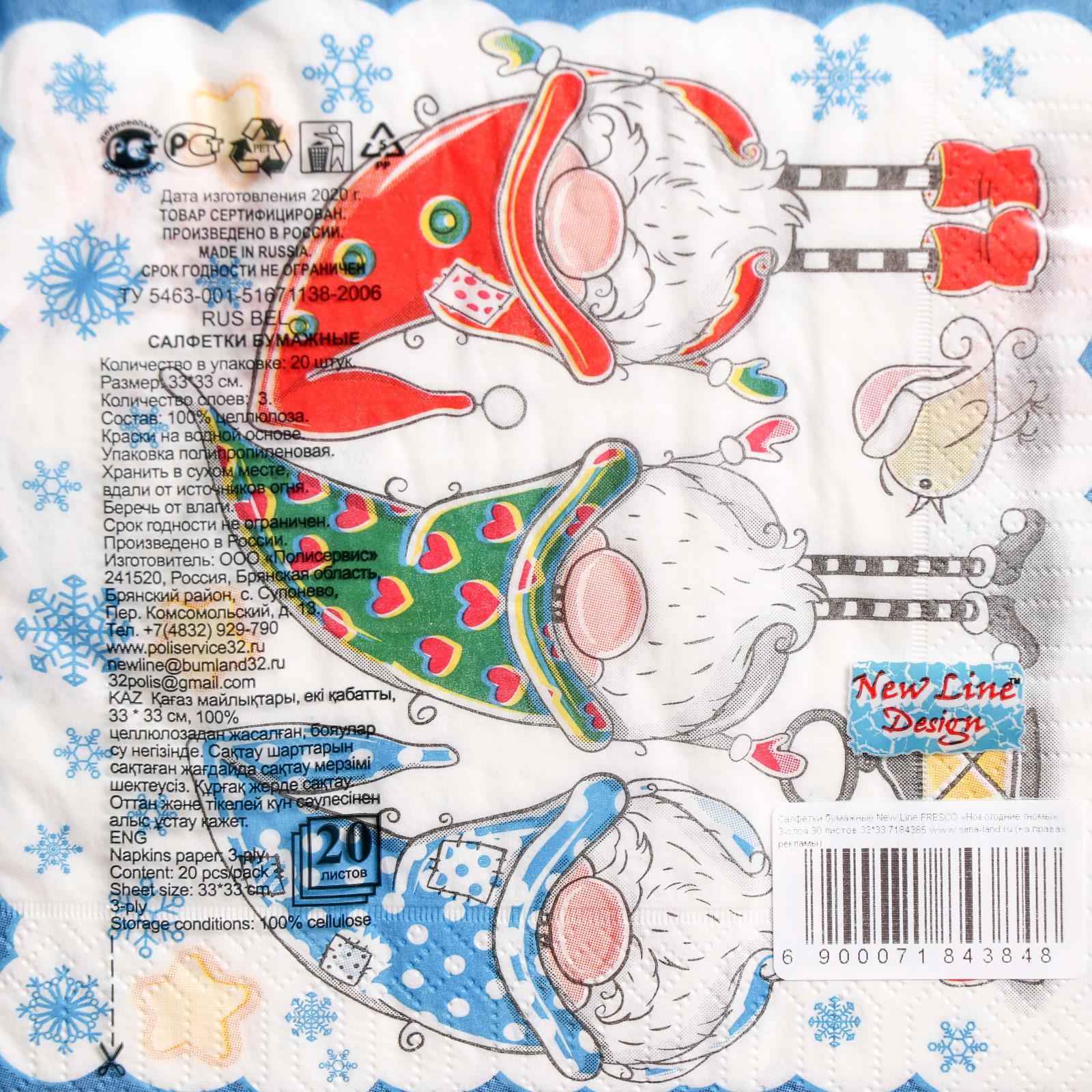 Новогодние салфетки бумажные New Line Fresco «новогодние гномы», 33х33 см, 3 слоя