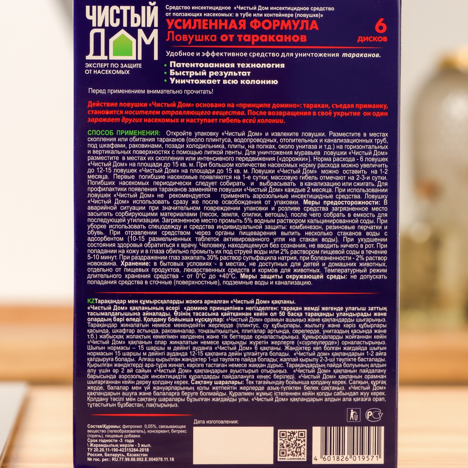 Ловушка инсектицидная усиленного действия от тараканов "чистый дом", 6 шт. Ловушка повышенной эффективности. Результат за 3 дня, новая конструкция ловушки, безопасно для животных. Приманка находится внутри пластикового контейнера, поэтому недоступна для домашних животных. Клейкая лента (входит в комплект) позволяет разместить ловушку можно разместить на любой поверхности. Уничтожает всю колонию. Способ применения: откройте упаковку и извлеките ловушки. Разместите в местах скопления или обитания тараканов (около плинтуса, водопроводных, отопительных и канализационных труб, под шкафами, раковинами, позади холодильника, плиты, на полках, около унитаза и т. д. ) на горизонтальных и вертикальных поверхностях с помощью липкой ленты. Для уничтожения муравьев ловушки «Чистый Дом» разместите в местах их скопления или интенсивного передвижения («дорожки»). Норма расхода: 6 ловушек «Чистый Дом» на площади до 15 кв. м. При большом количестве насекомых норму расхода можно увеличить до 12-15 ловушек «Чистый Дом» на площади до 15 кв. м. Срок применения: ловушки можно оставить на 1-2 месяца. Первые погибшие насекомые появляются на 1-е сутки, массовую гибель отмечают на 2-3-и сутки. Погибших насекомых периодически следует собирать и выбрасывать в канализацию или сжигать. Для профилактики появления тараканов заменяйте ловушки «Чистый Дом» каждые 2 месяца. При использовании ловушек «Чистый Дом» не рекомендуется применять аэрозольные инсектицидные средства. Ловушку «Чистый Дом» использовать сразу же после освобождения от упаковки. Состав: фипронил 0, 05%, связывающее вещество, консервант, битрикс (горечь) пищевые добавки. Вид средства: Ловушка Температурное ограничение: Нет  развернуть описание ▼