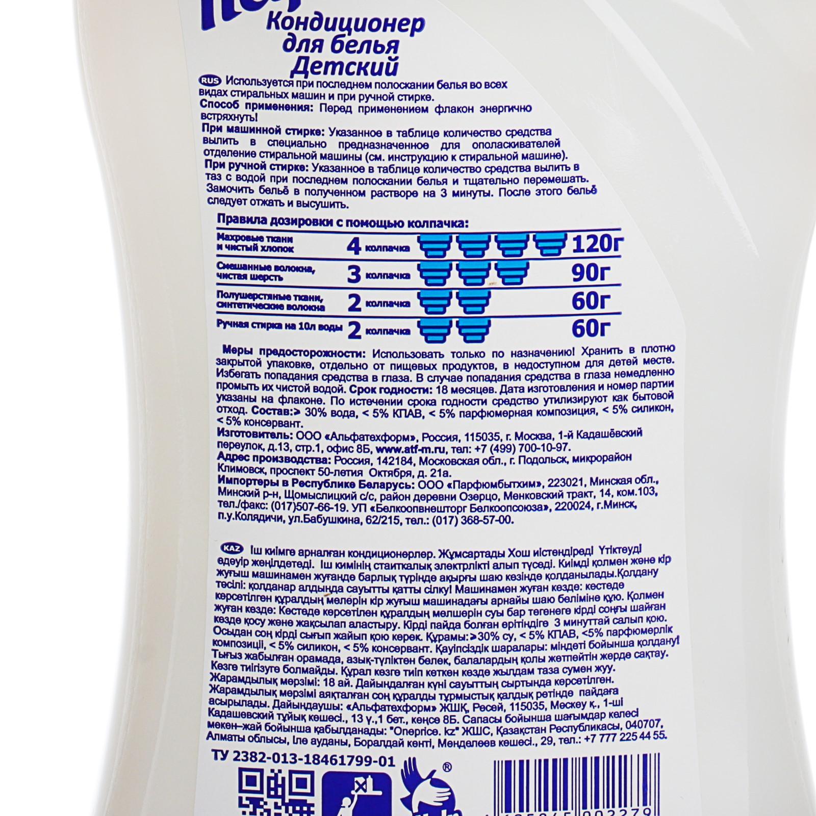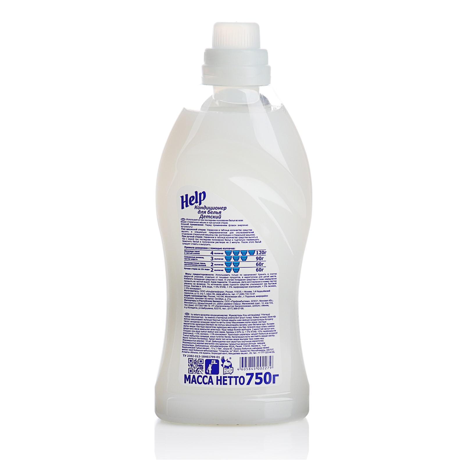 Кондиционер для белья help "детский", 750 мл. Кондиционер для белья концентрированный используется при последнем полоскании белья во всех видах стиральных машин и при ручной стирке, не требует предварительного разбавления водой. Подходит для всех видов тканей. Имеет изысканный аромат и антистатический эффект. Облегчает глаженье. Уход за волокнами ткани. придает ткани мягкость и приятный аромат;нейтрализует негативное действие стирального порошка на организм человека;придает антистатические свойства;уменьшает сминаемость;добавление кондиционера при полоскании белья улучшает процесс глажения;подходит для любых тканей. Состав: 30% вода, 5% кпав, 5% парфюмерная композиция, 5% консервант, 5% краситель, силикон. Объём, л: 0.75 Назначение: Для детского белья Особенности средства: Антистатический эффект  развернуть описание ▼