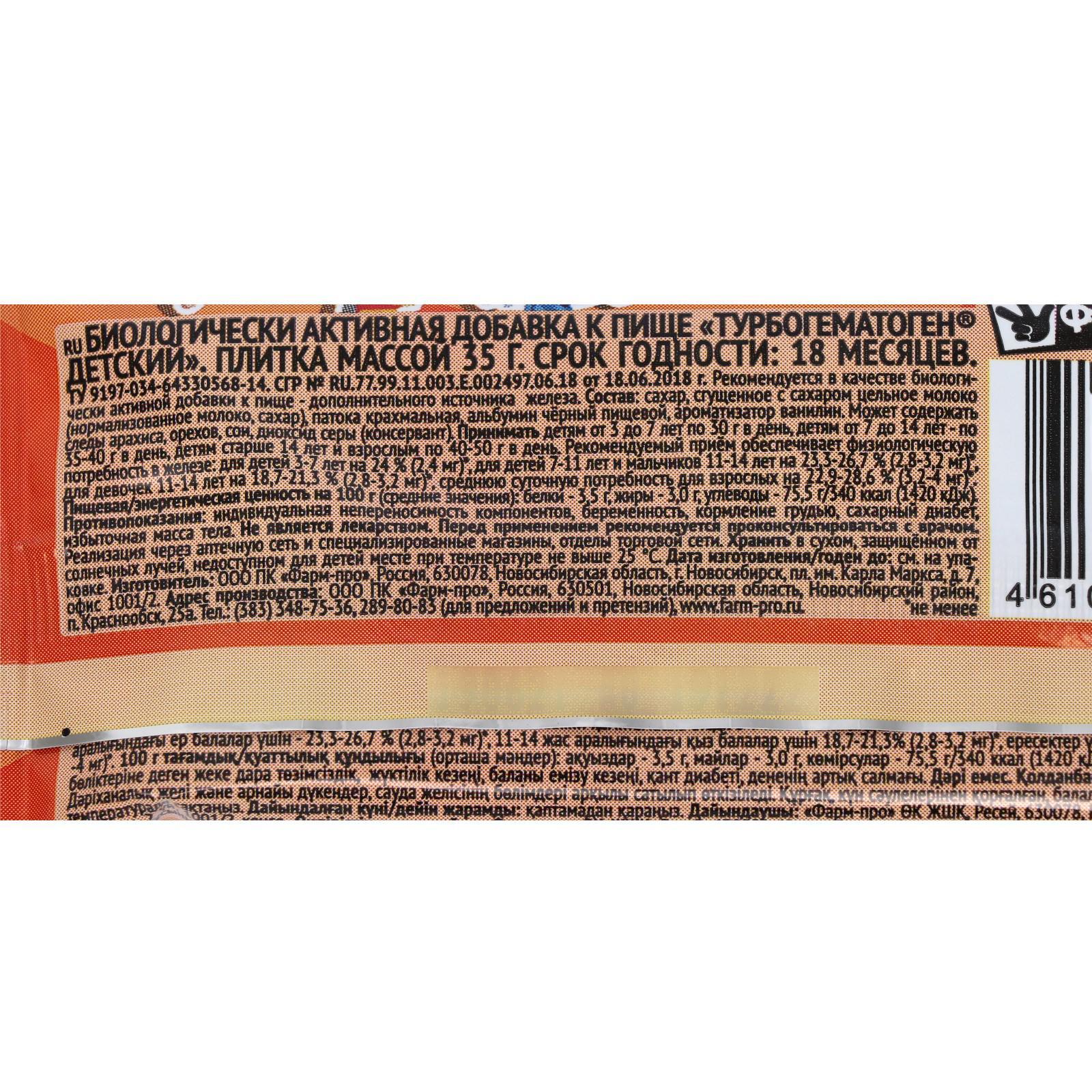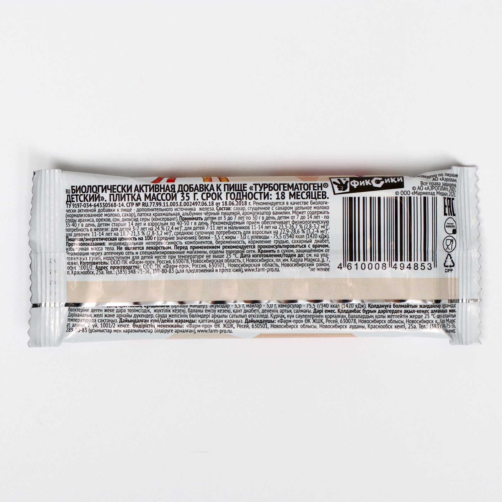 Гематоген детский турбо, фиксики, 35 г. Рекомендуется в качестве биологически активной добавки к пище – дополнительного источника железа. Классический детский гематоген. Рекомендован для детей с 3-х лет. Дополнительный источник железа для растущего детского организма. Классический гематоген для детей с 3-х лет. Источник железа в органической форме. Рекомендуется к применению в качестве дополнительного источника железа в легкодоступной для детского организма форме. Сварен на настоящей сгущенке. Источник нужного детям железа. Способ употребления: детям от 3 до 7 лет по 30 г в день, детям от 7 до 14 лет – по 35 - 40 г в день, детям старше 14 лет и взрослым по 40 - 50 г в день. Рекомендуемый приём обеспечивает физиологическую потребность в железе: для детей 3-7 лет на 24 % (2, 4 мг), для детей 7-11 лет и мальчиков 11-14 лет на 23, 3 -26, 7 % (2, 8 - 3, 2 мг), для девочек 11-14 лет на 18, 7 – 21, 3% (2, 8 -3, 2 мг), среднюю суточную потребность для взрослых на 22, 9 – 28, 6 % (3, 2 – 4 мг). Состав: сахар, молоко цельное сгущённое с сахаром (нормализованное молоко, сахар), патока крахмальная, альбумин чёрный пищевой, ароматизатор ванилин Противопоказания: индивидуальная непереносимость компонентов продукта, беременность и кормление грудью, сахарный диабет, избыточная масса тела. Жиры, г: 3 Белки, г: 3.5 Вес нетто, г: 35 Углеводы, г: 75.5 Энергетическая ценность, ккал: 340 Температурное ограничение: Нет Назначение: Для детей Назначение: Для энергии и тонуса организма Форма выпуска: Батончик Честный знак: Да  развернуть описание ▼