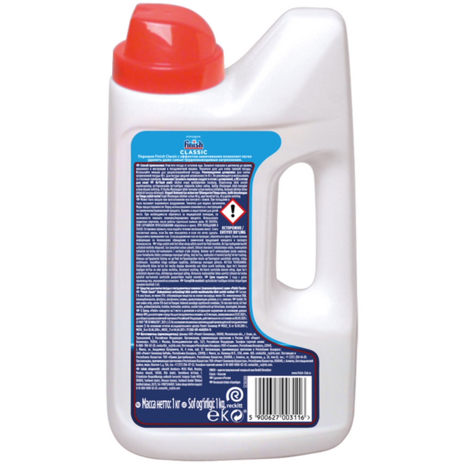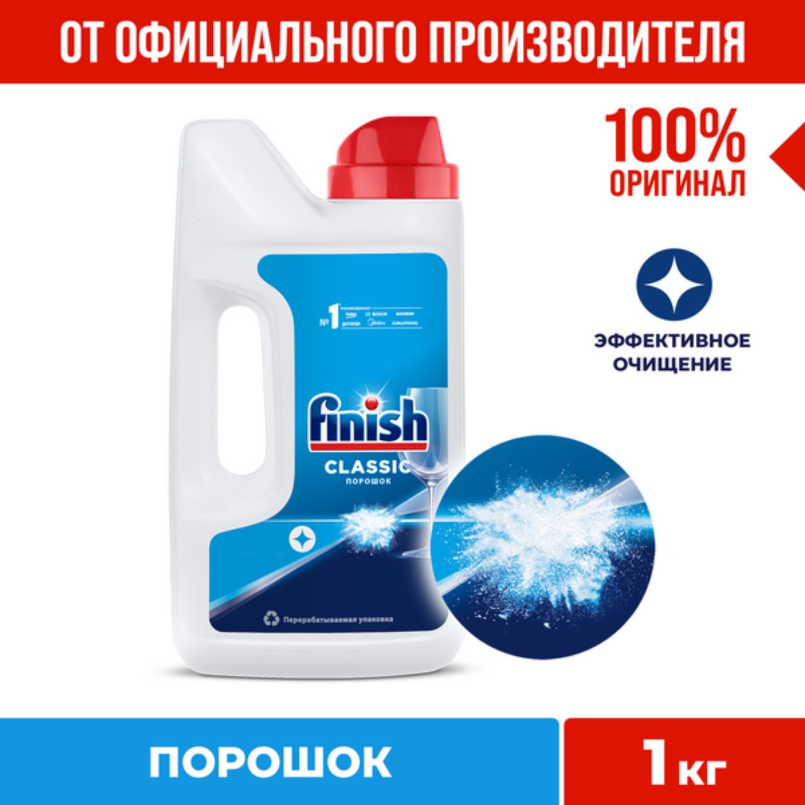 Порошок для посудомоечных машин finish с эффектом замачивания, 1 кг. Порошок Finish Classic – удобный формат средства для посудомоечной машины, который позволяет вам самостоятельно дозировать продукт, исходя из степени загрязнения и заполненности вашей посудомойки. Finish Classic с эффектом замачивания позволяет легко удалить даже самые трудновыводимые загрязнения. Экономичное решение для чистоты Вашей посуды. При использовании порошка Finish Classic для достижения максимального результата и при очень жесткой воде рекомендуется применение специальной соли Finish и ополаскивателя Finish. Состав: менее 5%: кислородосодержащий отбеливатель, неионогенные ПАВ; поликарбоксилаты, фосфонаты, энзимы, ароматизатор, лимонен. Вес, кг: 1  развернуть описание ▼