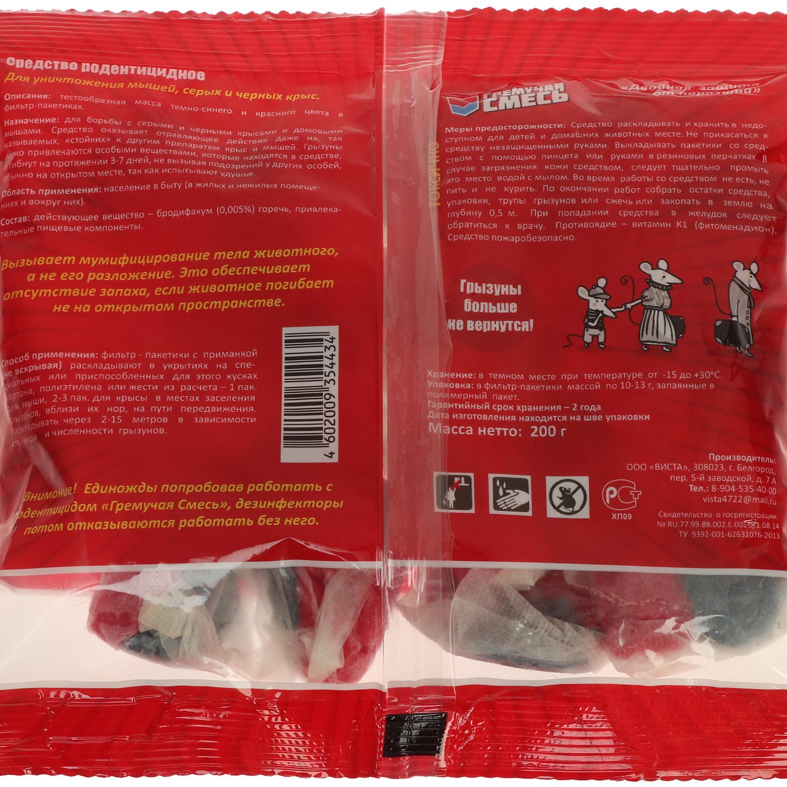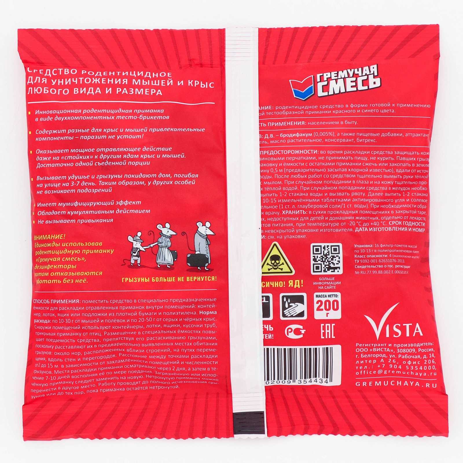Тесто-брикеты от грызунов "гремучая смесь", пакет, 200 г. Гремучая смесь – это приманка для мышей, крыс и других грызунов. Которая позволяет эффективно справиться с грызунами как в домашних условиях, так и в подсобных, складских помещениях и общественных зданиях. Основное действующее вещество - бродифакум (0, 005%) – это антикоагулянт, который нарушает свертываемость крови. Грызуны съедают летальную дозу уже после первого подхода к корму, и затем любое внешнее или внутреннее повреждение приводит к гибели. Раскладывайте приманку, не вынимая из бумажных фильтр-пакетов. Они пропускают запах, привлекая вредителей, но при этом не поддаются действию влажности и других разрушающих факторов, поэтому их можно использовать как в помещении, так и снаружи здания. Перед работой наденьте защитные перчатки и не допускайте попадания токсинов на кожу и в глаза. Если в доме есть дети и домашние животные, устанавливайте приманку в недоступных для них местах, например, внутри приманочных домиков. Состав: бродифакум 0, 005%, пищевая основа, гореч, краситель. Срок годности: 24 месяца от даты изготовления. Вес, г: 200 Область применения: От грызунов Вид средства: Тесто-брикет Температурное ограничение: Нет  развернуть описание ▼